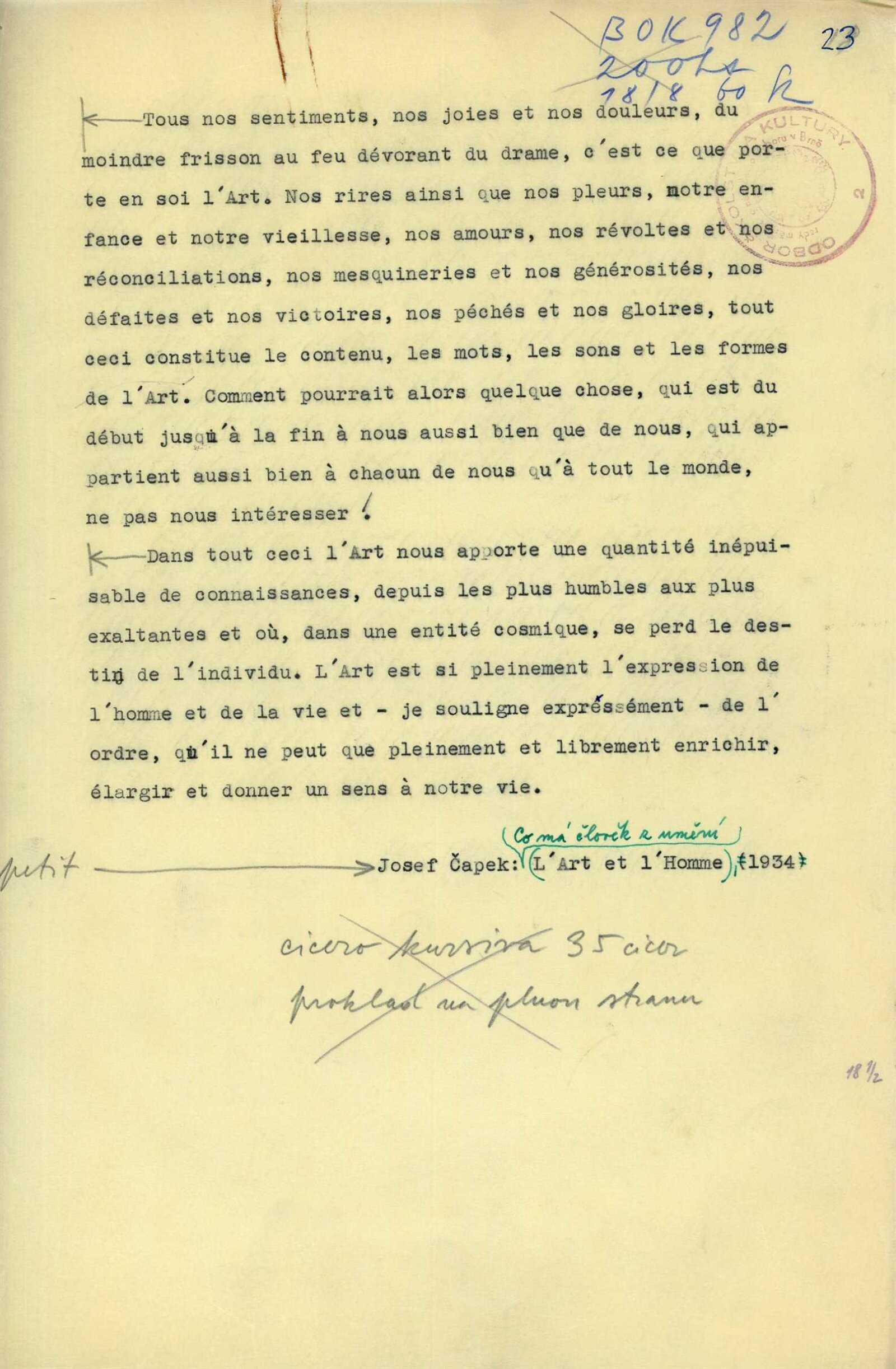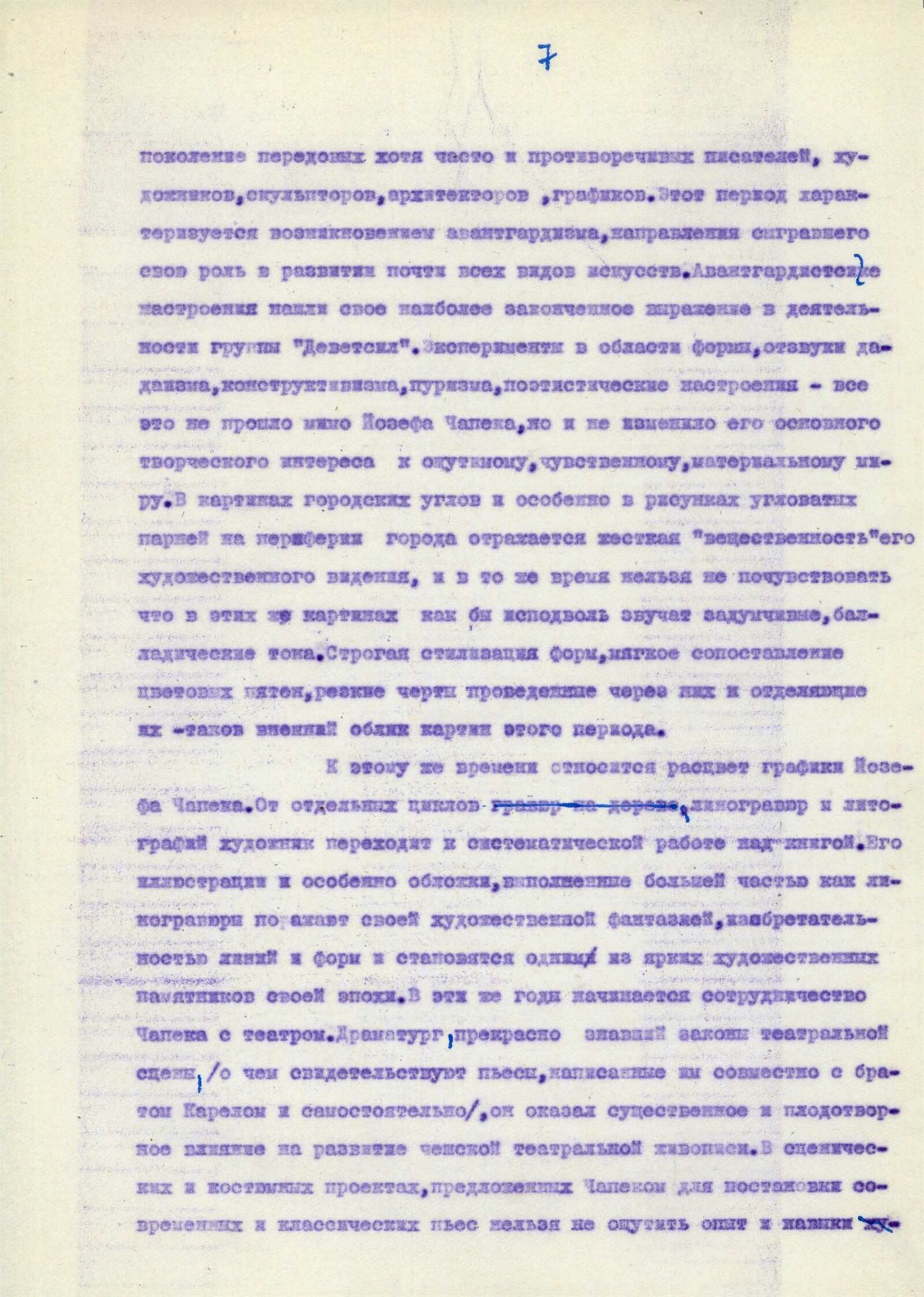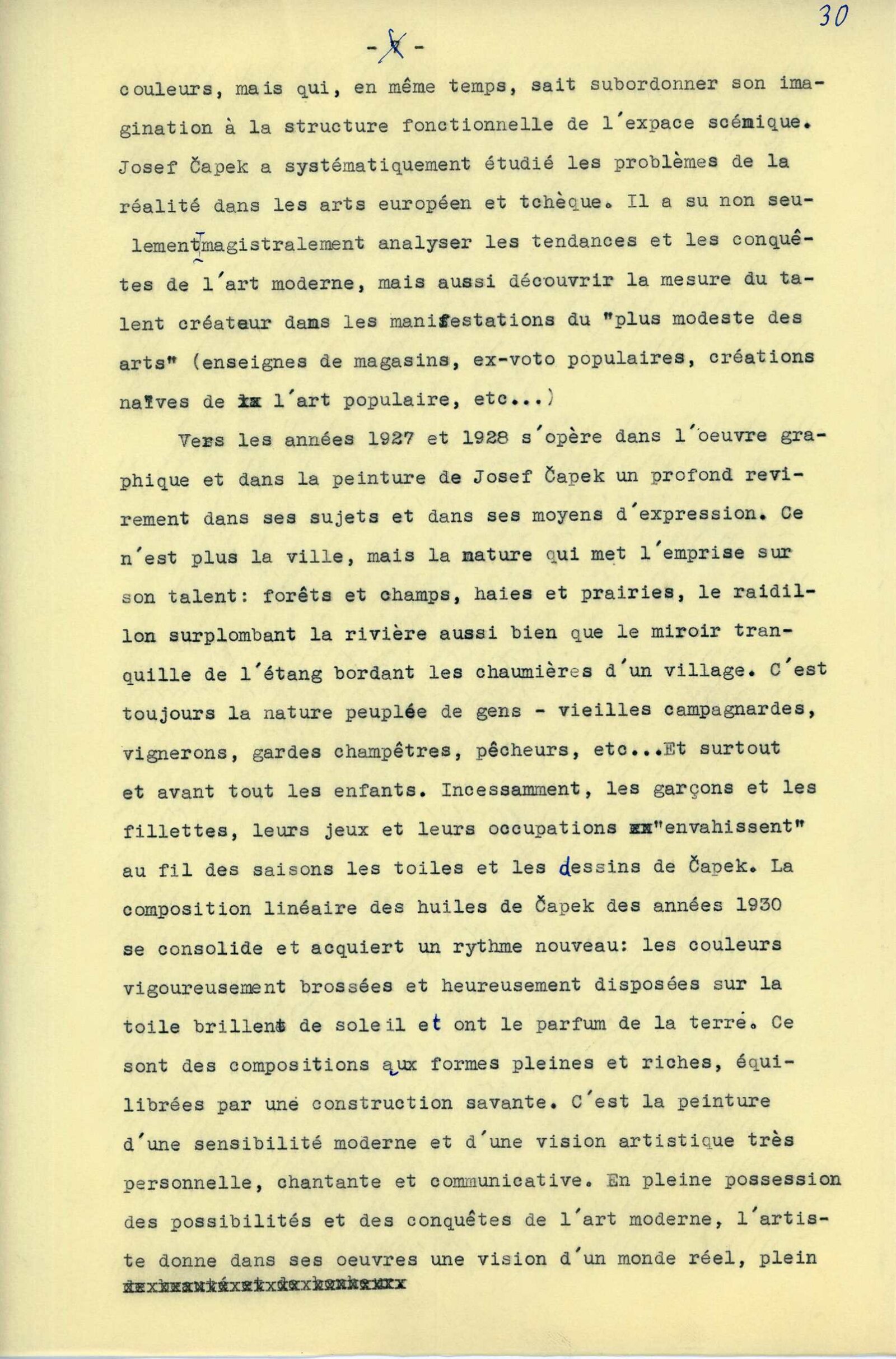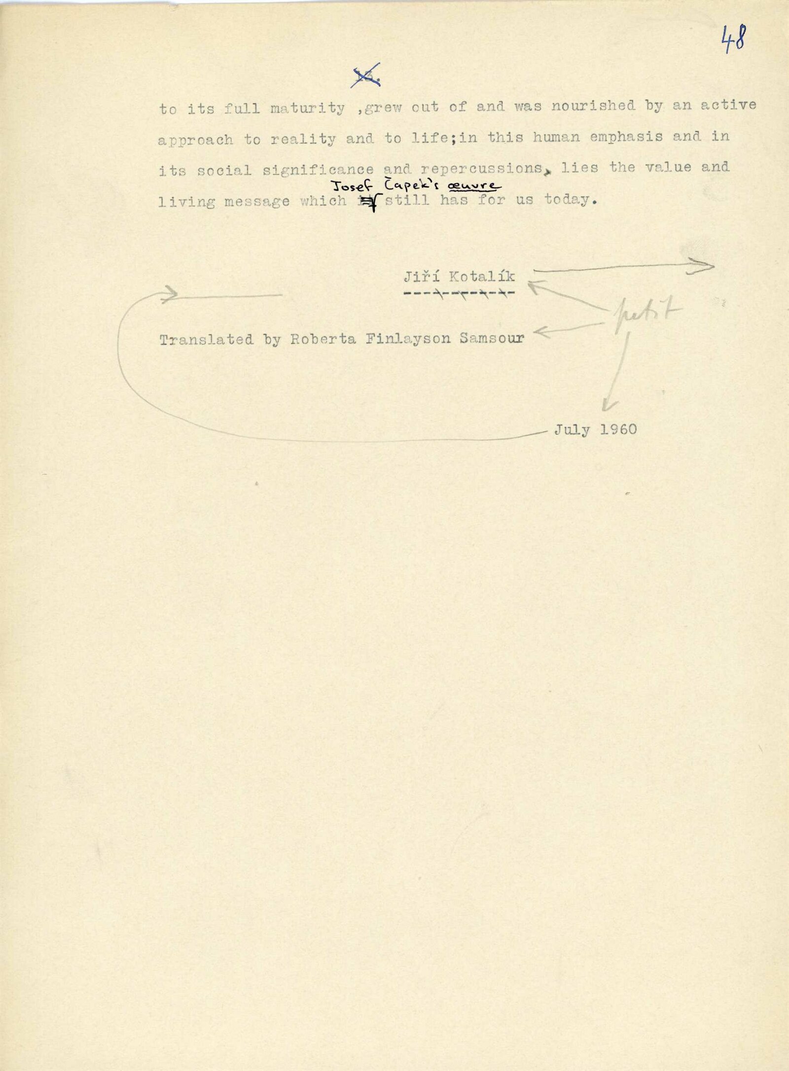 pozvánka, katalog, text přivítání na vernisáži (Gerta Pospíšilová), texty k výstavě (básně Josefa Čapka, L. Stehlíka, texty ČJ, AJ, FJ, RJ), popisky, seznam exponátů, fotografie děl pro katalog, foto Jiřího Kotalíka z vernisáže, seznam zápůjček (dokumenty, knihy, předměty, seznam knih Čapkem graficky upravovaných), korespondence (o rozpočtu s SČSVU a o financování výstavy, provozní korespondence, dopisy Dr. Slavíka, M. Míčka), seznam adres pro pozvánky, zápisy z přípravných schůzí a jednání s Jiřím Kotalíkem, koncepce výstavy a její členění, rozpočet, přihlášky pro výstavu, potvrzení o převzetí děl, reverzy, pojištění výstavy, zápisy z jednání a nástin výstavy (Jiří Kotalík), smlouvy o dílo (překlady, instalace atd.), rozpočet, recenze v tisku, podpisová kniha z výstavy (asi 60 stran)