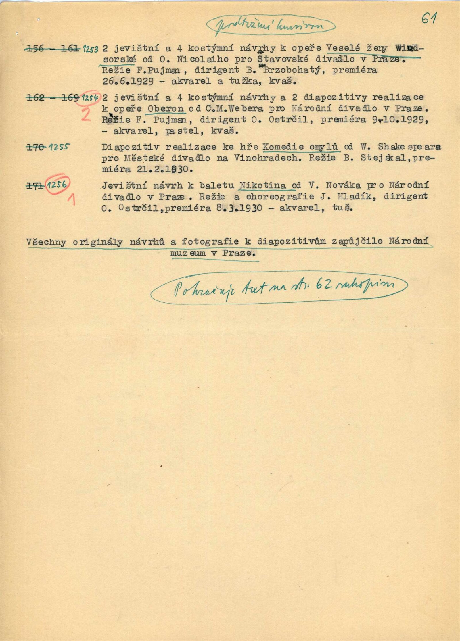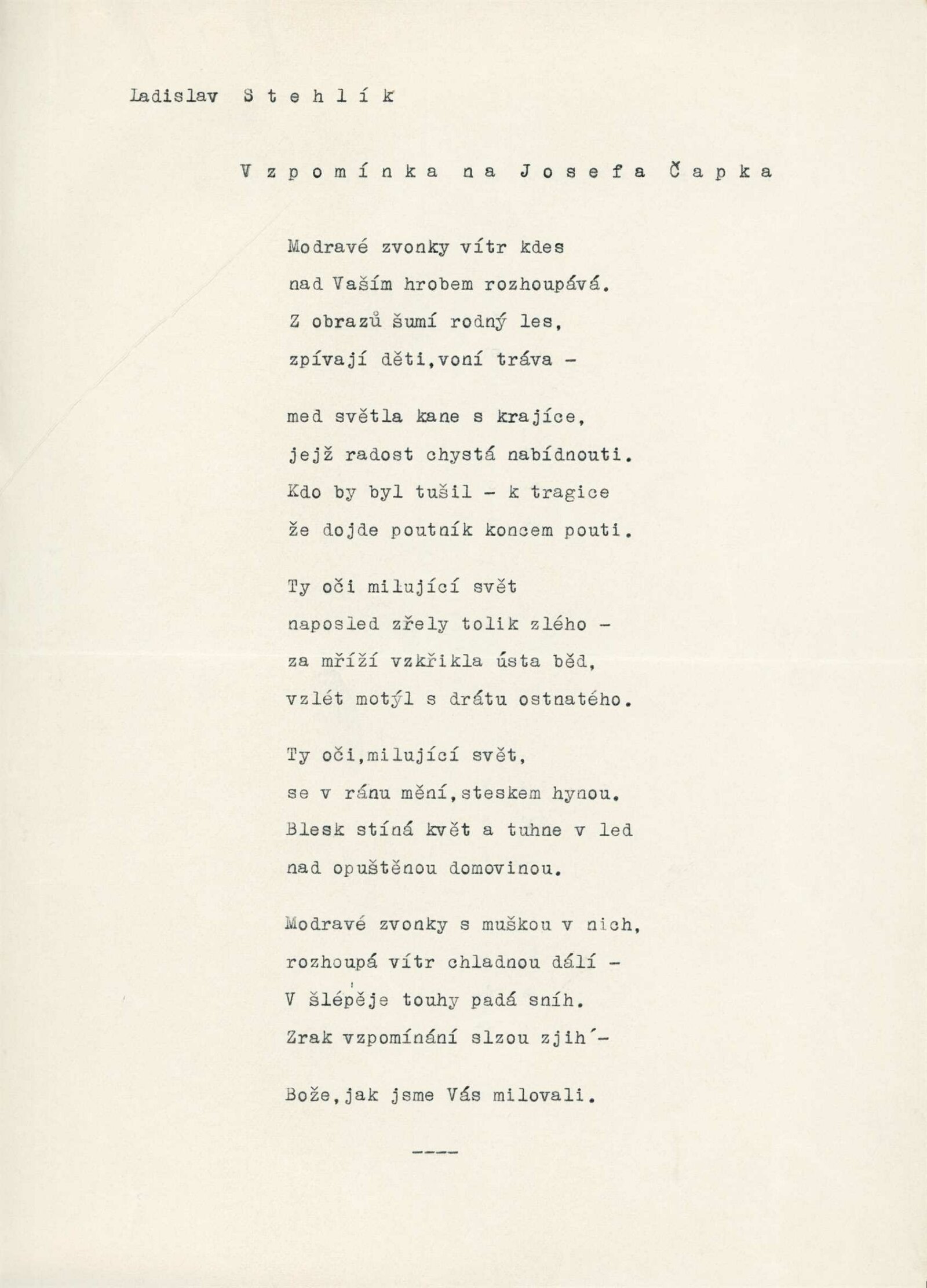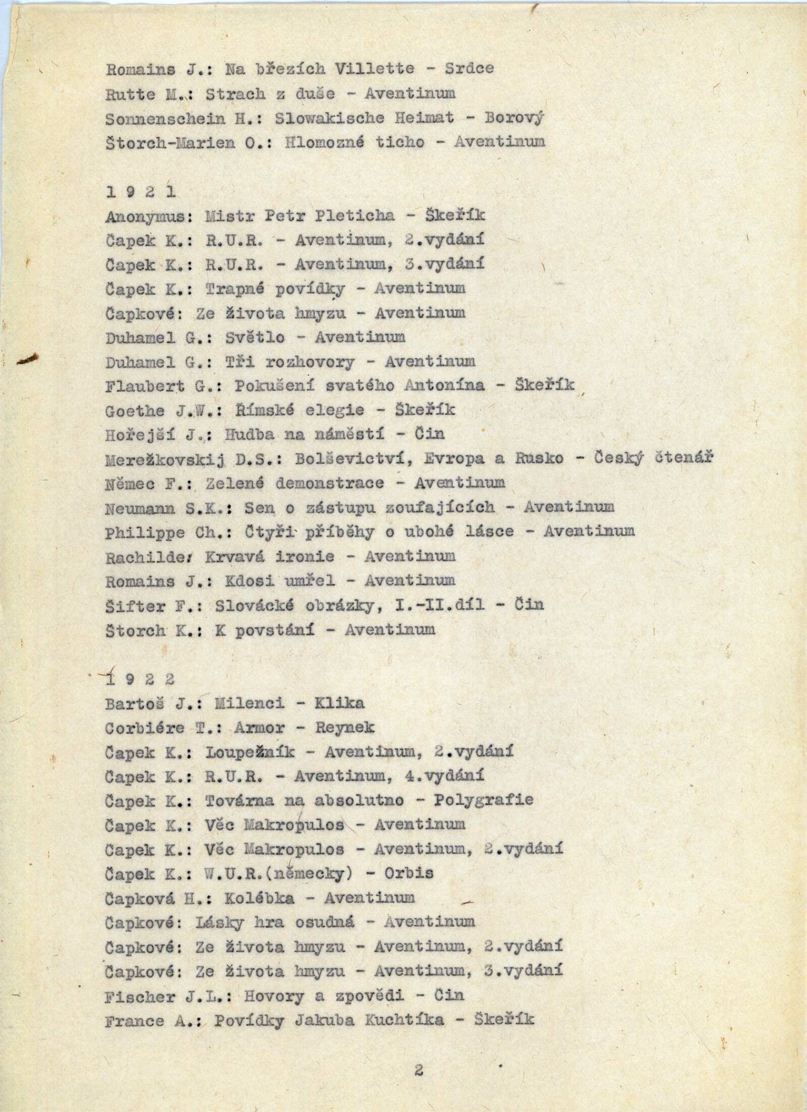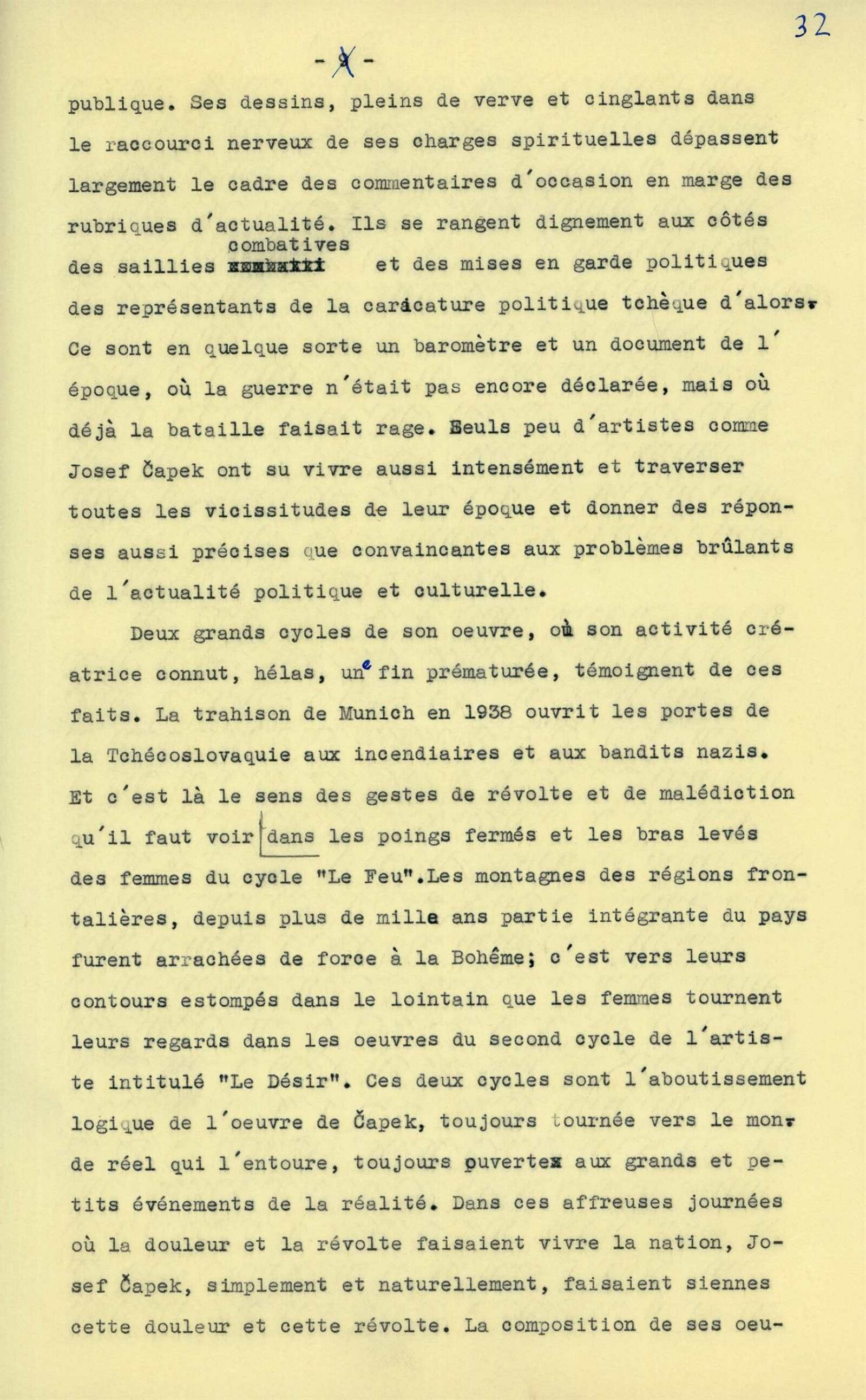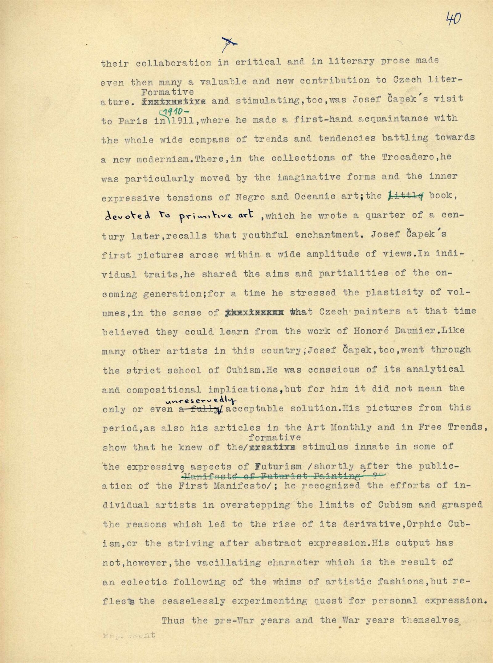 pozvánka, katalog, text přivítání na vernisáži (Gerta Pospíšilová), texty k výstavě (básně Josefa Čapka, L. Stehlíka, texty ČJ, AJ, FJ, RJ), popisky, seznam exponátů, fotografie děl pro katalog, foto Jiřího Kotalíka z vernisáže, seznam zápůjček (dokumenty, knihy, předměty, seznam knih Čapkem graficky upravovaných), korespondence (o rozpočtu s SČSVU a o financování výstavy, provozní korespondence, dopisy Dr. Slavíka, M. Míčka), seznam adres pro pozvánky, zápisy z přípravných schůzí a jednání s Jiřím Kotalíkem, koncepce výstavy a její členění, rozpočet, přihlášky pro výstavu, potvrzení o převzetí děl, reverzy, pojištění výstavy, zápisy z jednání a nástin výstavy (Jiří Kotalík), smlouvy o dílo (překlady, instalace atd.), rozpočet, recenze v tisku, podpisová kniha z výstavy (asi 60 stran)