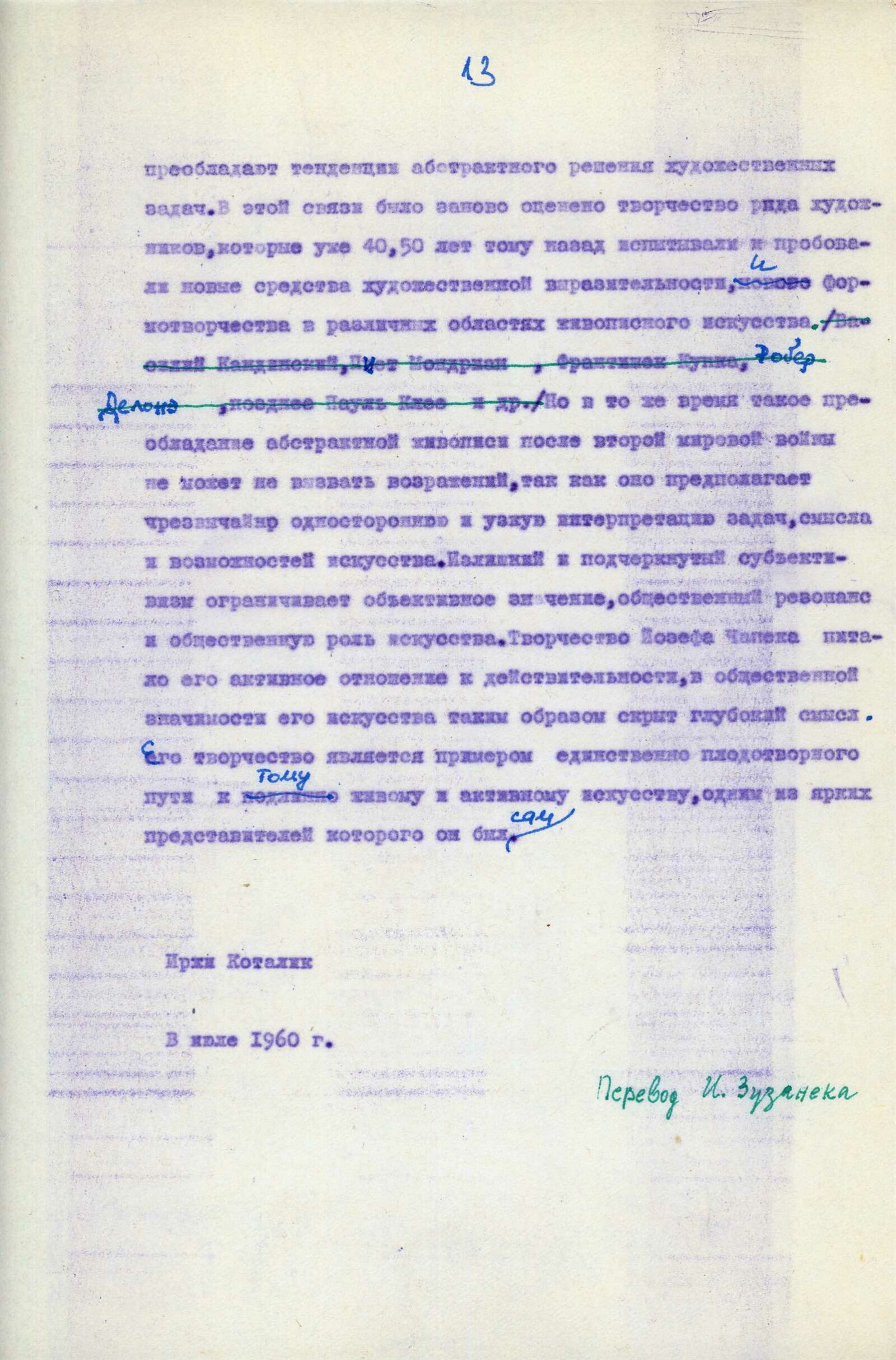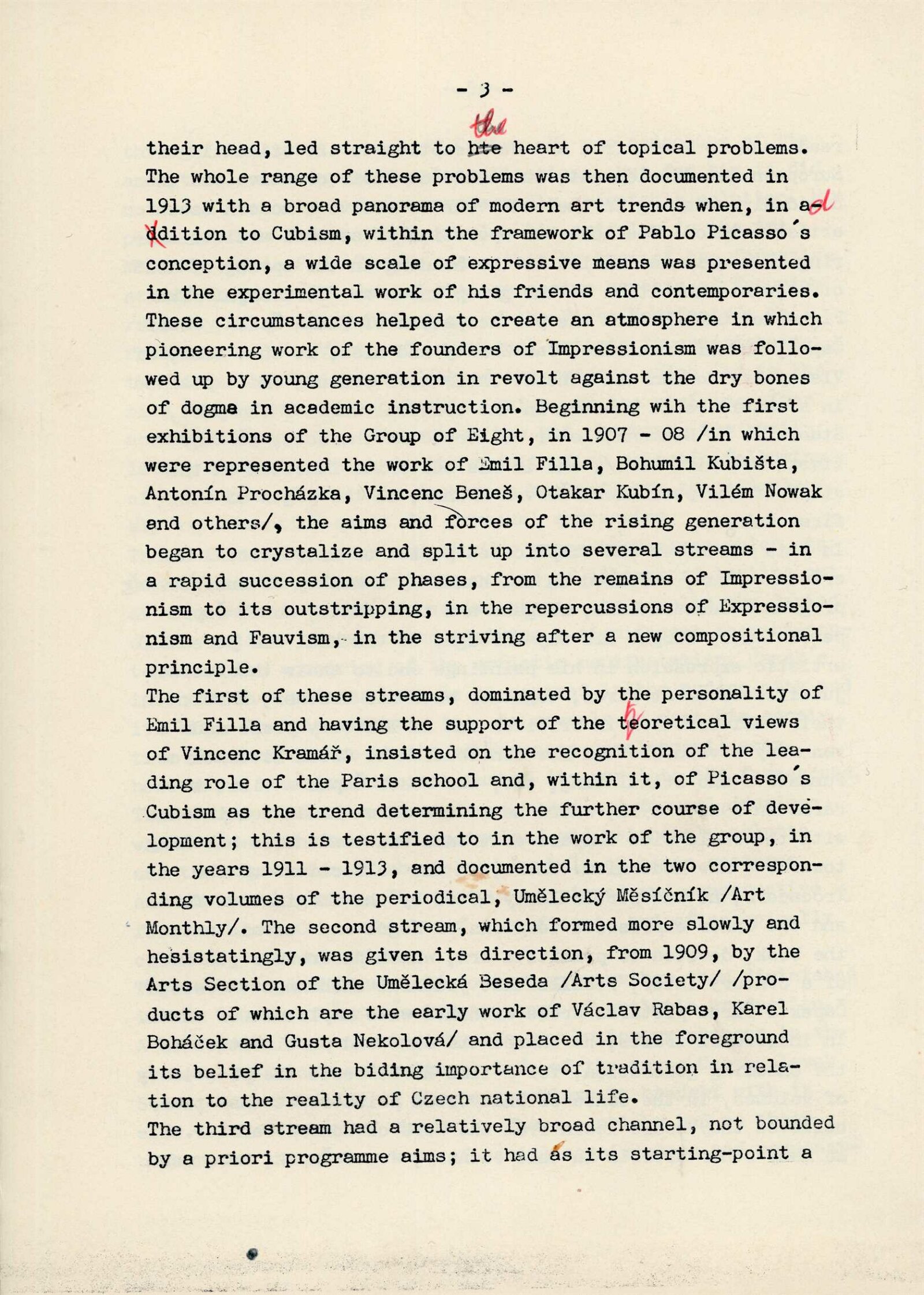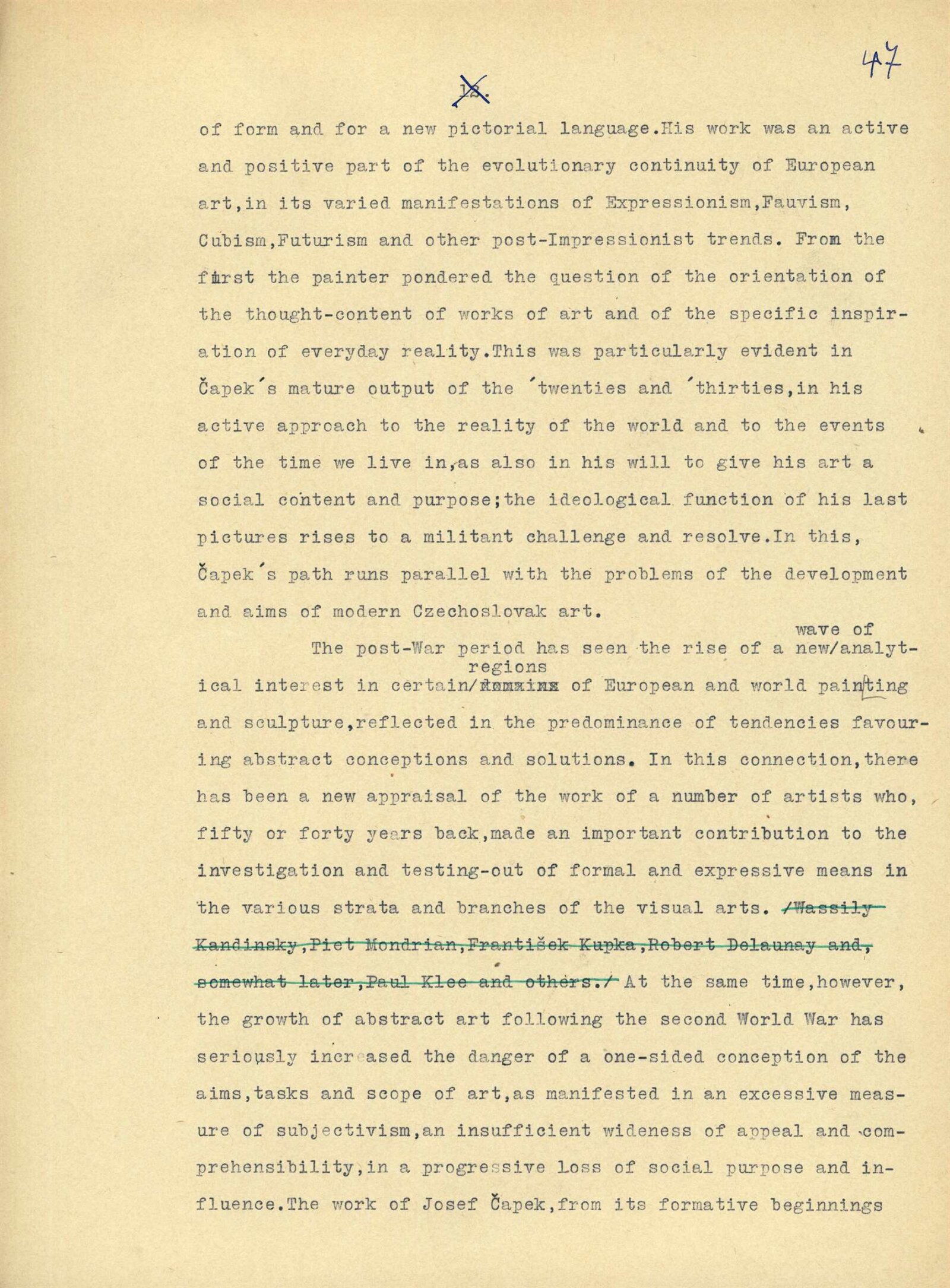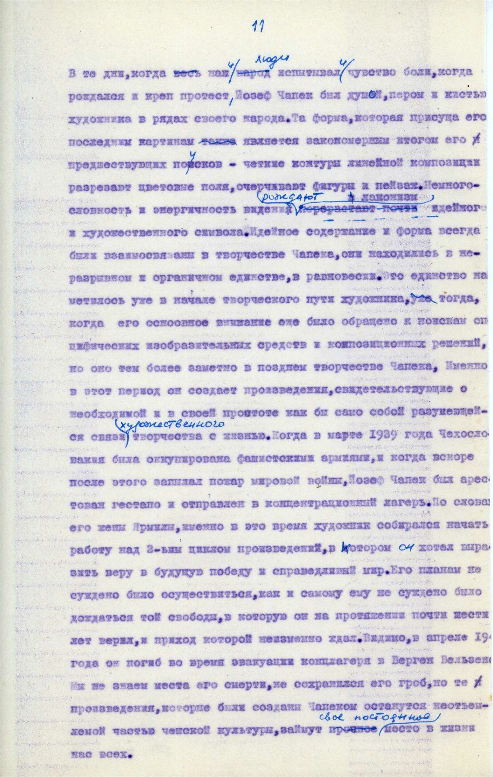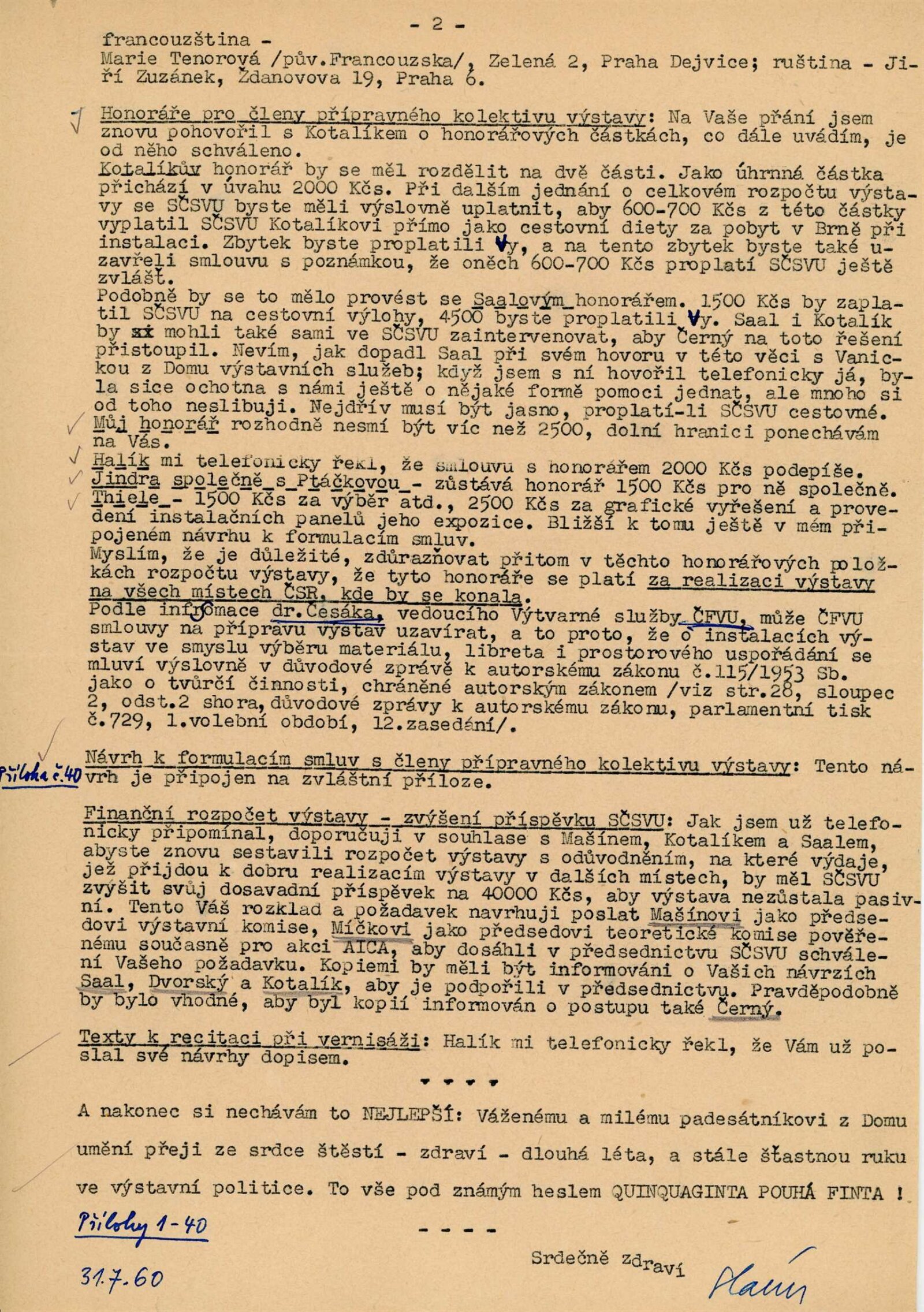 pozvánka, katalog, text přivítání na vernisáži (Gerta Pospíšilová), texty k výstavě (básně Josefa Čapka, L. Stehlíka, texty ČJ, AJ, FJ, RJ), popisky, seznam exponátů, fotografie děl pro katalog, foto Jiřího Kotalíka z vernisáže, seznam zápůjček (dokumenty, knihy, předměty, seznam knih Čapkem graficky upravovaných), korespondence (o rozpočtu s SČSVU a o financování výstavy, provozní korespondence, dopisy Dr. Slavíka, M. Míčka), seznam adres pro pozvánky, zápisy z přípravných schůzí a jednání s Jiřím Kotalíkem, koncepce výstavy a její členění, rozpočet, přihlášky pro výstavu, potvrzení o převzetí děl, reverzy, pojištění výstavy, zápisy z jednání a nástin výstavy (Jiří Kotalík), smlouvy o dílo (překlady, instalace atd.), rozpočet, recenze v tisku, podpisová kniha z výstavy (asi 60 stran)