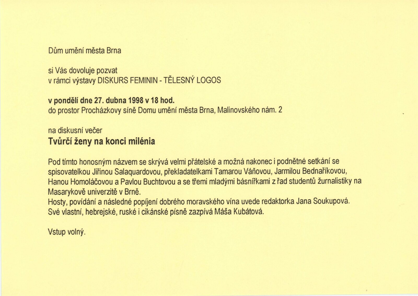 Diskurs feminin. Tělesný logos. 14 umělkyň z Německa: Dům umění města Brna, 17. 3. – 3. 5. 1998 / Texty: René Block, Erna Haistová, Gudrun Inbodenová. – Stuttgart: Institut für Auslandsbeziehungen, 1998. – 24 s. / K putovní výstavě vydán katalog Leiblicher Logos. 14 Künstlerinnes aus Deutschland. Eine Ausstellung des Instituts für Auslandsbeziehungen / Text: René Block, Erna Haist, Gudrun Inboden. – Stuttgart: Institut für Auslandsbeziehungen. – 176 s., obr. Leiblicher Logos. 14 Künstlerinnes aus Deutschland. Installationen, Objekte, Zeichchnungen. - Stuttgart: Institut für Auslandsbeziehungen. – skládačka (12 s. obr.), DU 1074. – MZK