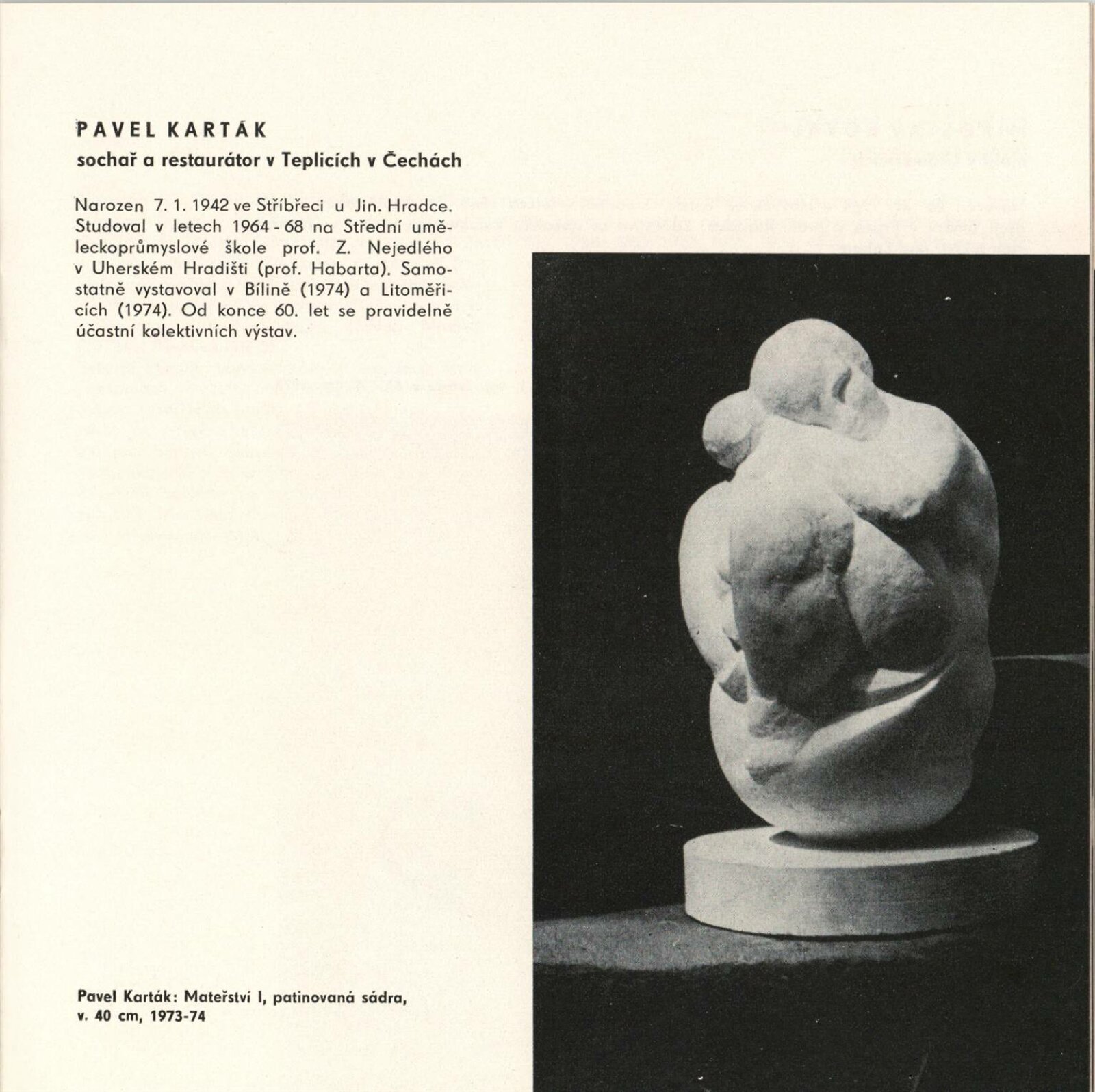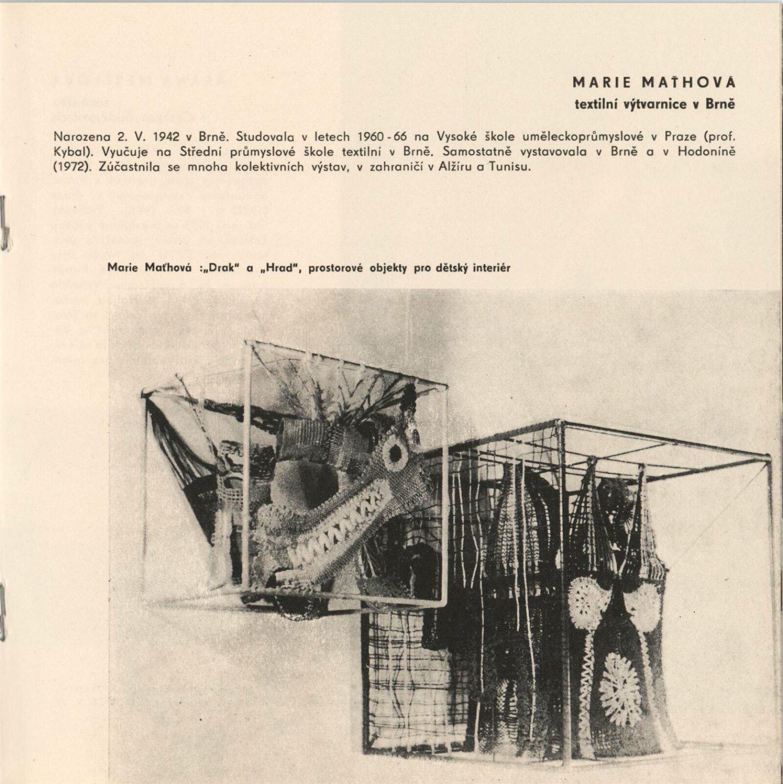 pozvánka, katalog, seznam prací, hospodářská smlouva (DU s Českým fondem VU v Brně), revers, korespondence (návrhy na ocenění, hlášení o vernisáži, pozvání na tiskovou besedu, korespondence s Čes. fondem VU o úkolové akci „Mateřství, rodičovství, život dětí“), žádost ČFVU o výstavu v DPK, recenze v tisku
