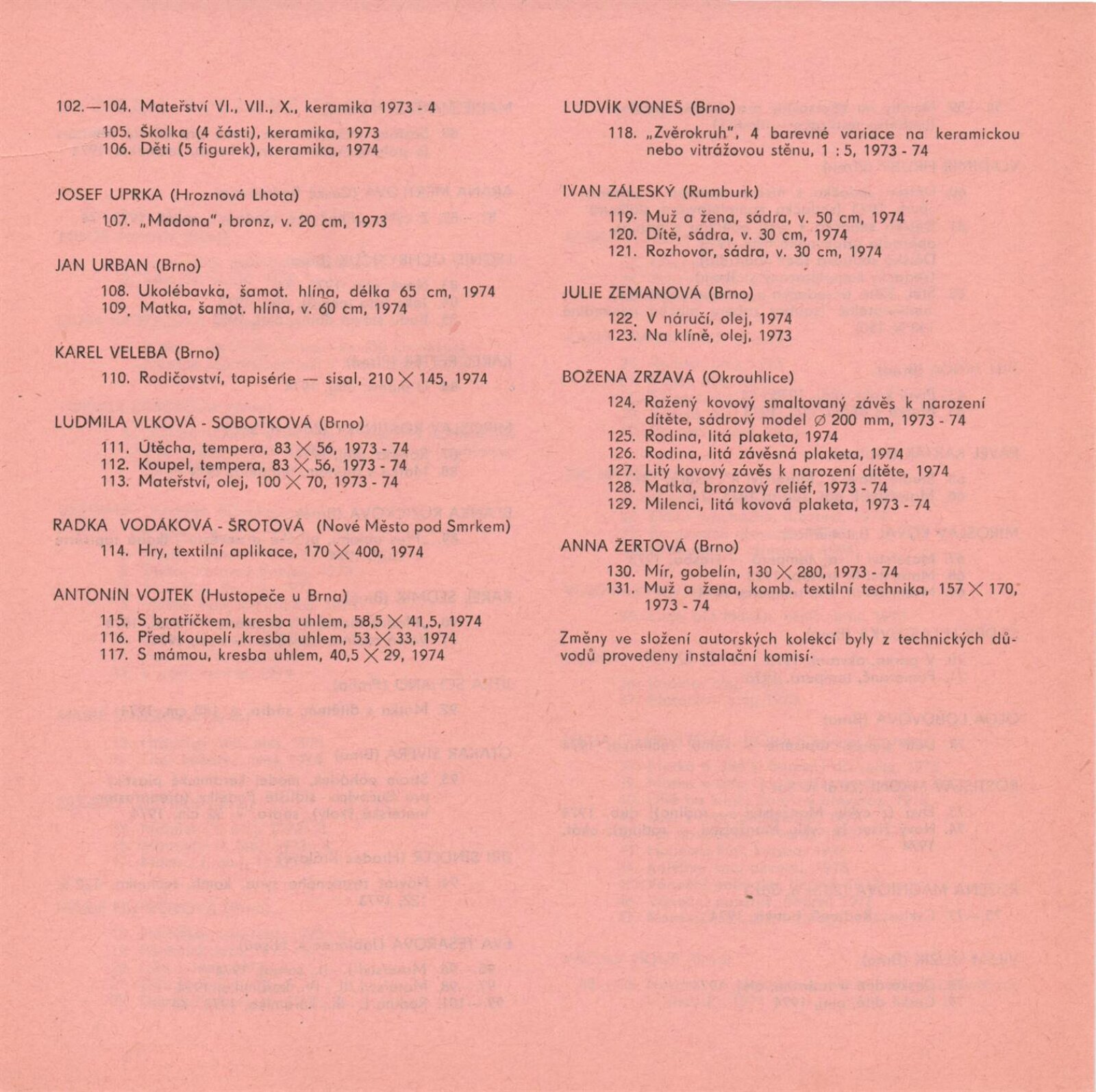 Dítě, rodina, společnost: Dům umění / Dům pánů z Kunštátu, 30. 4. – 20. 5. 1975 / Výstava výsledků tvůrčí úkolové akce Českého fondu výtvarného umění „Manželství, rodičovství, ze života našich dětí“ u příležitosti 30. výročí osvobození Československa sovětskou armádou a Mezinárodního roku ženy. – Text: Emilie Ventrubová. – Brno: ČFVU, 1975. – 48 s., obr., seznam vystavených prací 4 s., životopisy, DPK 596