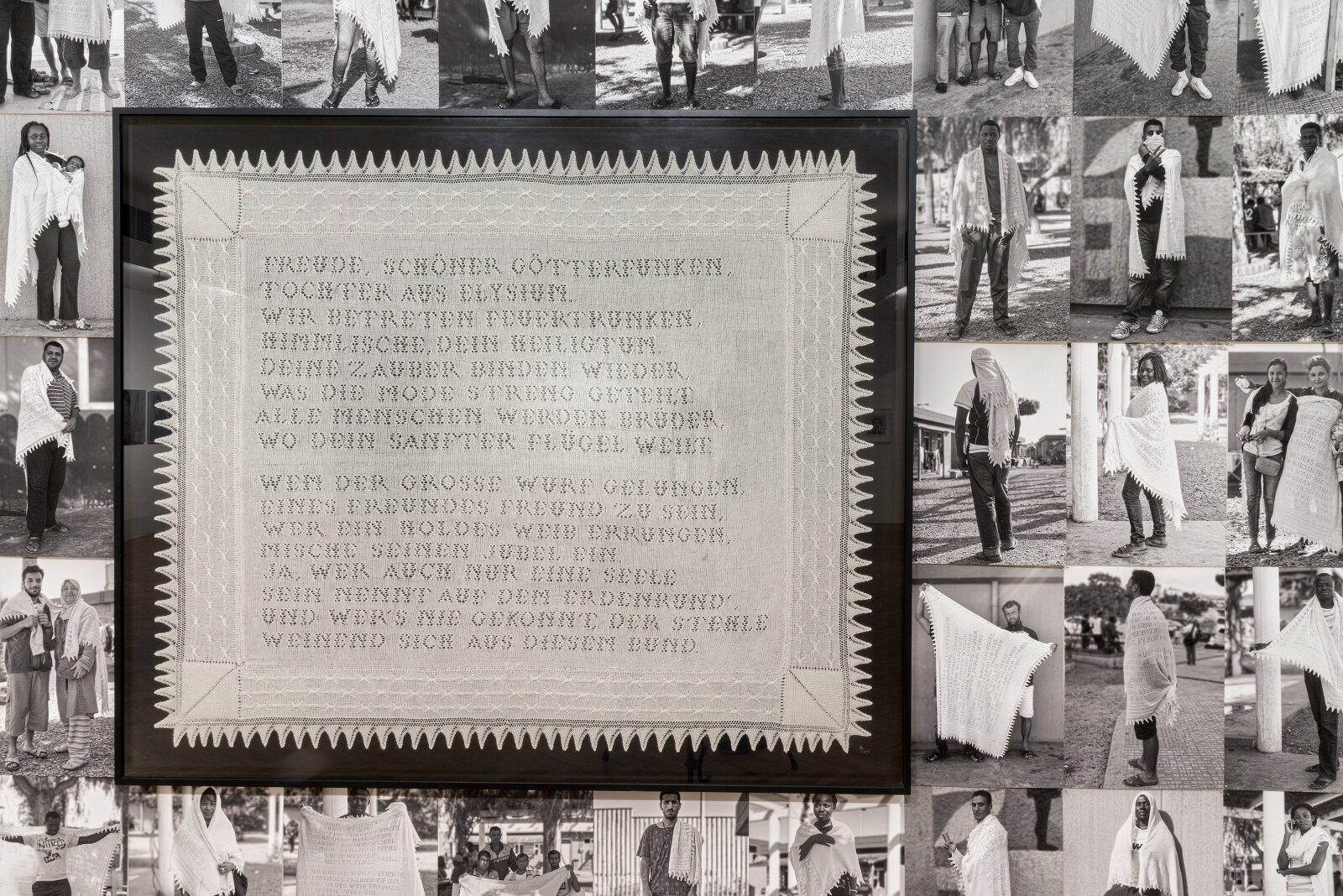 In her works Tanja Boukal explores themes such as struggle for work and survival or migration and the related social deprivation. The material she works in is threads, or textiles, that she makes using different techniques. The professionally mastered traditional craft of weaving and embroidery is augmented by Boukal’s sharp and empathic interest in human existence, such as when she embroiders photos from news reports on immigrants. The extremely difficult and time-consuming technique that Boukal chooses seems to emphasise the importance of the portrayed and to return a piece of human dignity to them.
