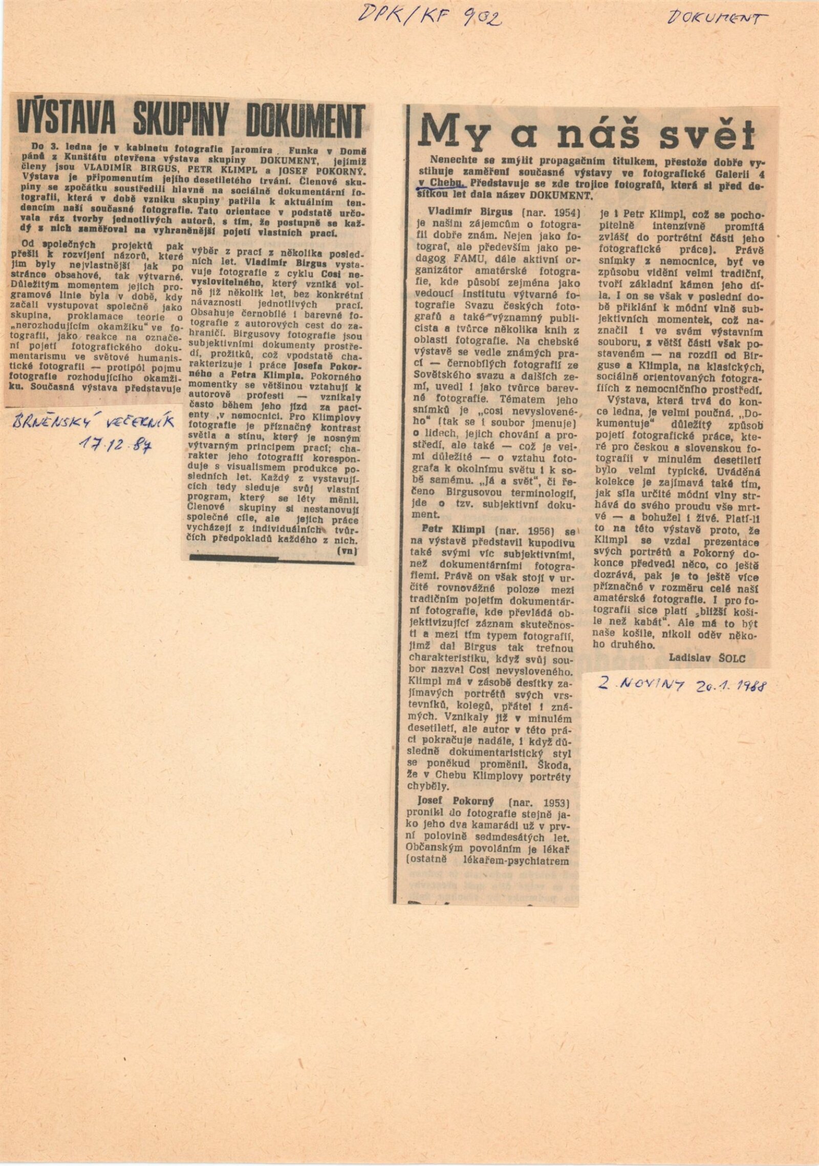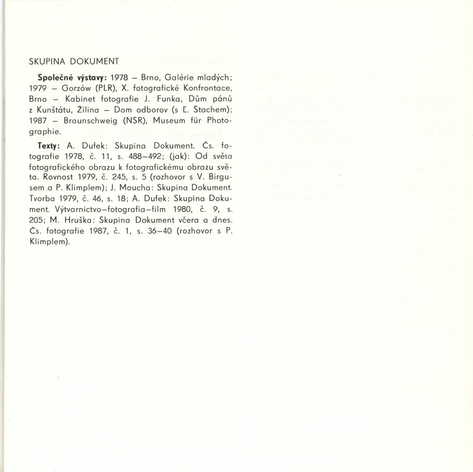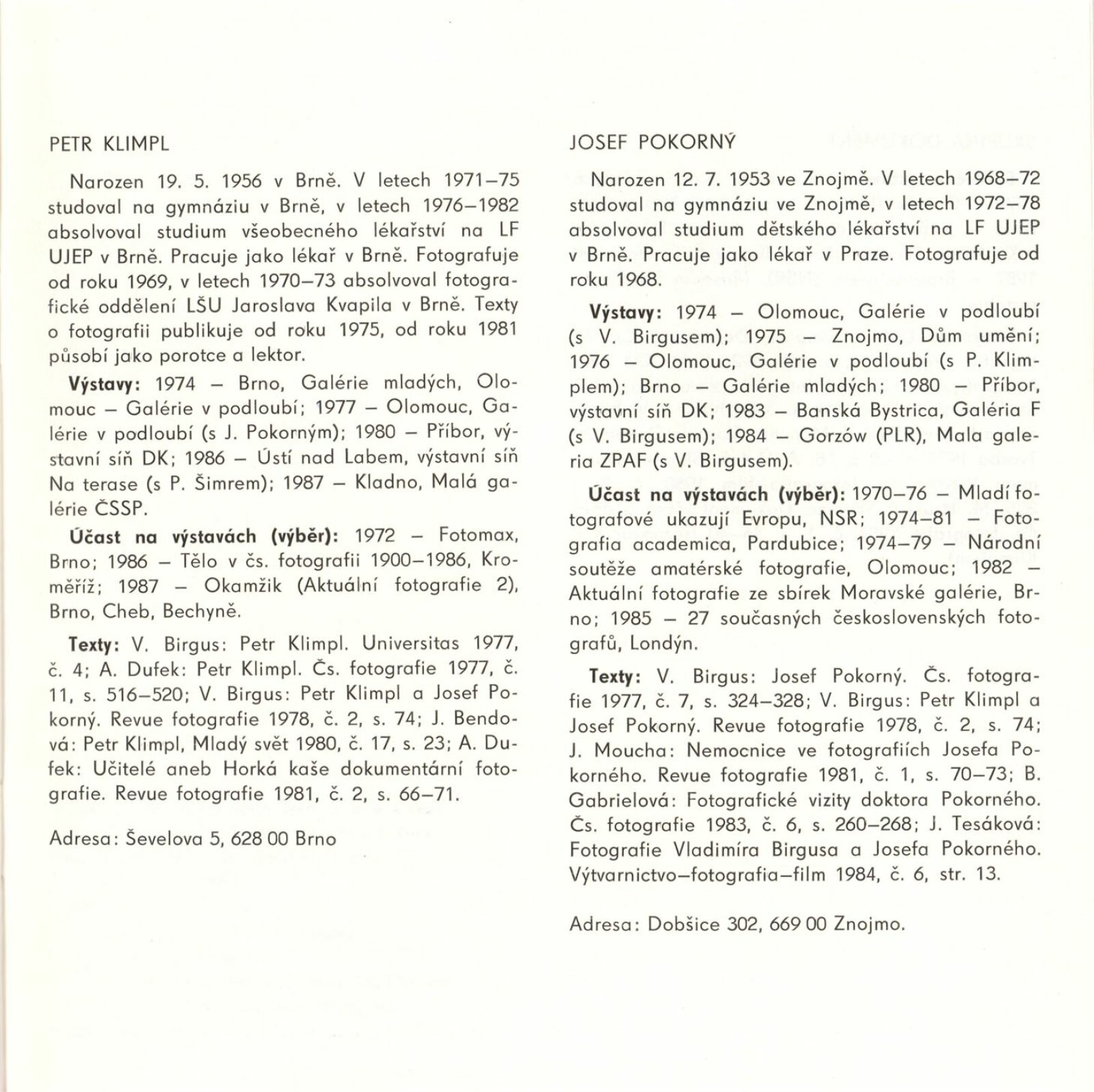 Dokument. Vladimír Birgus. Petr Klimpl. Josef Pokorný: Dům umění / Dům pánů z Kunštátu, Kabinet fotografie Jaromíra Funka, 24. 11. 1987 – 3. 1. 1988 / Text: Antonín Dufek. – Brno: DUmB, 1987. – [24] s., obr., životní data, výstavy, bibliografie, DPK 902. – MZK; MG