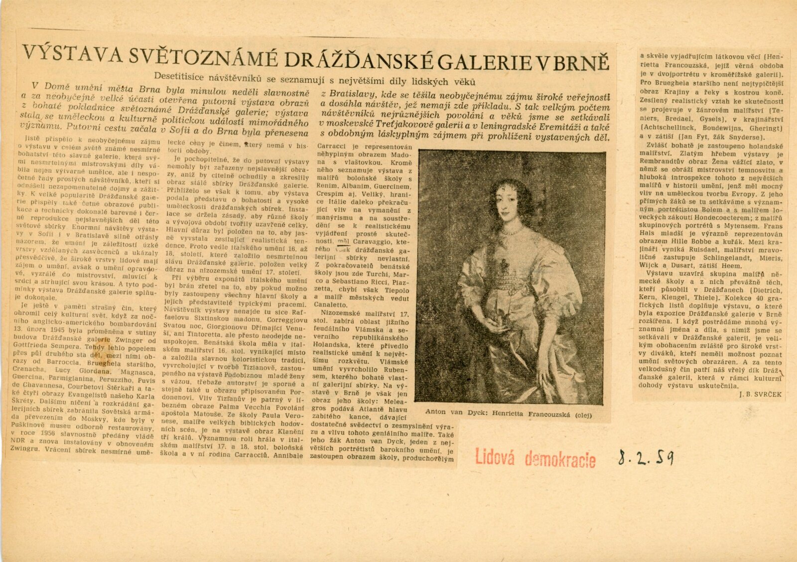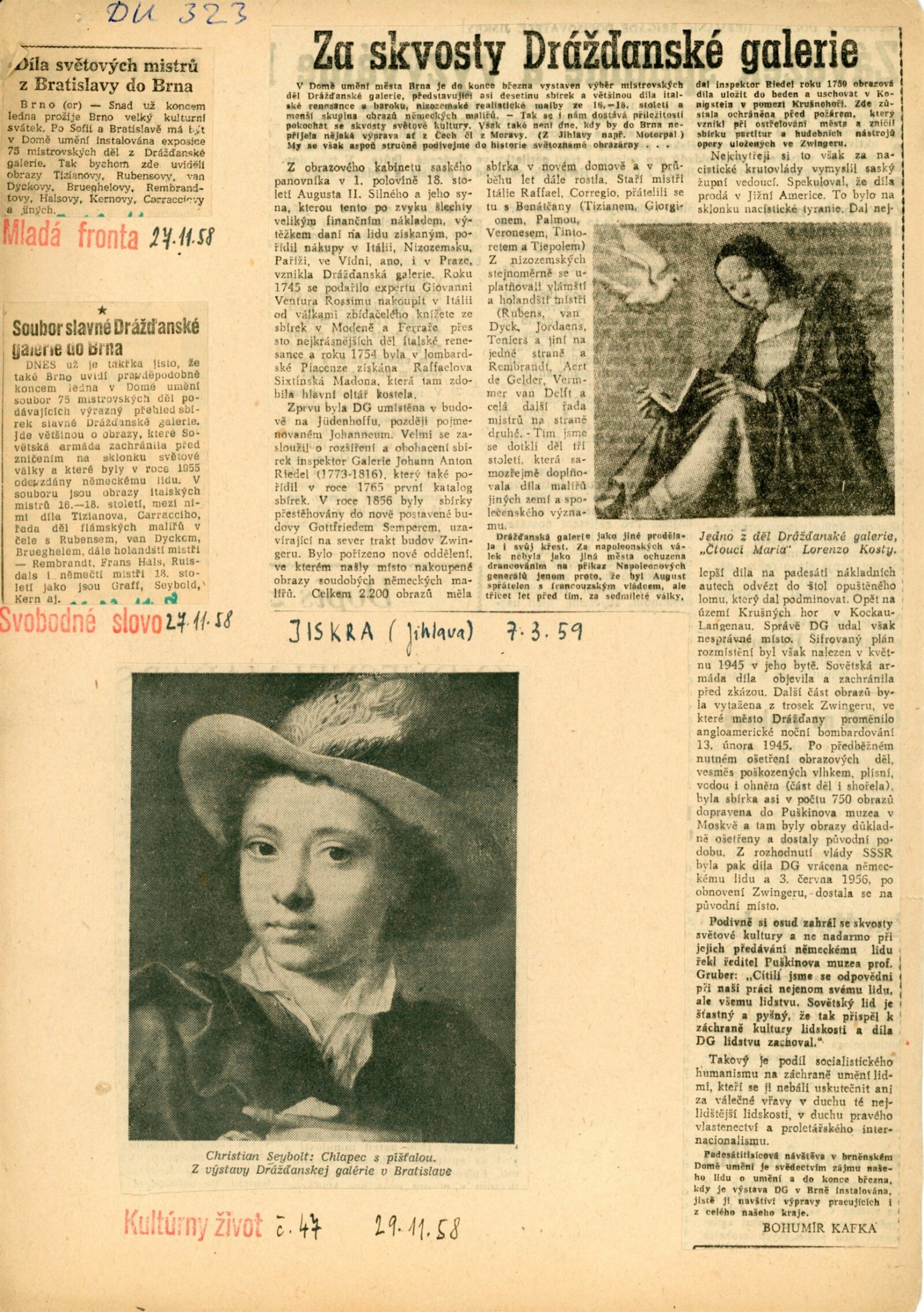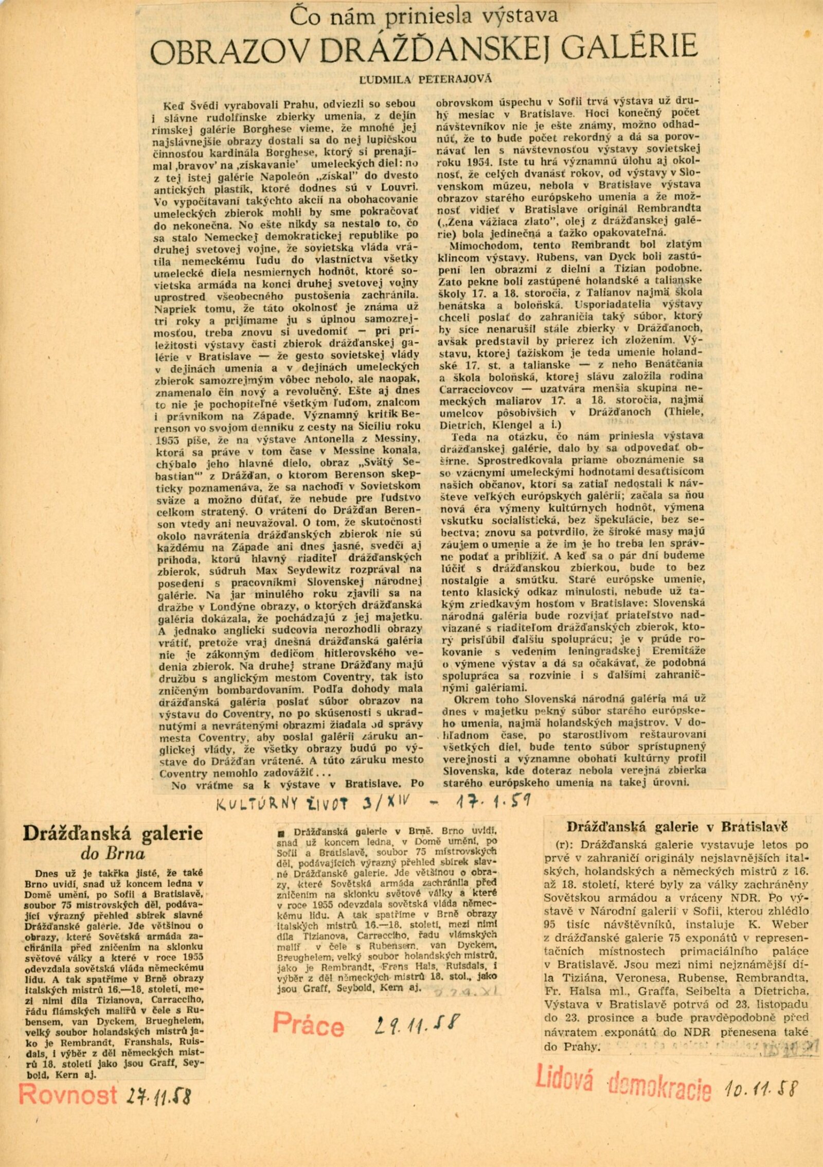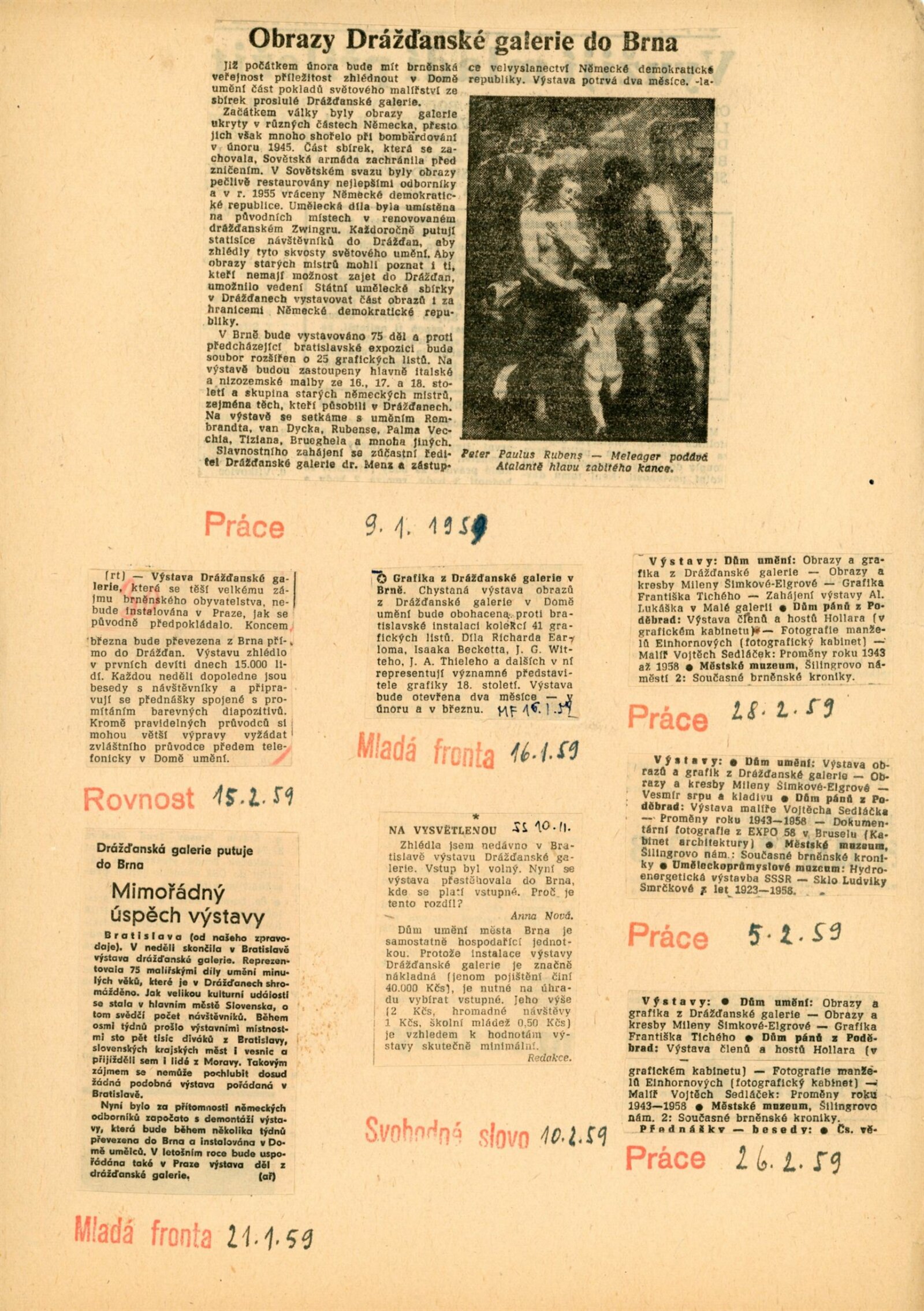 pozvánka, katalog, fotografie (pro katalog, z vernisáže), zápis z porady (leden 1959), oběžník pro školy, úvodní slovo Adolfa Kroupy, projev K. H. Webera a E. Soukupové (MKČR) při zahájení výstavy, strojopisy textů katalogu (J. Nedělka, M. Seydewitz), texty o Drážďanské galerii, přehled návštěvnosti a pořadů, seznam grafik a obrazů, podpisová kniha návštěvníků (překlady některých zápisů v knize návštěvníků, cca 120 stran), žádosti o záštitu, odmítnutí rozšíření výstavy o další obrazy, smlouva o zapůjčen í výstavy, provozní korespondence, žádost o možnost kopírování obrazu od F. Dragouna, povolení ředitelstvím galerie, upozornění kulturních redakcí na výstavu, žádost o finanční spoluúčast MŠK, žádosti o komentované prohlídky výstavy, potvrzení o pojištění výstavy, recenze v tisku, plakáty z bratislavské výstavy, korespondence o převzetí výstavy z Bratislavy