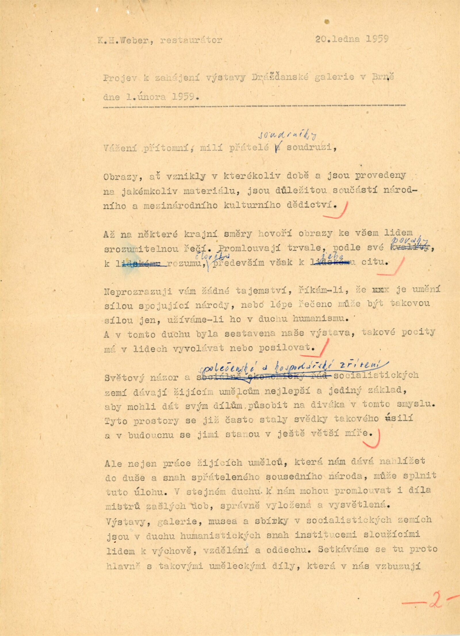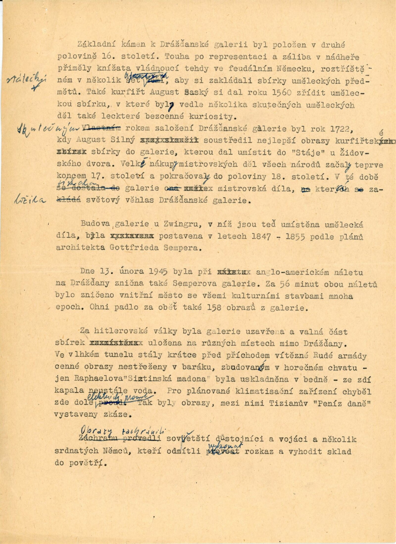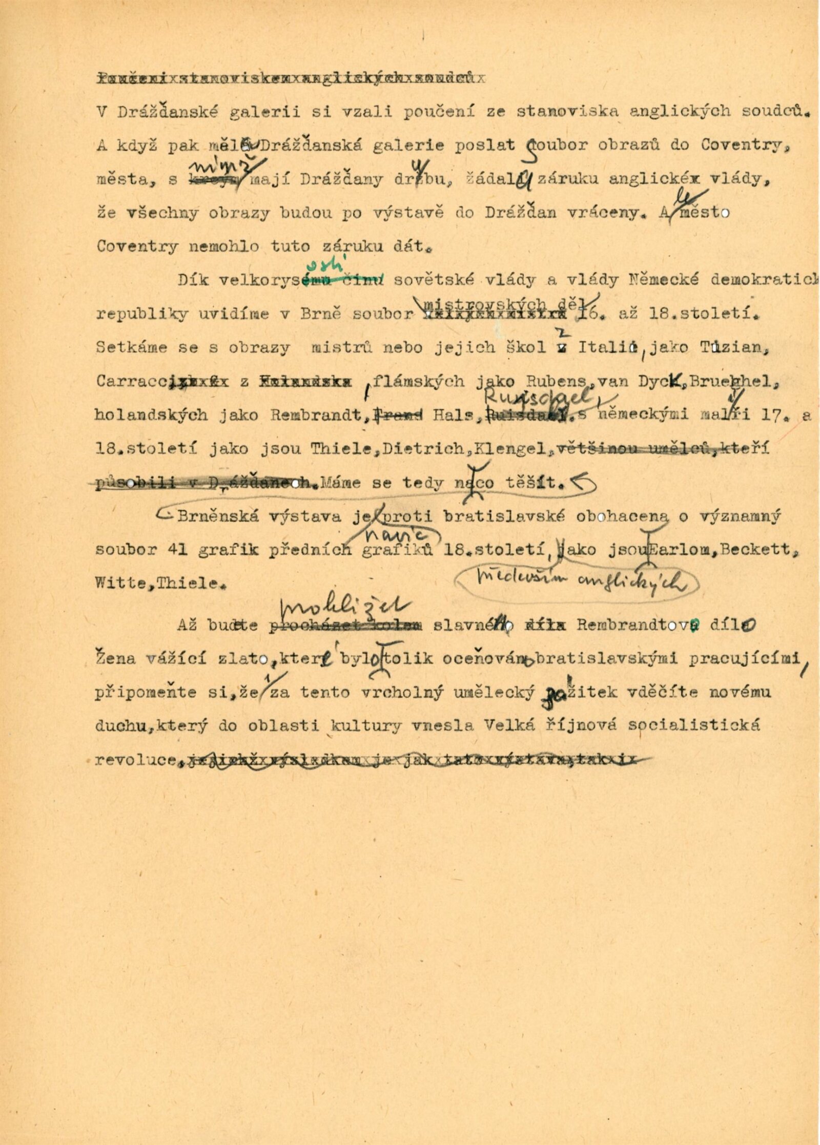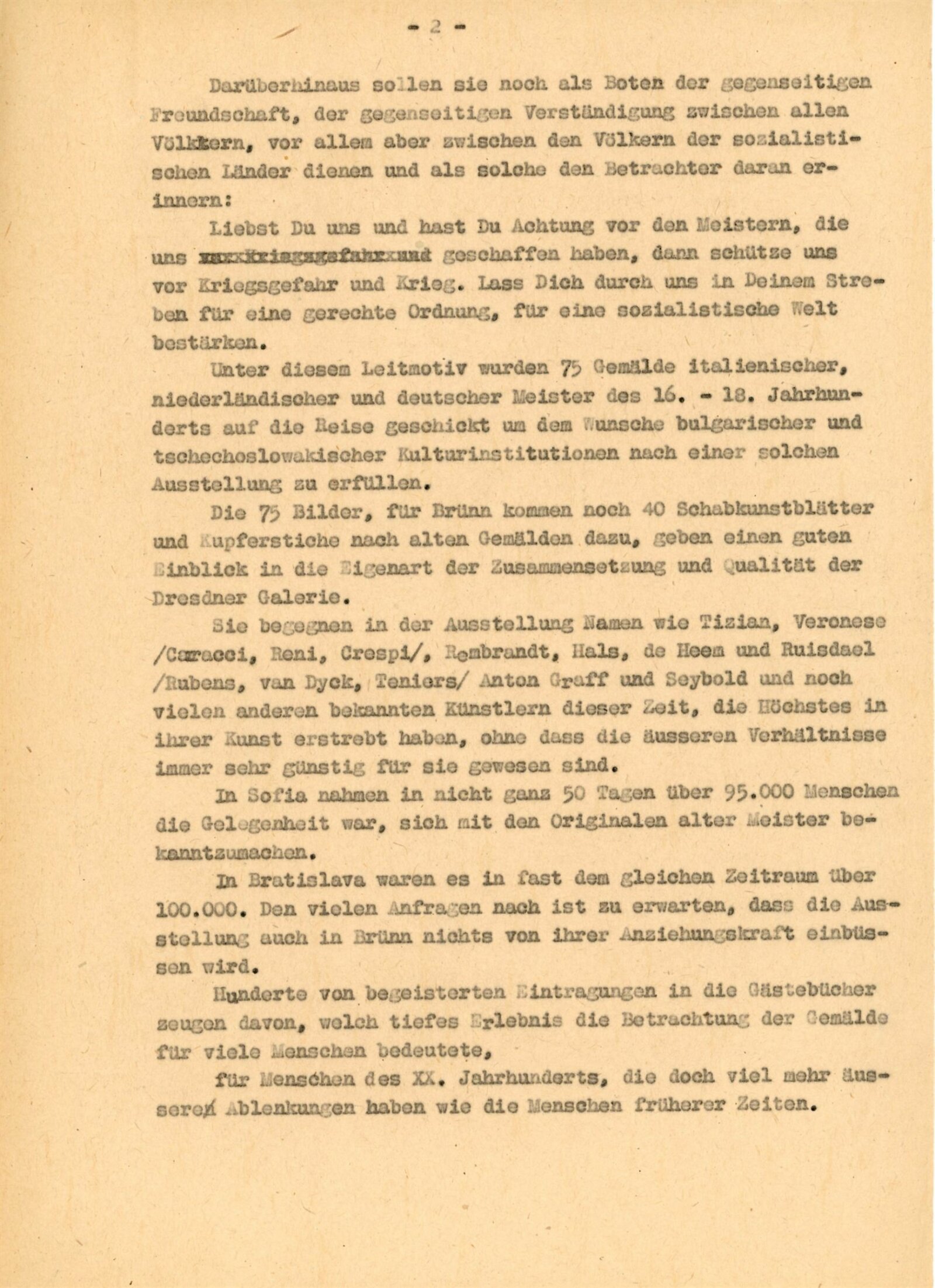 pozvánka, katalog, fotografie (pro katalog, z vernisáže), zápis z porady (leden 1959), oběžník pro školy, úvodní slovo Adolfa Kroupy, projev K. H. Webera a E. Soukupové (MKČR) při zahájení výstavy, strojopisy textů katalogu (J. Nedělka, M. Seydewitz), texty o Drážďanské galerii, přehled návštěvnosti a pořadů, seznam grafik a obrazů, podpisová kniha návštěvníků (překlady některých zápisů v knize návštěvníků, cca 120 stran), žádosti o záštitu, odmítnutí rozšíření výstavy o další obrazy, smlouva o zapůjčen í výstavy, provozní korespondence, žádost o možnost kopírování obrazu od F. Dragouna, povolení ředitelstvím galerie, upozornění kulturních redakcí na výstavu, žádost o finanční spoluúčast MŠK, žádosti o komentované prohlídky výstavy, potvrzení o pojištění výstavy, recenze v tisku, plakáty z bratislavské výstavy, korespondence o převzetí výstavy z Bratislavy