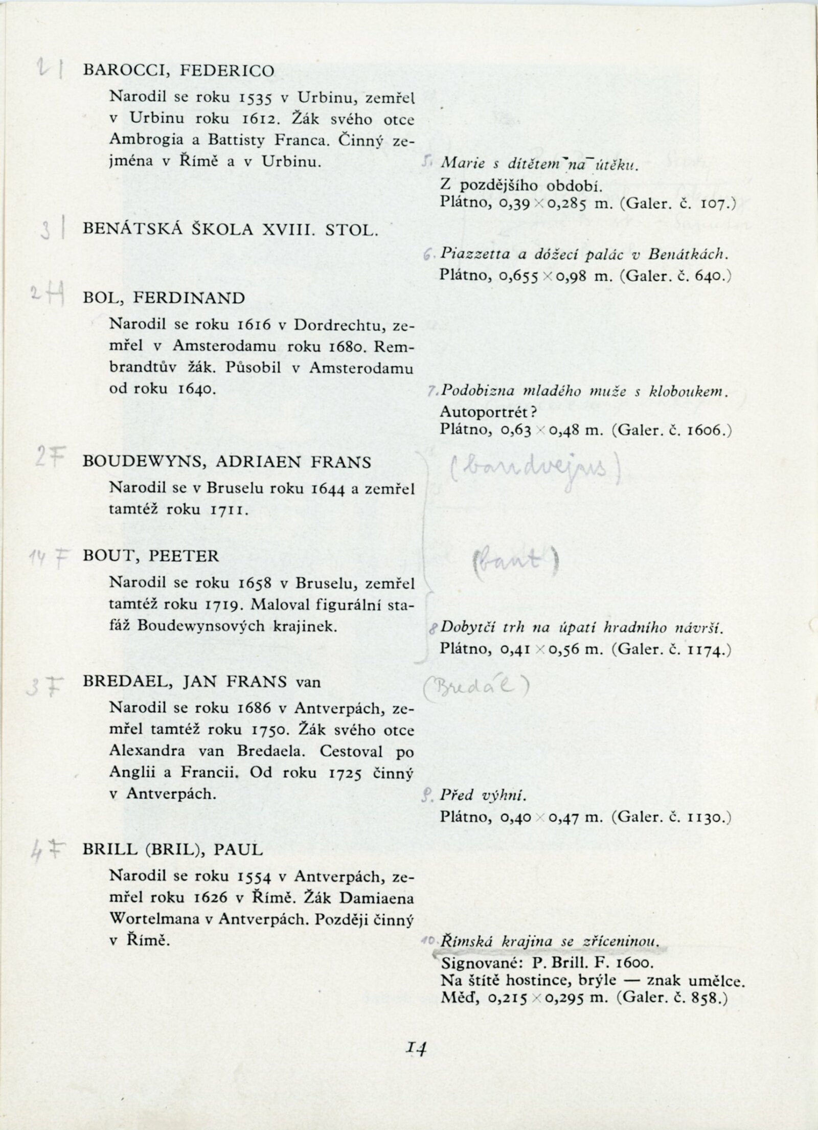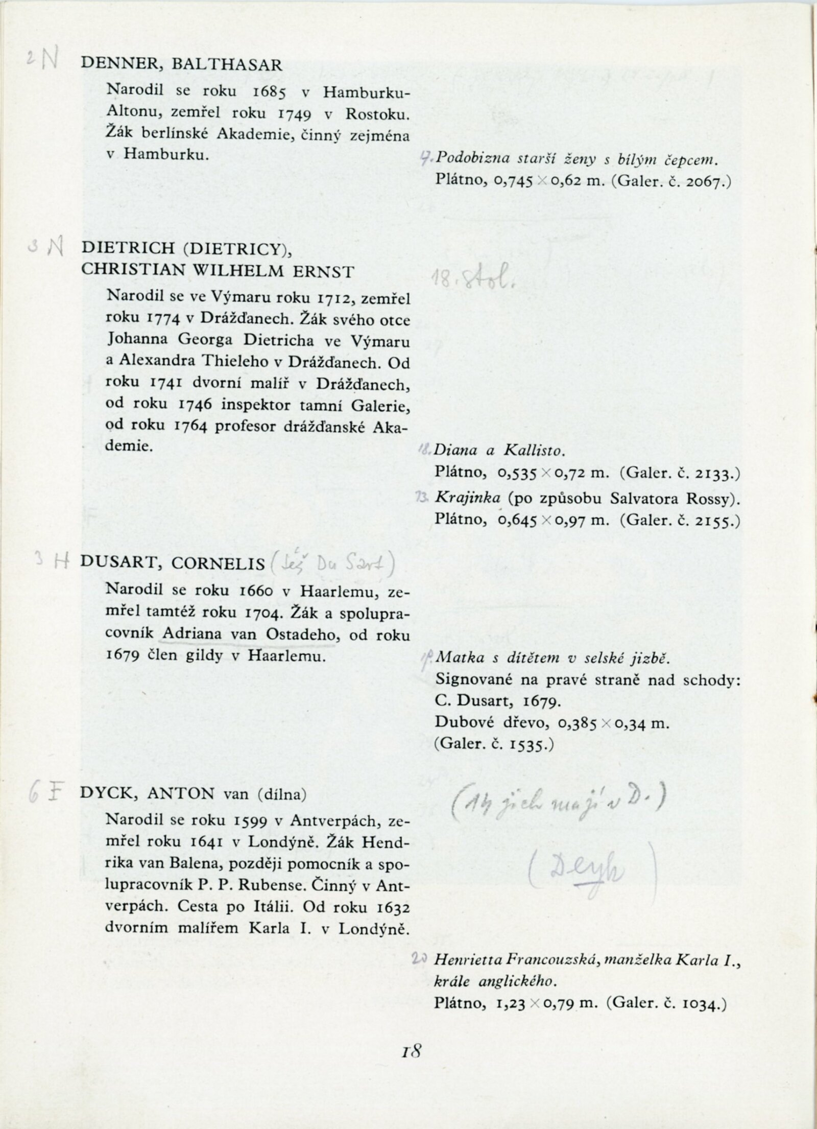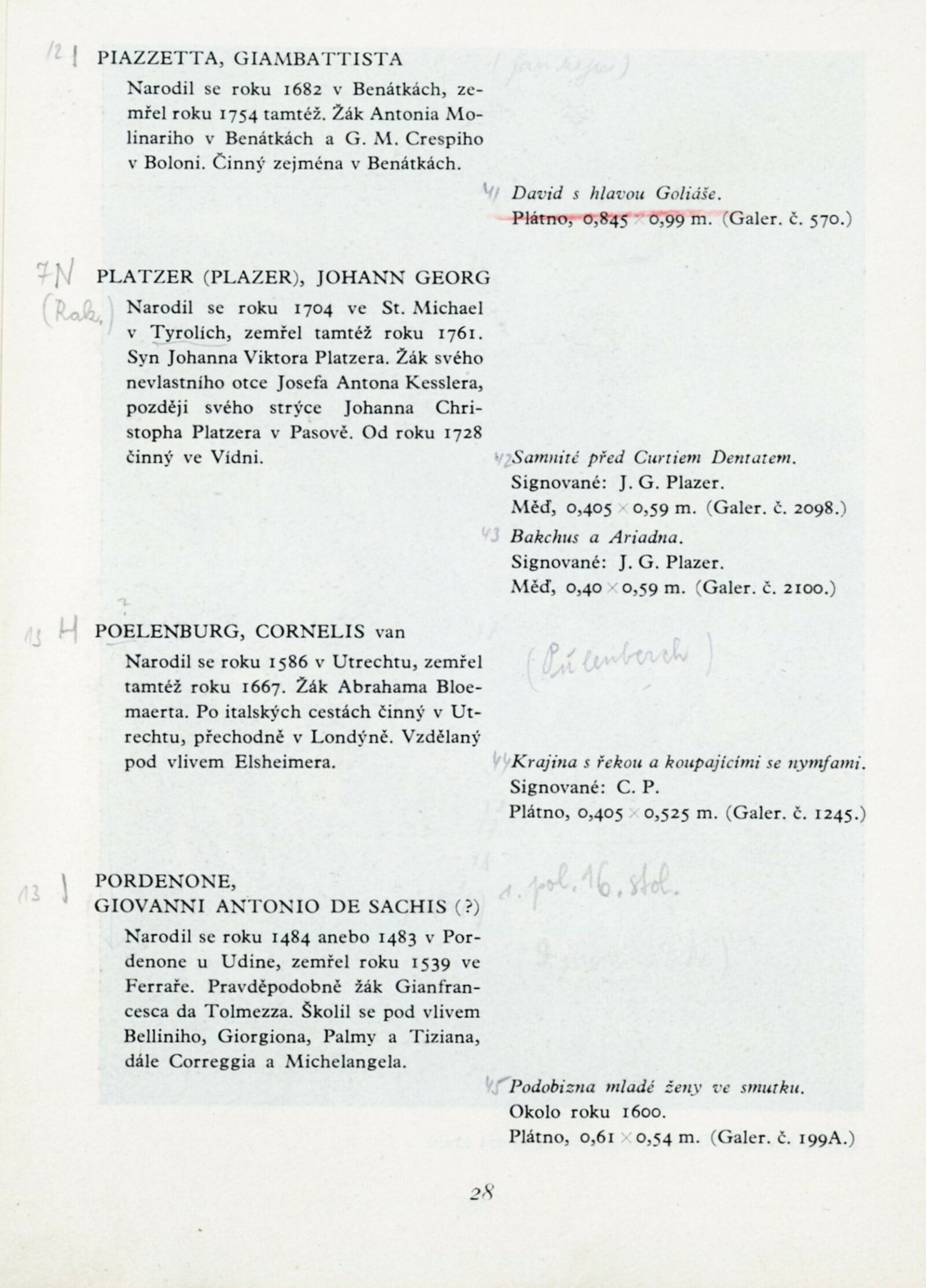 Lucas Achtschellinck, Christoph Ludwig Agricola, Francesco Albani, Jan Asselijn, Federico Barocci, Ferdinand Bol, Adriaen Frans Boudewyns, Peeter Bout, Jan Frans van Bredael, Paul Brill, Jan Brueghel, Annibale Carracci, Paolo Morando Cavazzola, Michelangelo Cerquozzi, Giuseppe Maria Crespi, Balthasar Denner, Christian Wilhelm Ernst Dietrich (Dietricy), Cornelis Dusart, Anton van Dyck, Jan Fyt, Anton Gheringh, Luca Giordano, Anton Graff, Jan Griffier, Giovanni Francesco Barbieri, Peeter Gysels, Frans Hals, Jan Davidsz de Heem, Batholomeus van der Helst, Jan van der Heyde, Melchior de Hondecoeter, Anton Kern (Körne), Johann Christian Klengel, Frans van Mieris starší, Pier Francesco Mola, Mytens (asi Isaac Mytens), Jacob Ochtervelt, Vecchio Palma (Giacomo D'Antonio di Nigretti), Bonventura Peeters, Giambattista Piazzetta, Johann Georg Platzer (Plazer), Cornelis van Poelenburg, Giovanni Antonio de Sachis Pordenone, Harmensz van Rijn Rembrandt, Guido Reni, Sebastiano Ricci, Marco Ricci, Heinrich Roos, Peter Paul Rubens, Jacob van Ruisdael, Enoch Seeman, Christian Seybold, Pieter Cornelisz vna Slingelandt, Matthias Stomer, Abraham Storck, David Teniers mladší, Johann Alexander Thiele, Tiziano Vecellio Tizian, Jacob Toorenvliet, Allessandro Turchi, Andriaen van de Velde, Pieter Verelst, Veronese (Paolo Caliari), Philips Wouwerman, Thomas Wijck