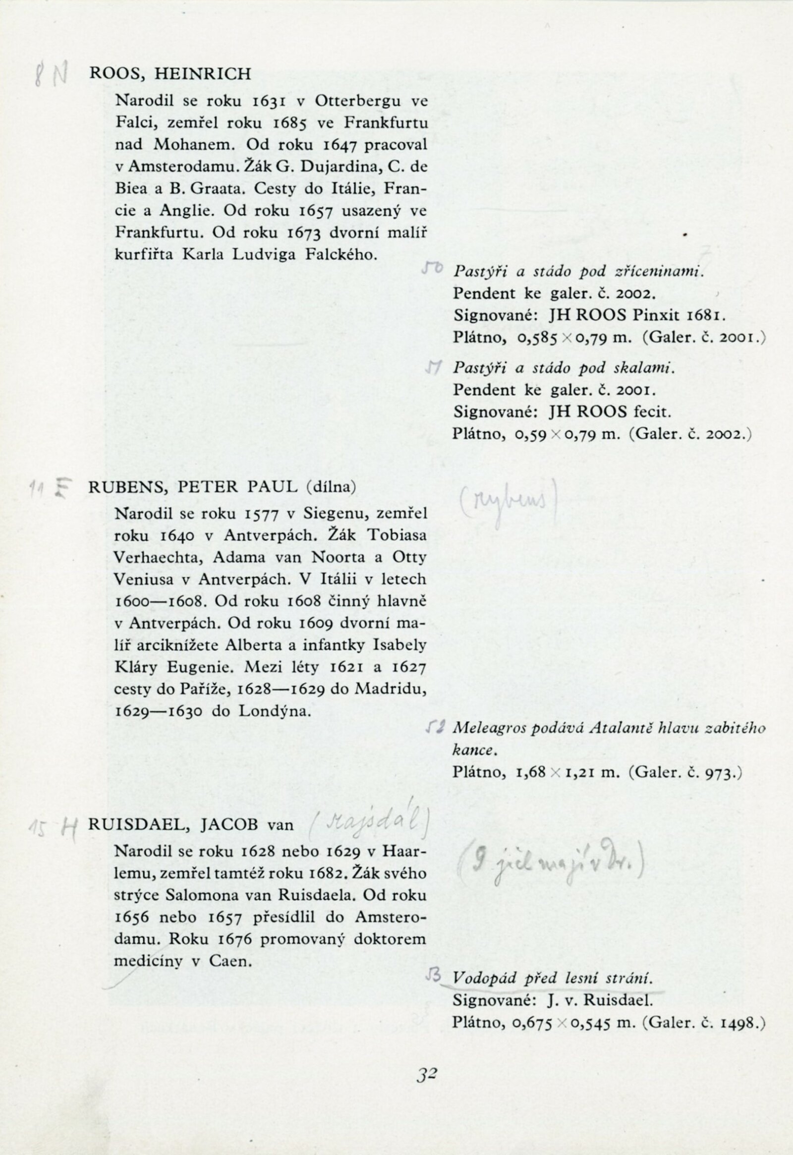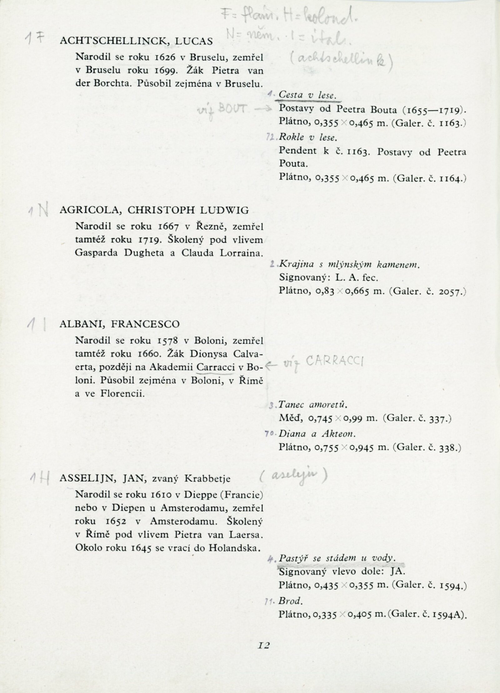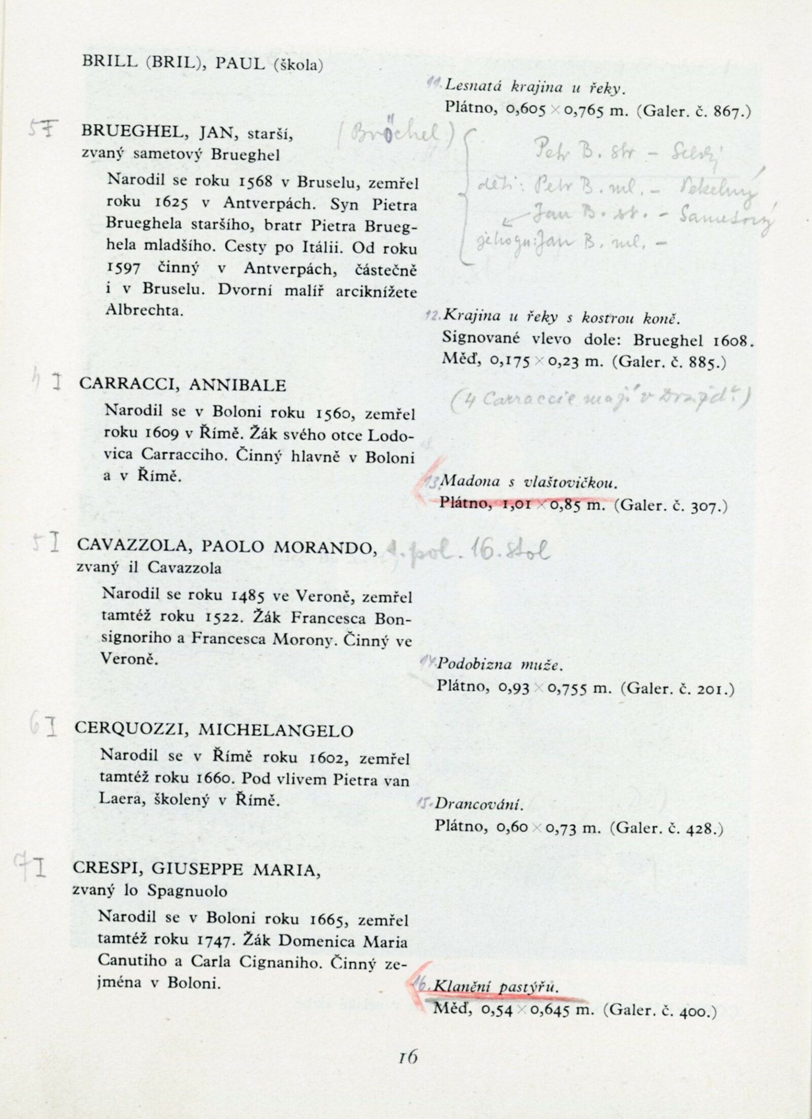 Lucas Achtschellinck, Christoph Ludwig Agricola, Francesco Albani, Jan Asselijn, Federico Barocci, Ferdinand Bol, Adriaen Frans Boudewyns, Peeter Bout, Jan Frans van Bredael, Paul Brill, Jan Brueghel, Annibale Carracci, Paolo Morando Cavazzola, Michelangelo Cerquozzi, Giuseppe Maria Crespi, Balthasar Denner, Christian Wilhelm Ernst Dietrich (Dietricy), Cornelis Dusart, Anton van Dyck, Jan Fyt, Anton Gheringh, Luca Giordano, Anton Graff, Jan Griffier, Giovanni Francesco Barbieri, Peeter Gysels, Frans Hals, Jan Davidsz de Heem, Batholomeus van der Helst, Jan van der Heyde, Melchior de Hondecoeter, Anton Kern (Körne), Johann Christian Klengel, Frans van Mieris starší, Pier Francesco Mola, Mytens (asi Isaac Mytens), Jacob Ochtervelt, Vecchio Palma (Giacomo D'Antonio di Nigretti), Bonventura Peeters, Giambattista Piazzetta, Johann Georg Platzer (Plazer), Cornelis van Poelenburg, Giovanni Antonio de Sachis Pordenone, Harmensz van Rijn Rembrandt, Guido Reni, Sebastiano Ricci, Marco Ricci, Heinrich Roos, Peter Paul Rubens, Jacob van Ruisdael, Enoch Seeman, Christian Seybold, Pieter Cornelisz vna Slingelandt, Matthias Stomer, Abraham Storck, David Teniers mladší, Johann Alexander Thiele, Tiziano Vecellio Tizian, Jacob Toorenvliet, Allessandro Turchi, Andriaen van de Velde, Pieter Verelst, Veronese (Paolo Caliari), Philips Wouwerman, Thomas Wijck