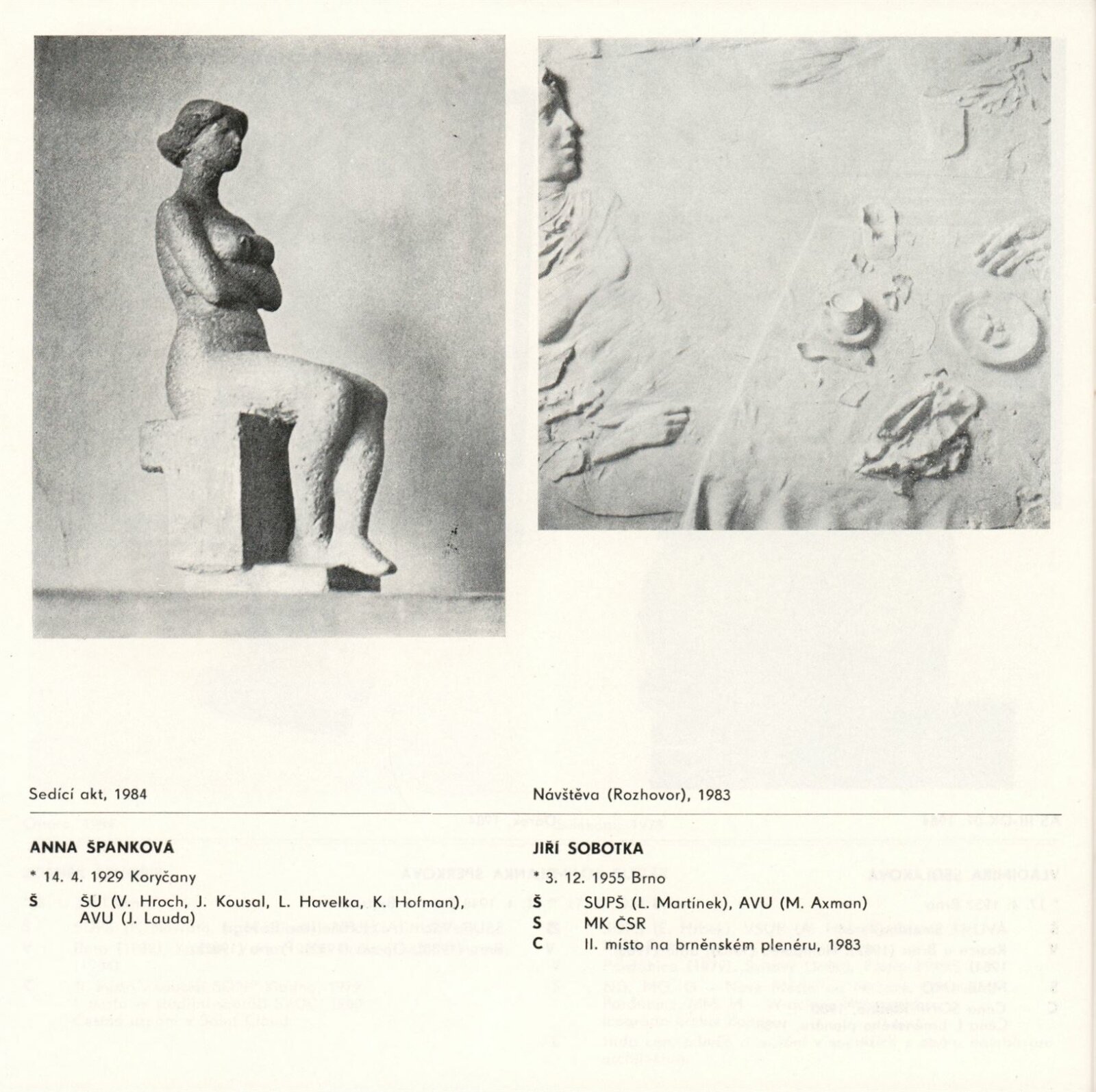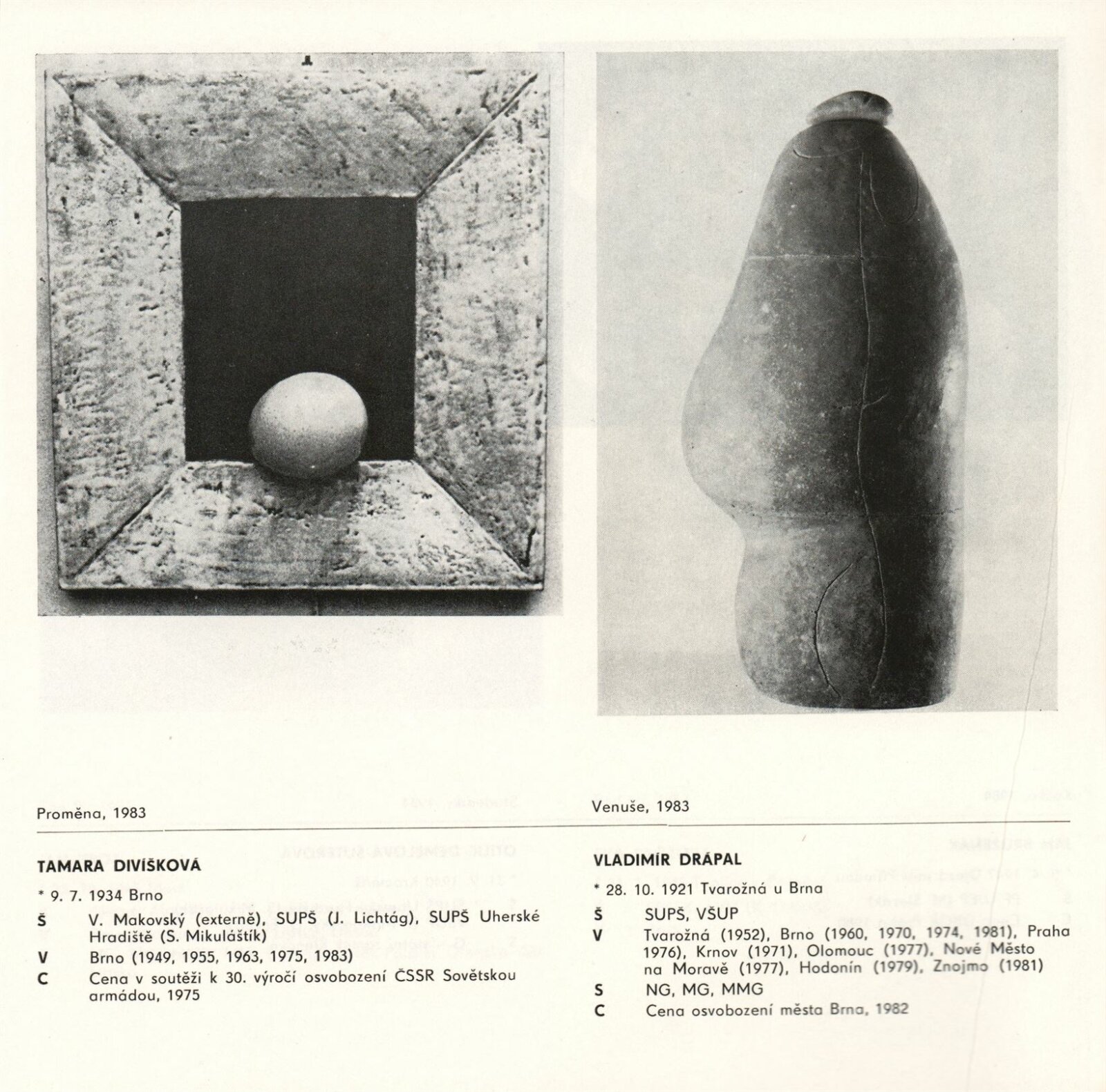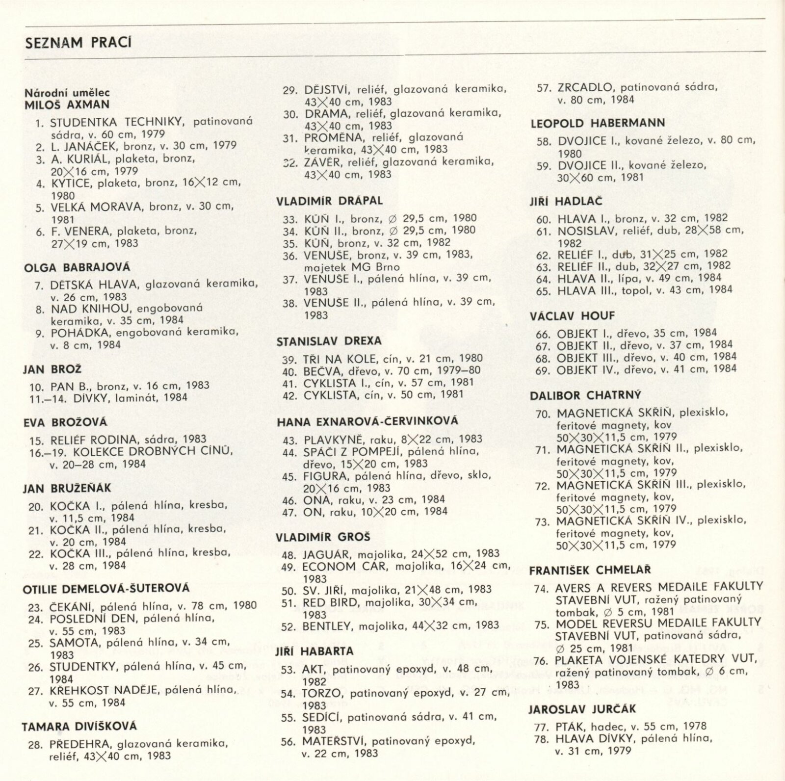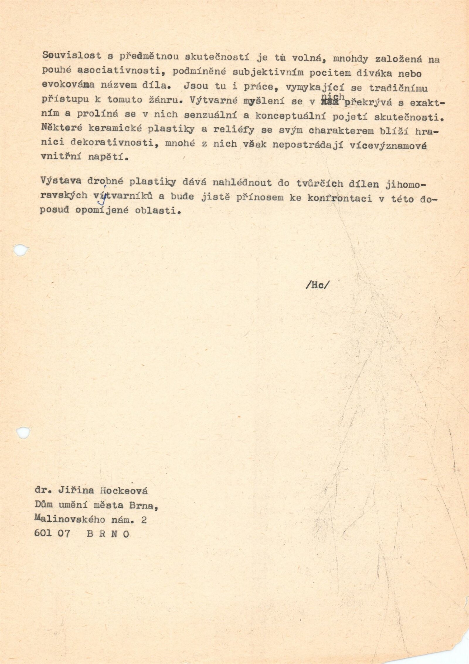 Drobná plastika v tvorbě jihomoravských výtvarníků: Dům umění města Brna, 1. patro, 30. 11. 1984 – 1. 1. 1985 / Text: Jiřina Hockeová. – Brno: DUmB, 1984. – 37 s., obr., DU 788. – MZK; MG; MMB