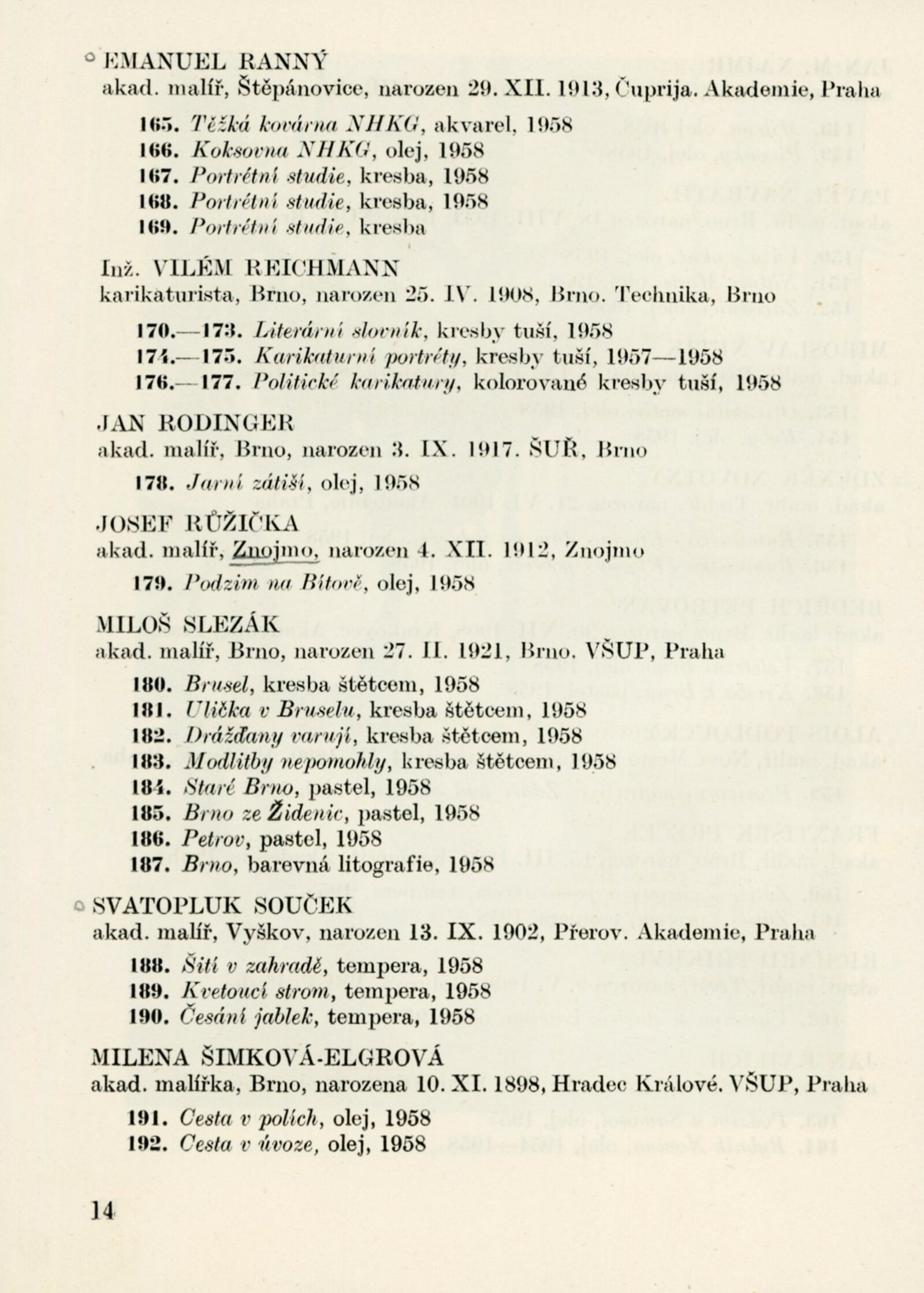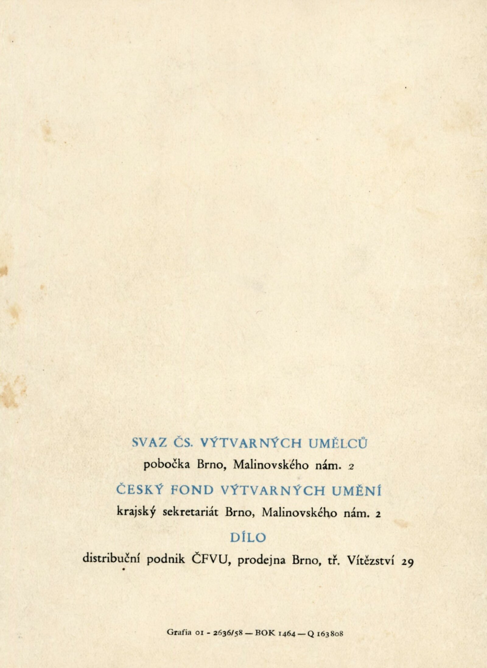 Druhá výroční výstava výtvarných umělců 1958. Pobočka Svazu československých výtvarných umělců v Brně: Dům umění města Brna, 14. 12. 1958 – 18. 1. 1959 / Text: Albert Kutal. – Brno: SČSVU, 1958. – 23 s., 12 s. obr. příl., životní data vystavujících umělců, DU 321. – MZK; MG; AMB