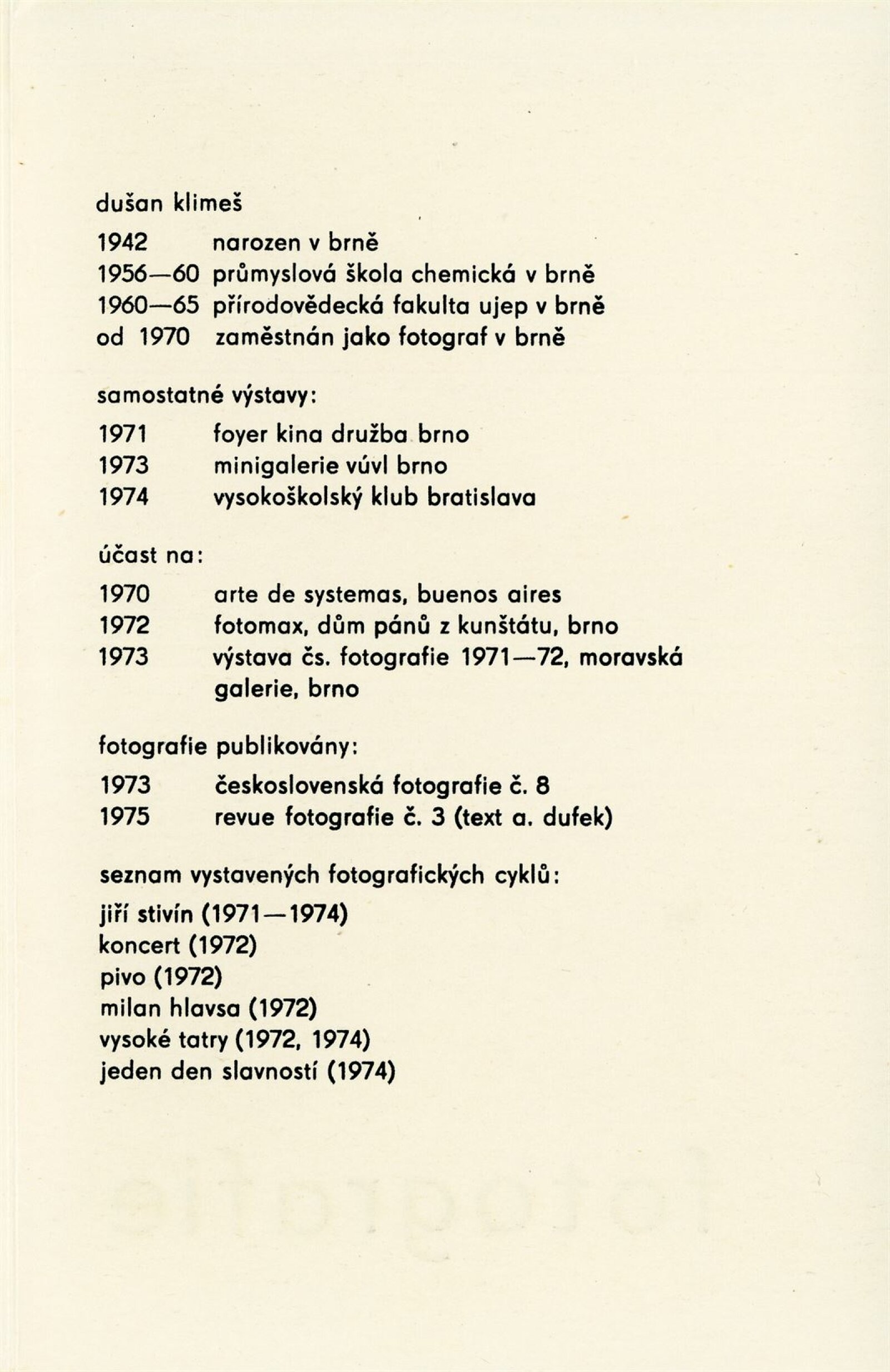 Dušan Klimeš. Fotografie: Dům umění města Brna, 5. 10. – 2. 11. 1975 / Text: Antonín Dufek. – Brno: DUmB, 1975. – 15 l. bar. obr. příl. v obalu, životní data, výstavy, DU 626a. – MG