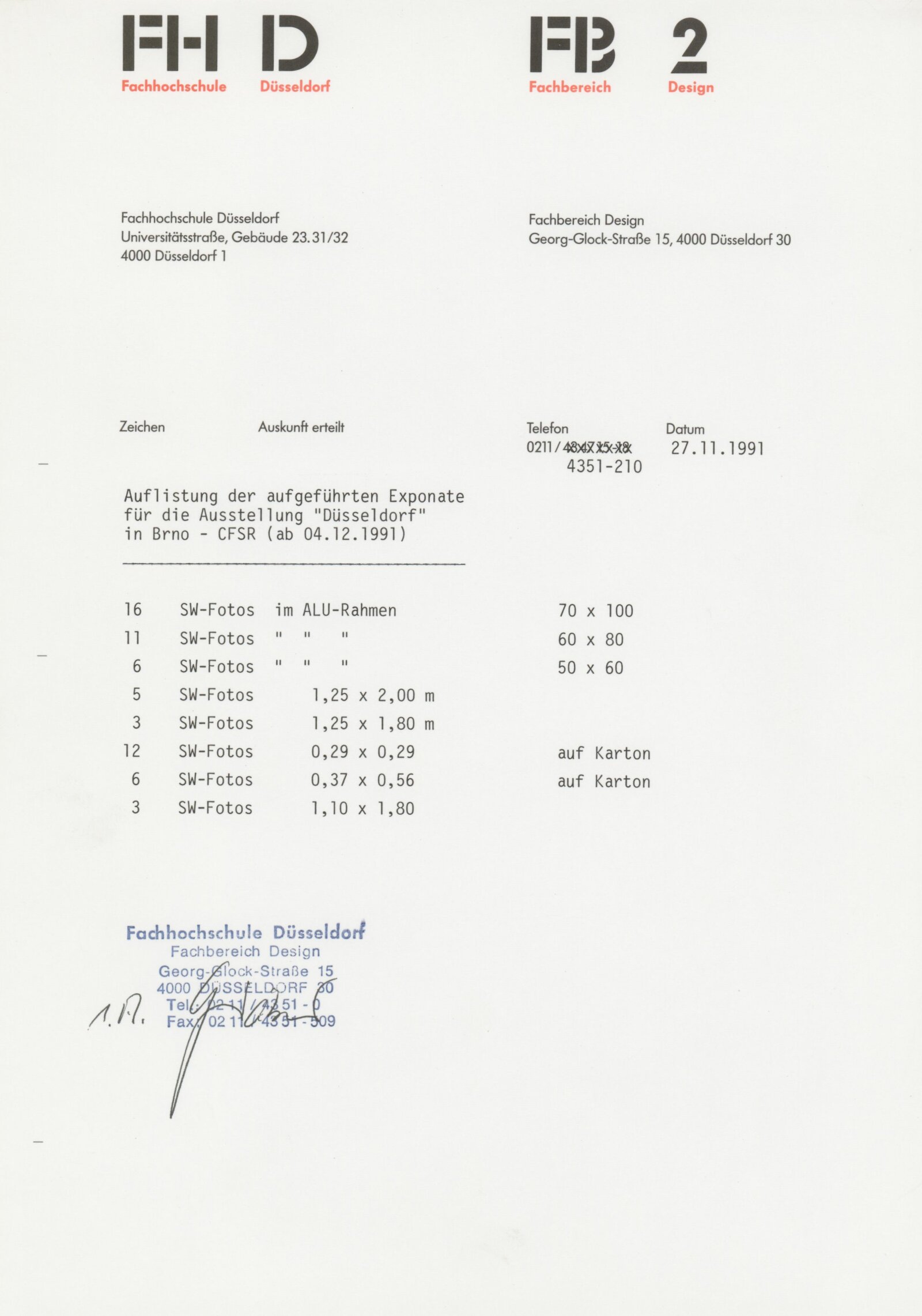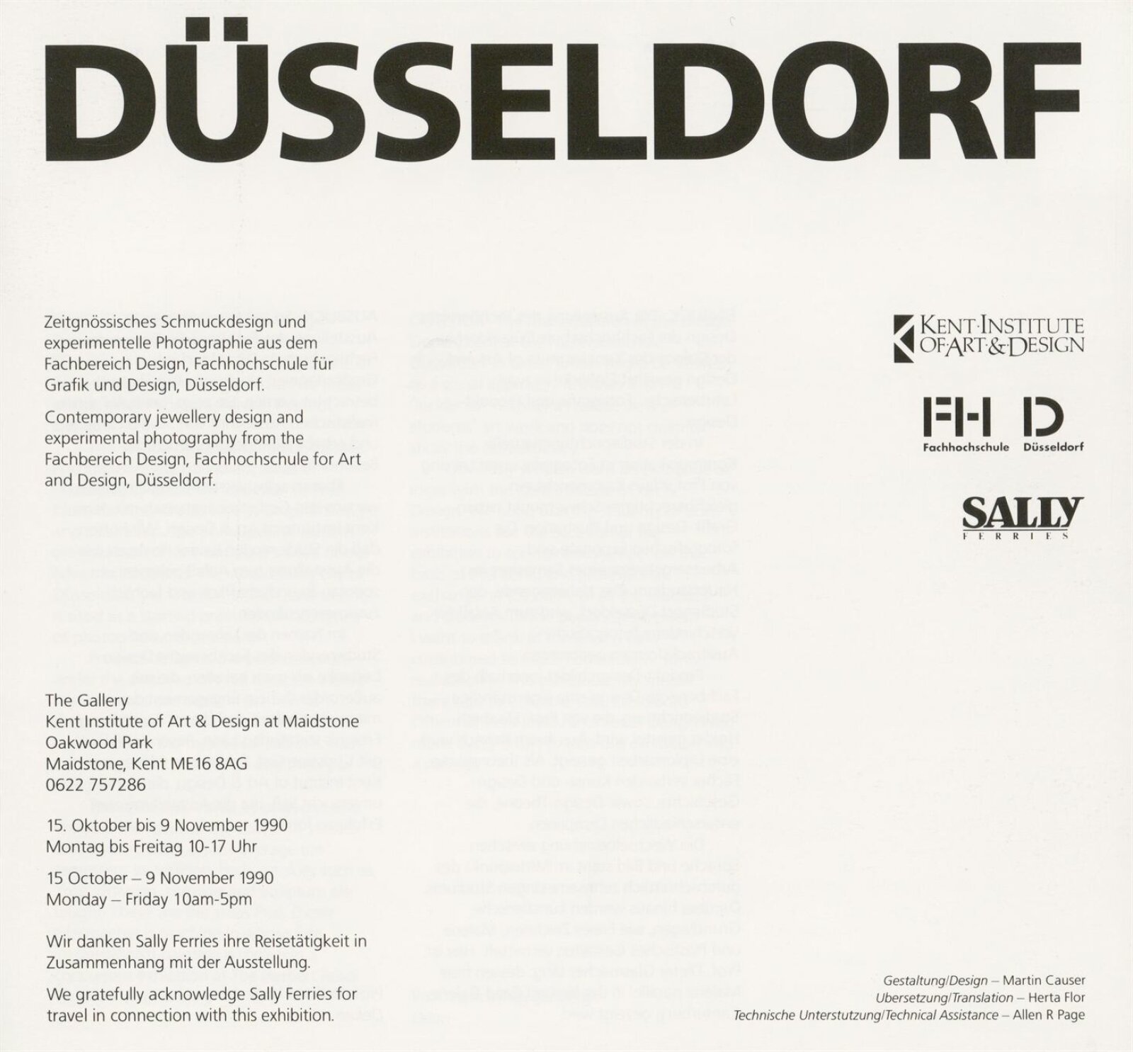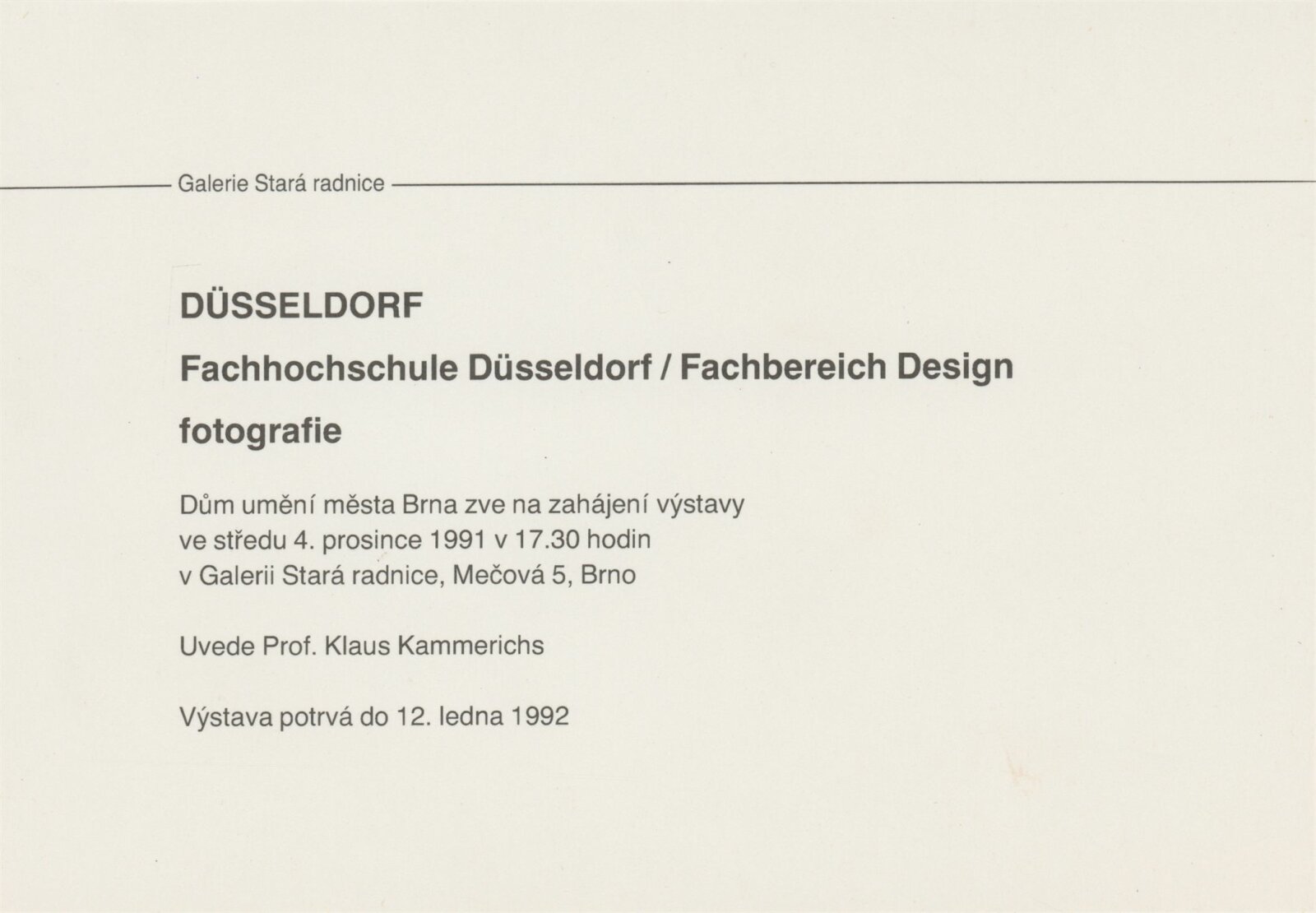 Düsseldorf. Fachhochschule Düsseldorf. Fachbereich Design. Fotografie: Galerie Stará radnice, Kabinet grafiky, podkroví, 4. 12. 1991 – 12. 1. 1992 / Převzatý katalog. Düsseldorf. Zeitgenössisches Schmuckdesign und experimentelle Photographie aus dem Fachbereich Design, Fachhochschule für Grafik und Design, Düsseldorf: Kent Institute of Art and Design at Maidstone, 15. 9. – 9. 11. 1990 / Texty: Helfried Hegenberg, David Ferry, Klaus Kammerichs. – Maidstone, Kent: Kent Institute of Art a.Design, 1990. – 27 s., obr., text německy a anglicky, GSR 111