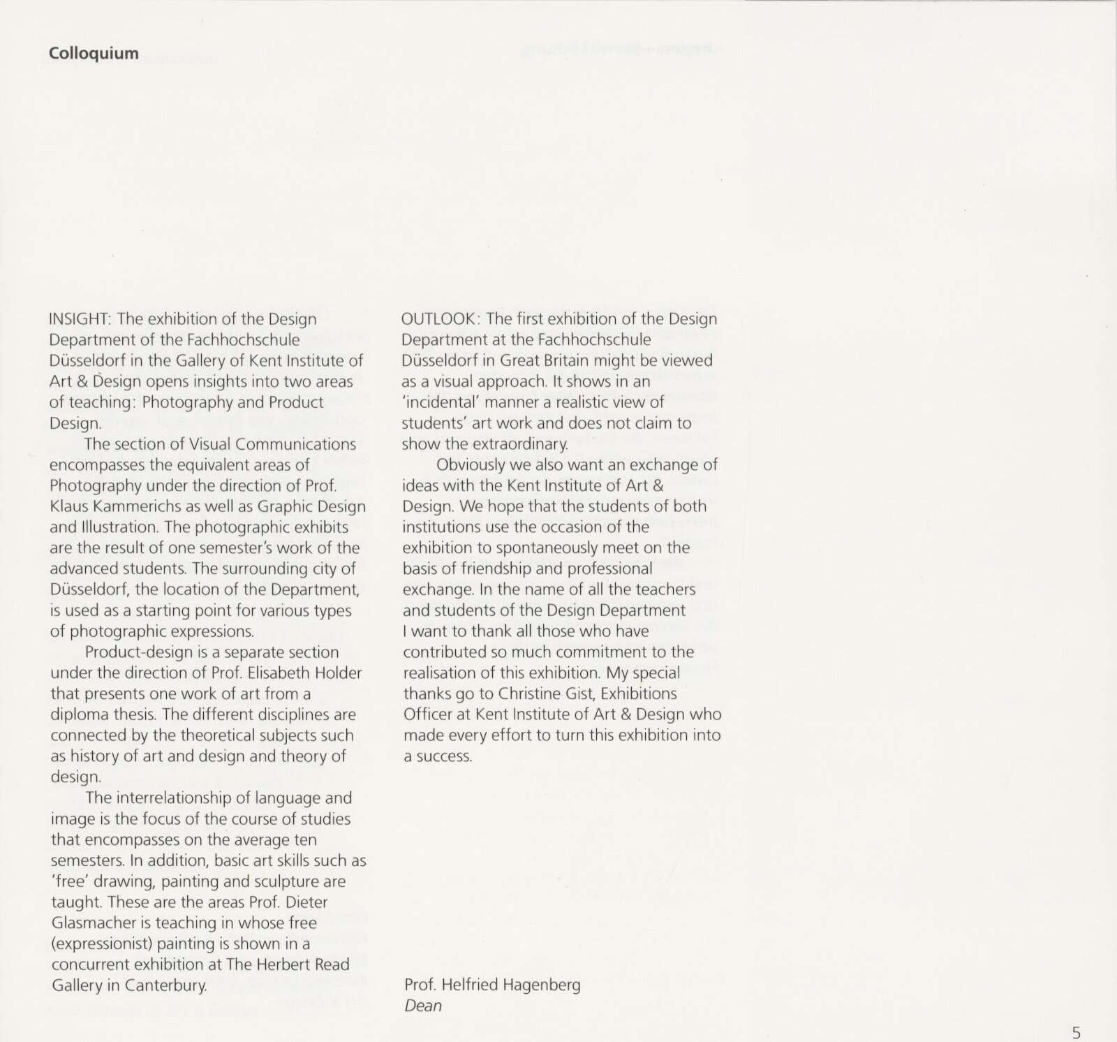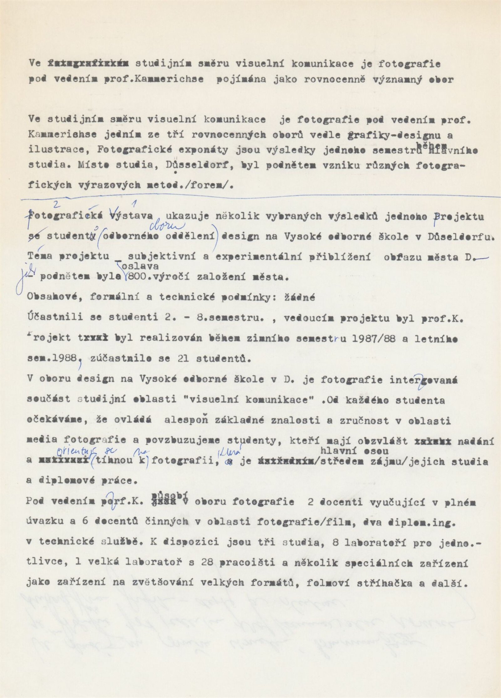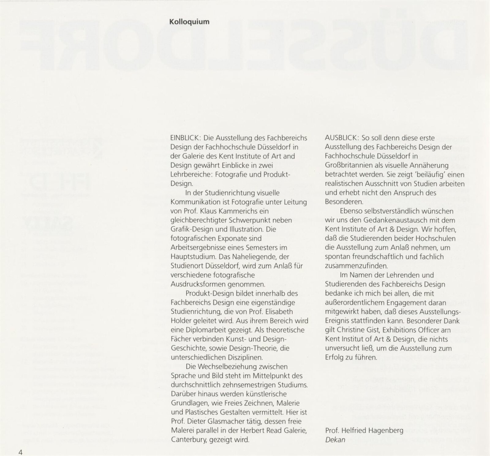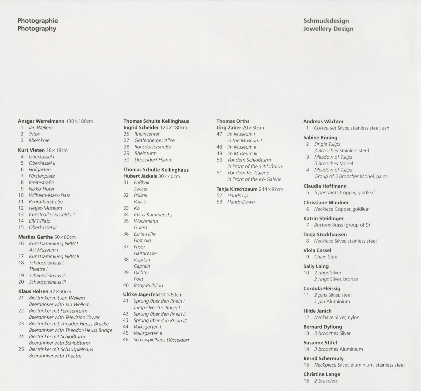 Düsseldorf. Fachhochschule Düsseldorf. Fachbereich Design. Fotografie: Galerie Stará radnice, Kabinet grafiky, podkroví, 4. 12. 1991 – 12. 1. 1992 / Převzatý katalog. Düsseldorf. Zeitgenössisches Schmuckdesign und experimentelle Photographie aus dem Fachbereich Design, Fachhochschule für Grafik und Design, Düsseldorf: Kent Institute of Art and Design at Maidstone, 15. 9. – 9. 11. 1990 / Texty: Helfried Hegenberg, David Ferry, Klaus Kammerichs. – Maidstone, Kent: Kent Institute of Art a.Design, 1990. – 27 s., obr., text německy a anglicky, GSR 111