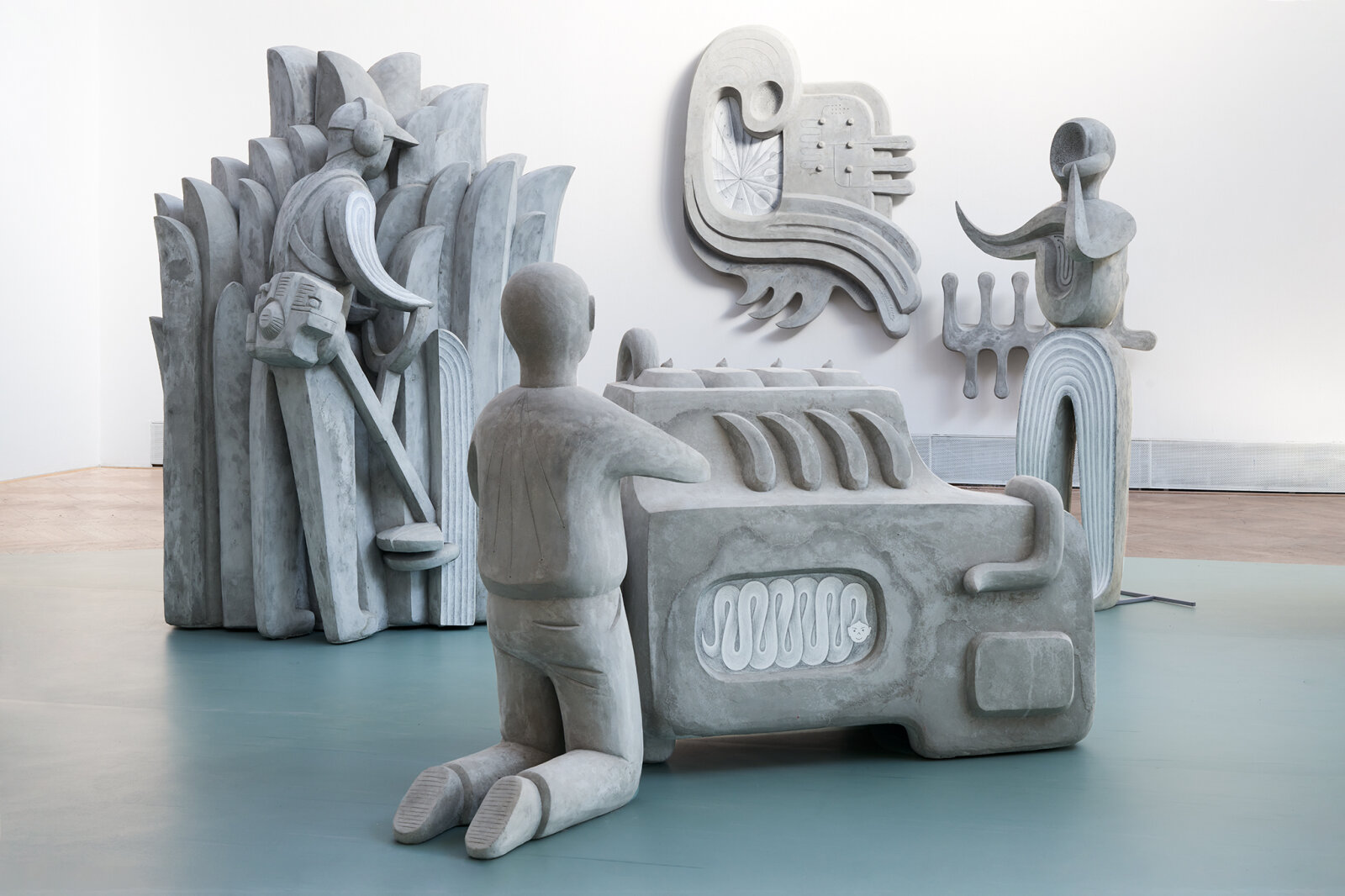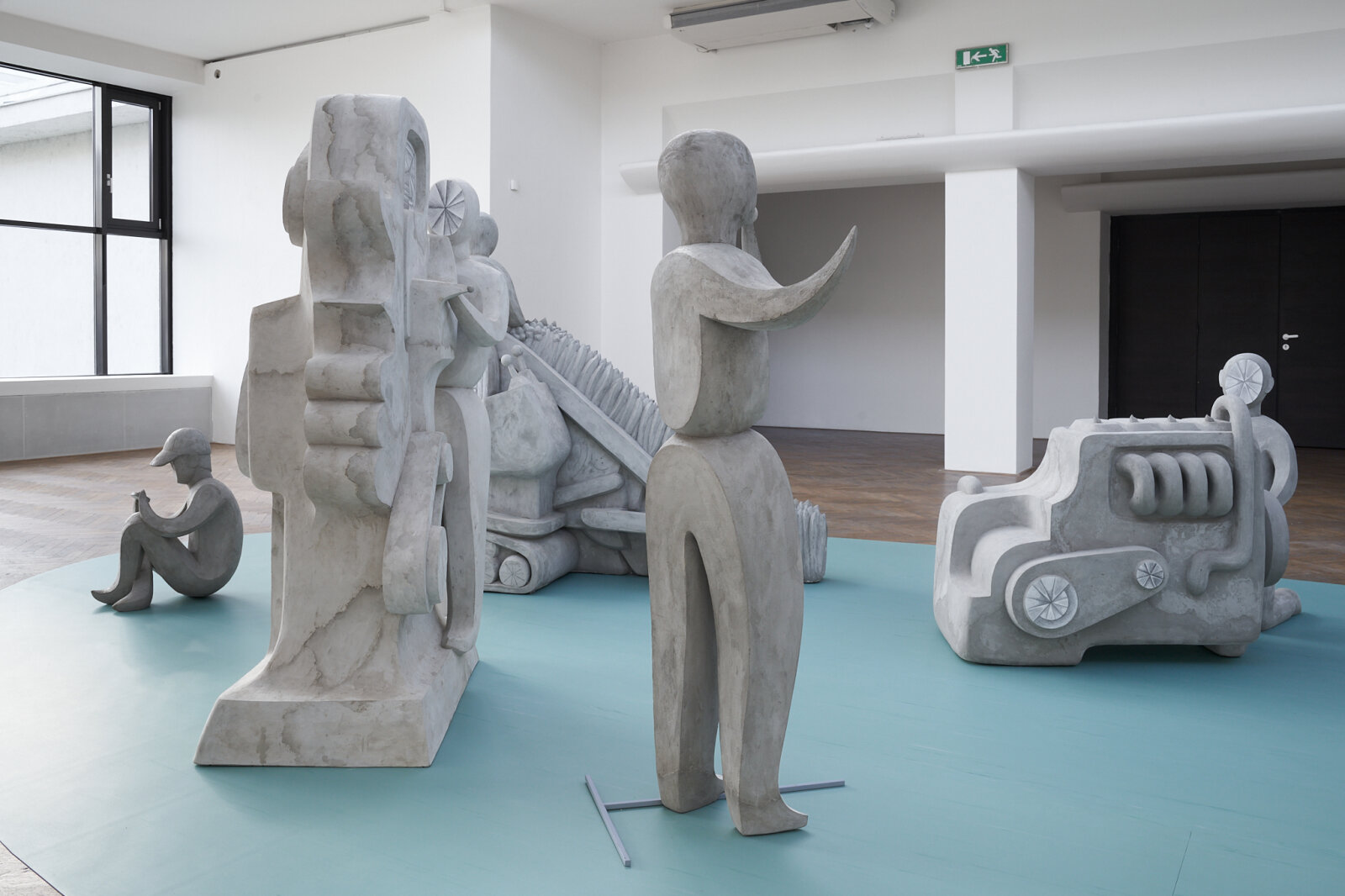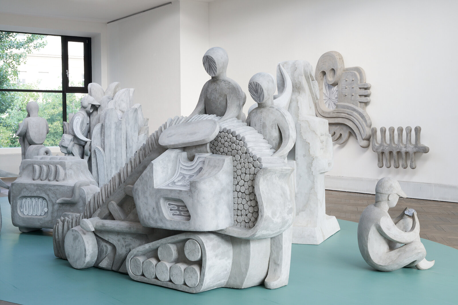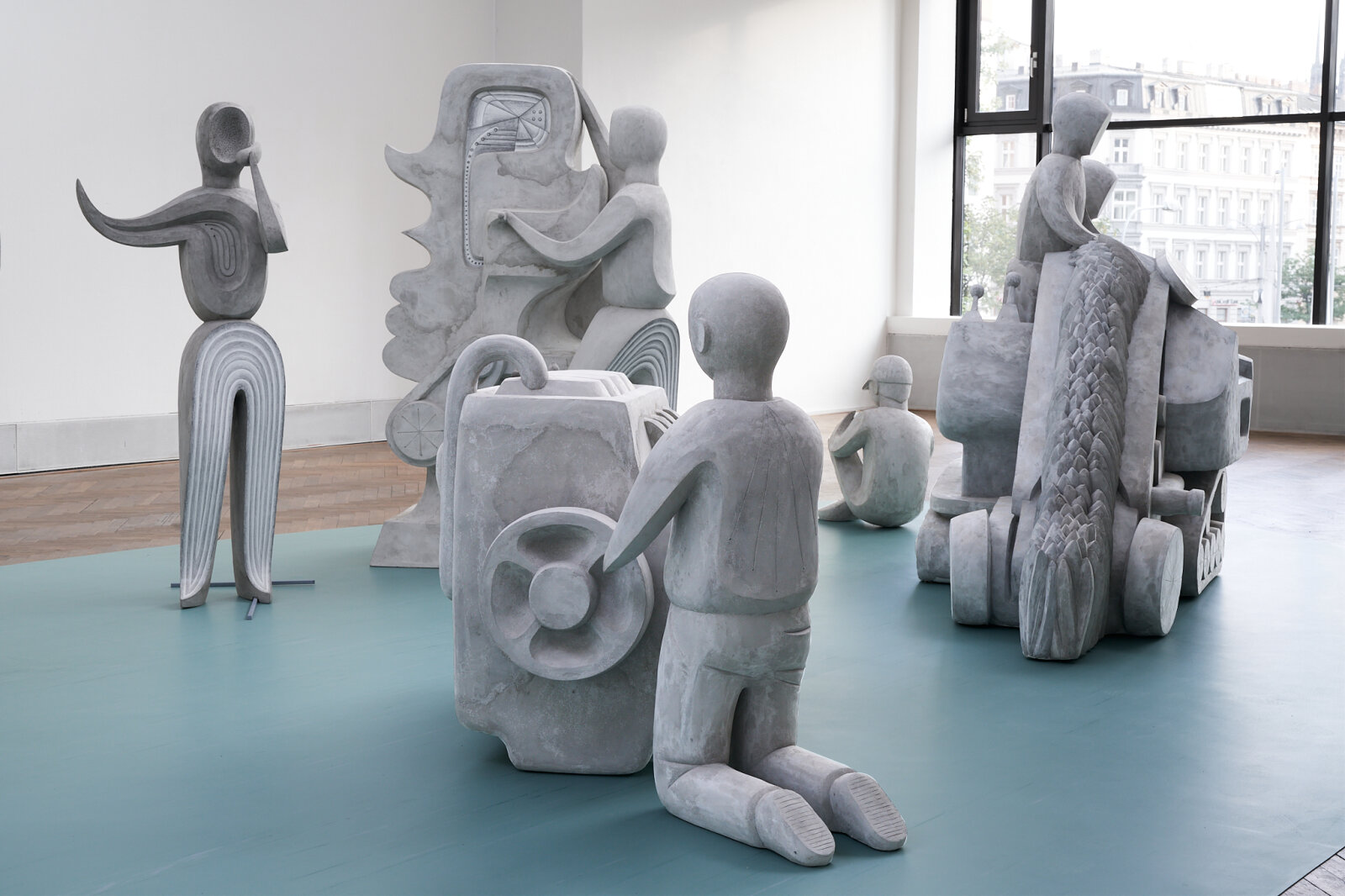 The installation of freely composed figurative concrete sculptures is approached by Anna Hulačová as a special kind of symbiosis or a hybrid integration of man and machine (specifically agricultural or technological devices). The stylised human figures devoid of individualised features resemble mechanised automatons interconnected with the machines they operate. Formally they refer to the interwar sculptural social civilism where the theme of the union of man and technology was perceived as a positive utopian gesture; references to modernist abstraction are also evident, primarily in surfaces with linear drawing creating a contrast to the full sculptural form. We can also find references to socialist realism with its subjects of labour and a unified collectivised society. The layering and combining of these equivocal motifs from the past leads us down the trail of the relationship between man and technology, which regardless of the utopian vision has become a tool for the devastation of nature. All of these aspects, which in today‘s world take the form of centralisation, close links with the latest technologies, genetic engineering and replacement of humans by robots in the near future, take a course leading rather to a dystopian scenario, but above all show the cycle of production and consumption against the backdrop of a wider context and historical background.