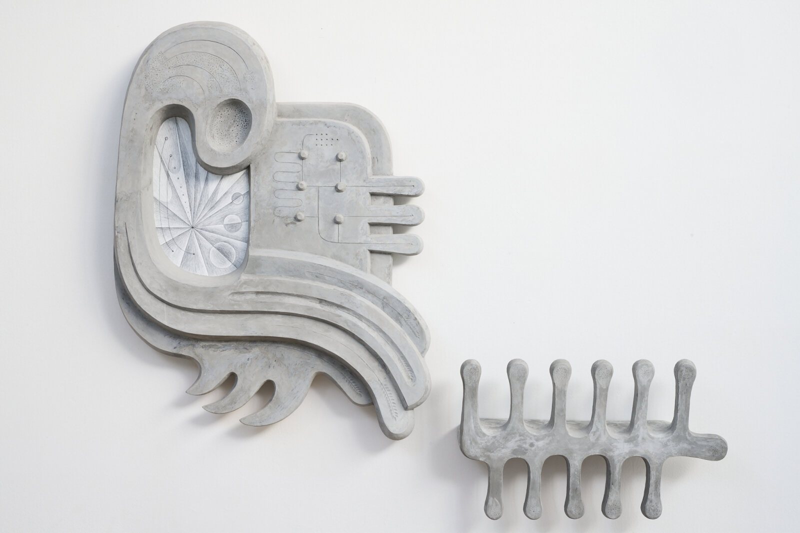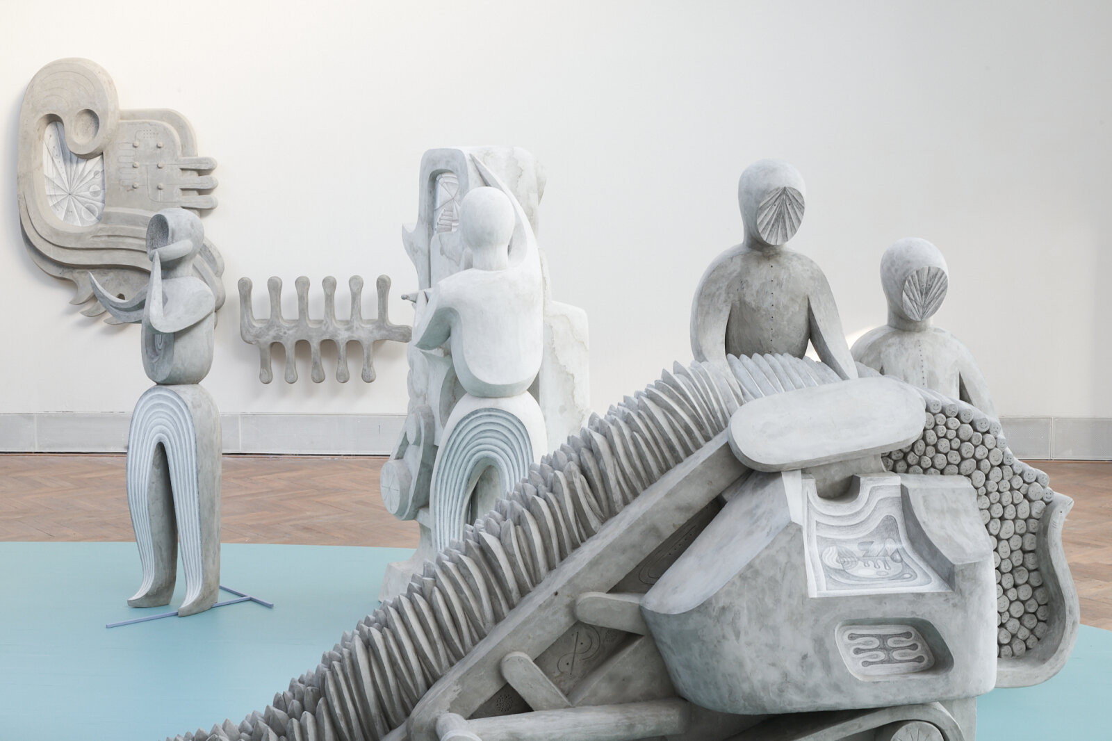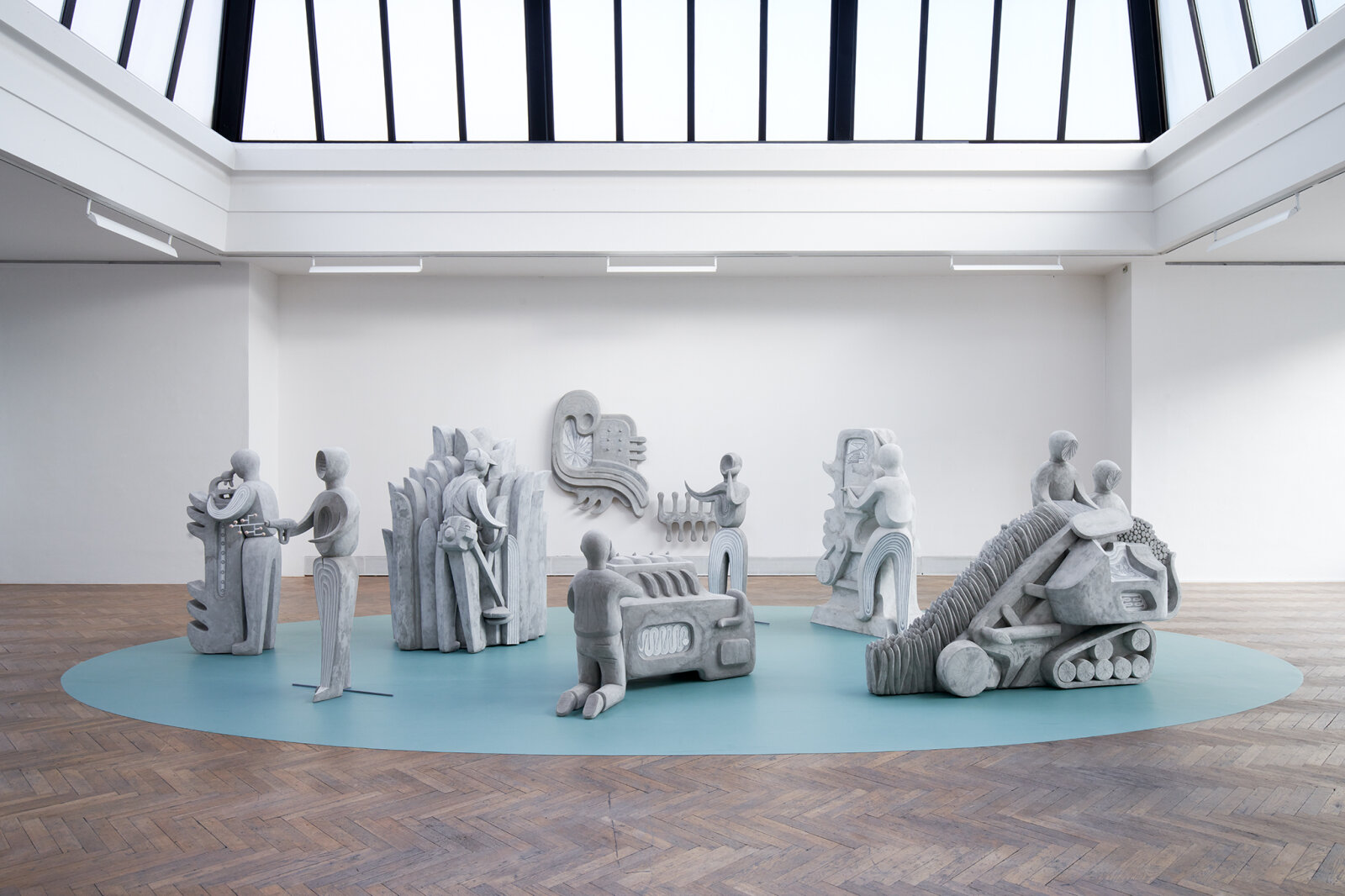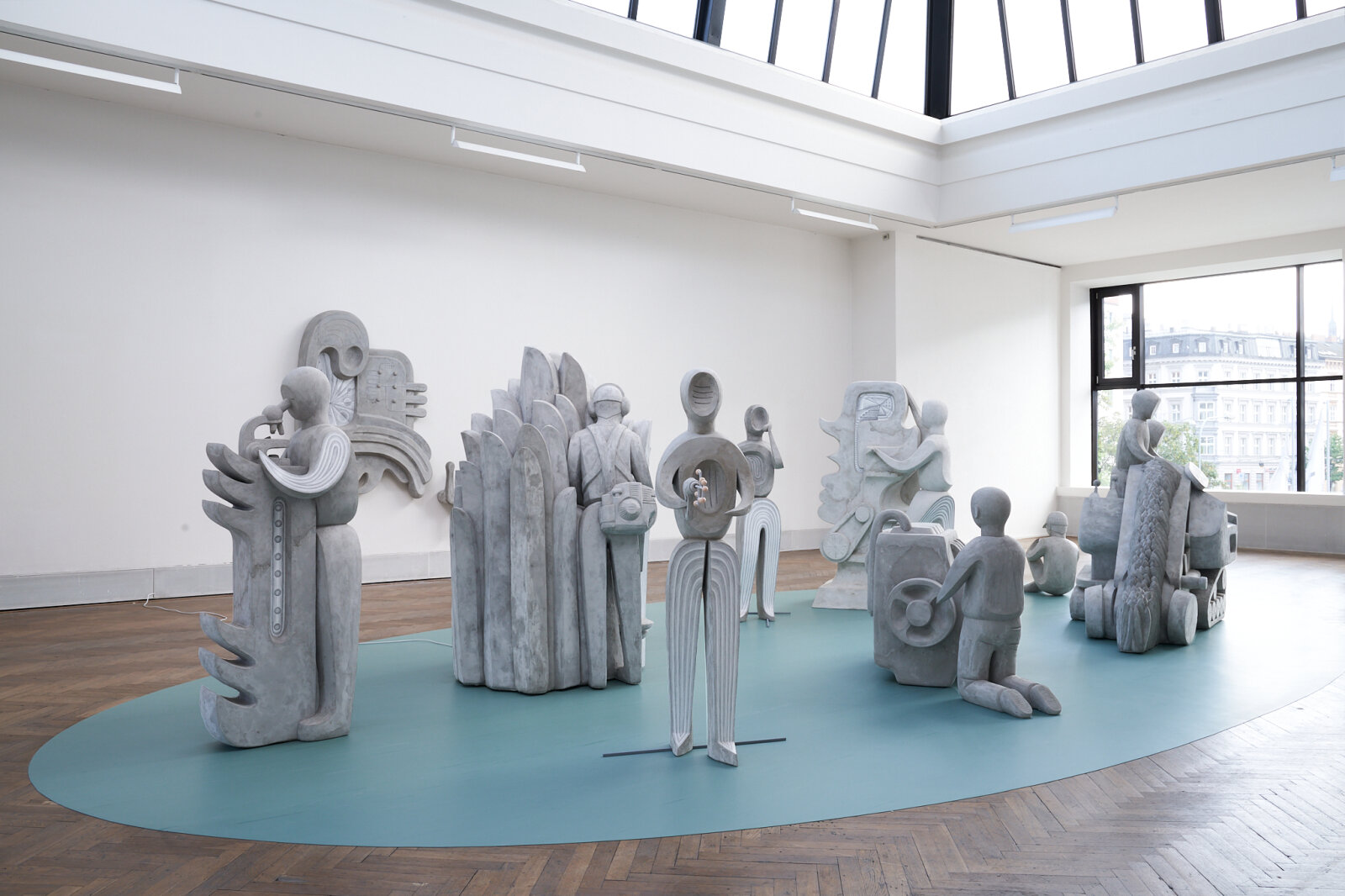 The installation of freely composed figurative concrete sculptures is approached by Anna Hulačová as a special kind of symbiosis or a hybrid integration of man and machine (specifically agricultural or technological devices). The stylised human figures devoid of individualised features resemble mechanised automatons interconnected with the machines they operate. Formally they refer to the interwar sculptural social civilism where the theme of the union of man and technology was perceived as a positive utopian gesture; references to modernist abstraction are also evident, primarily in surfaces with linear drawing creating a contrast to the full sculptural form. We can also find references to socialist realism with its subjects of labour and a unified collectivised society. The layering and combining of these equivocal motifs from the past leads us down the trail of the relationship between man and technology, which regardless of the utopian vision has become a tool for the devastation of nature. All of these aspects, which in today‘s world take the form of centralisation, close links with the latest technologies, genetic engineering and replacement of humans by robots in the near future, take a course leading rather to a dystopian scenario, but above all show the cycle of production and consumption against the backdrop of a wider context and historical background.