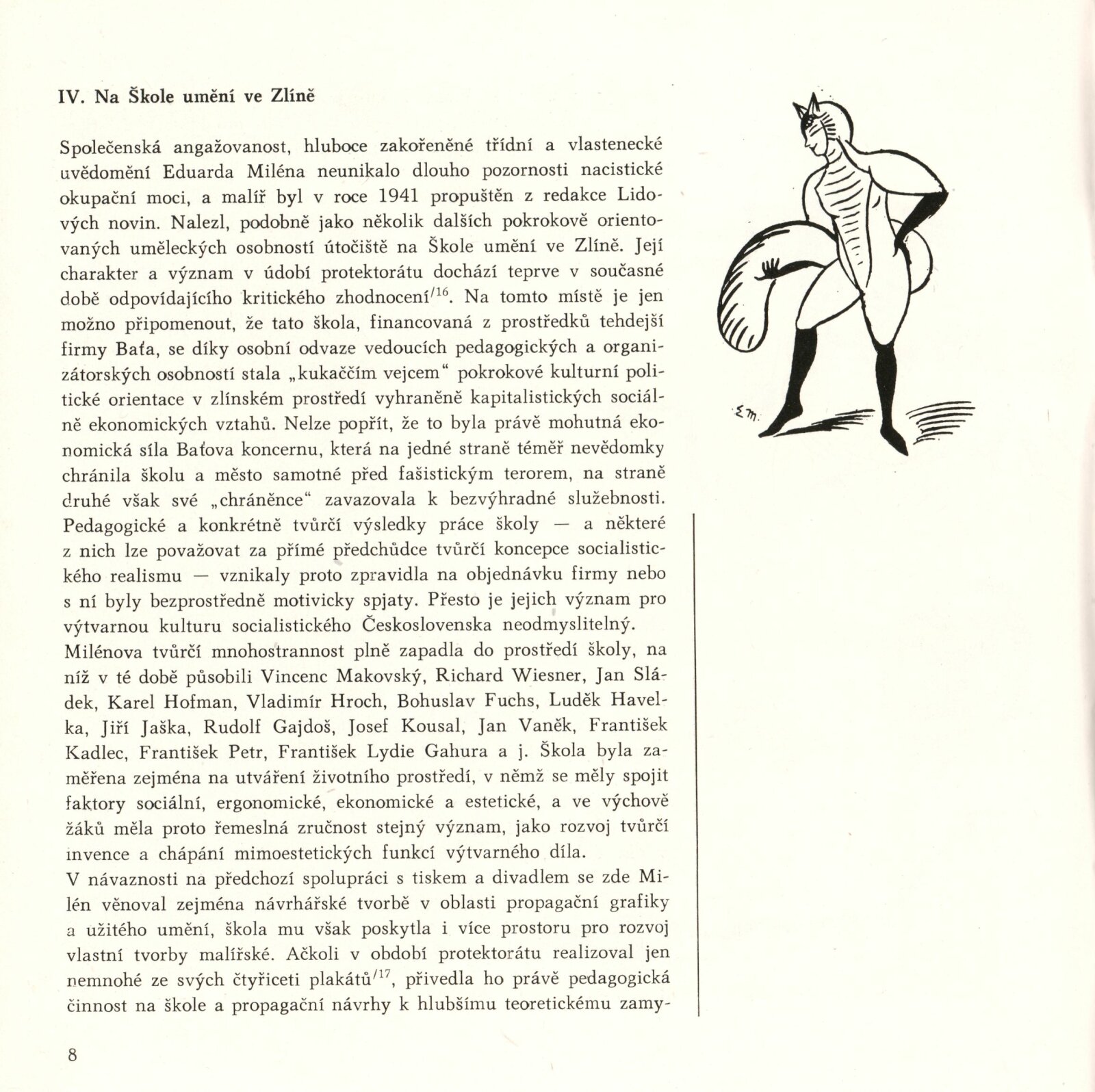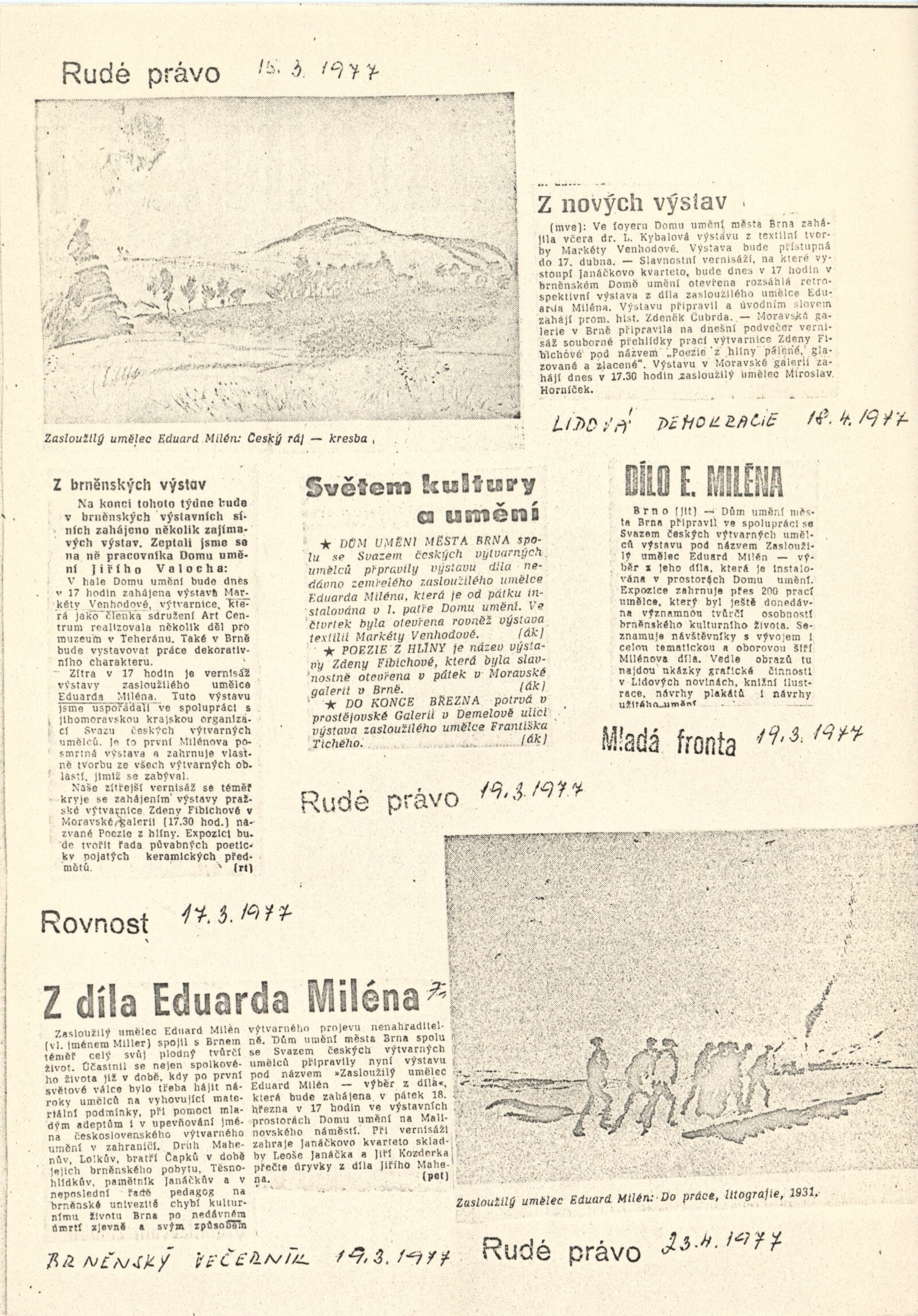 Eduard Milén. Výběr z díla: Dům umění města Brna, 18. 3. – 17. 4. 1977 / Text: Zdeněk Čubrda. – Brno: DUmB, 1977. – 26 s., 26 s., obr. příl., seznam vystavených prací 12 s., portrét, životopis, seznam výstav, prací pro architekturu, bibliografie, DU 652. – MZK; MMB
