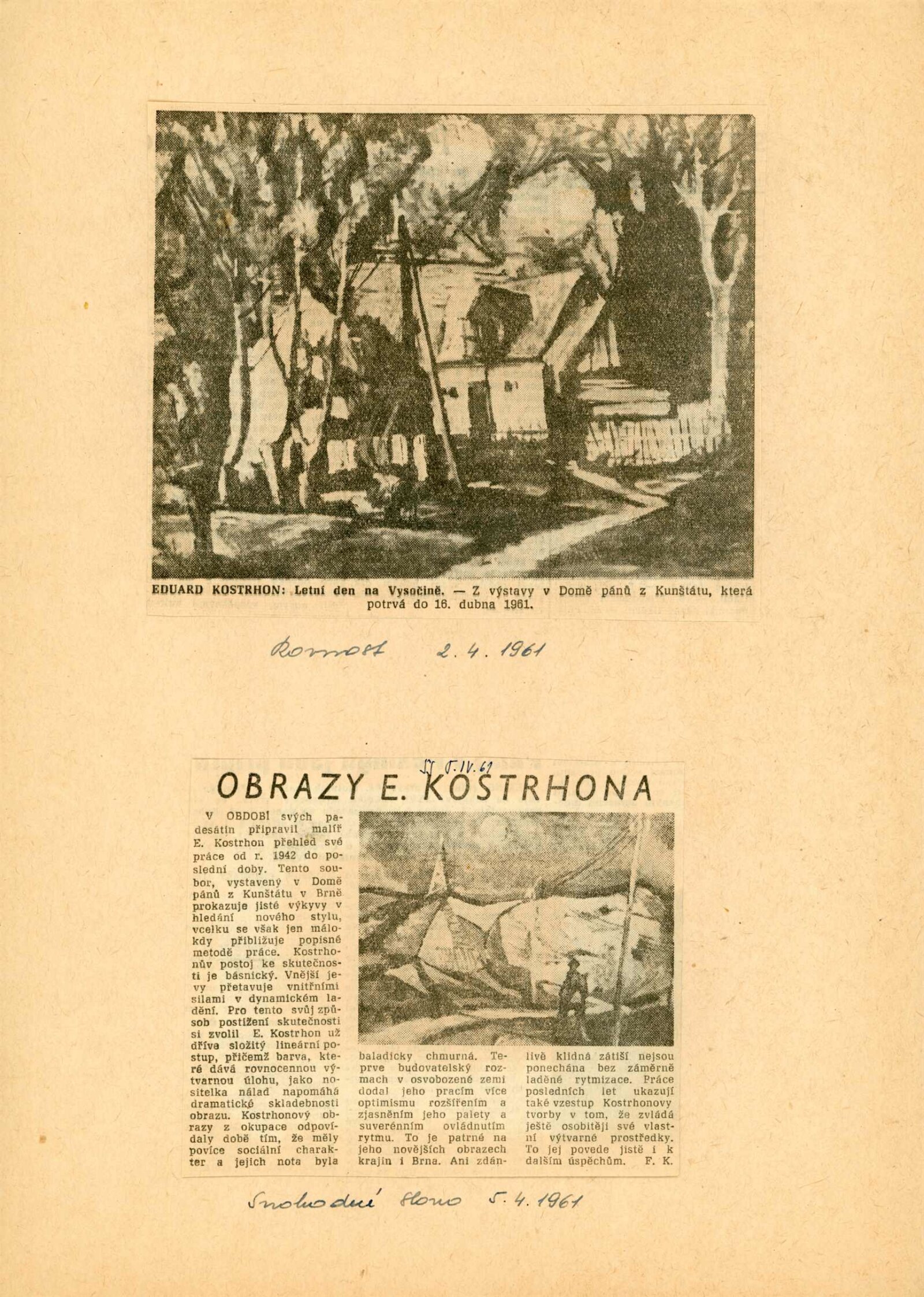 Eduard S. Kostrhon. Obrazy 1940–1960: Dům umění města Brna / Dům pánů z Kunštátu, 18. 3. – 16. 4. 1961 / Text: Václav Zykmund. – Brno: SČSVU, 1961. – 8 s., obr., báseň Karel Kapoun, životopis, DPK 102. – MG; MMB
