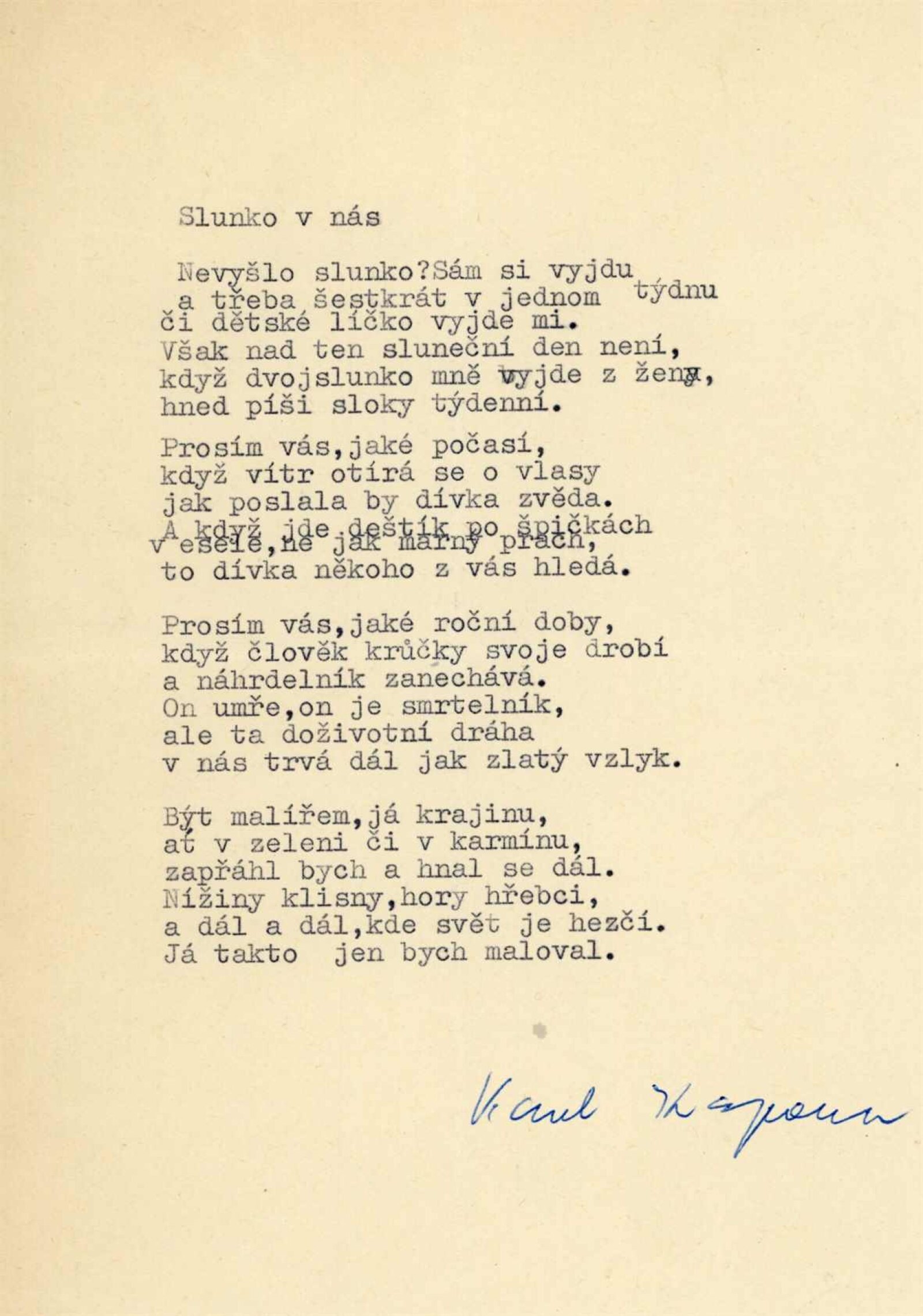 pozvánka, katalog, úvodní slovo (Ludvík Kundera), báseň Slunko v nás (Karel Kapoun), strojopis katalogu, podmínky pro uspořádání výstavy, seznam vystavených prací, recenze v tisku