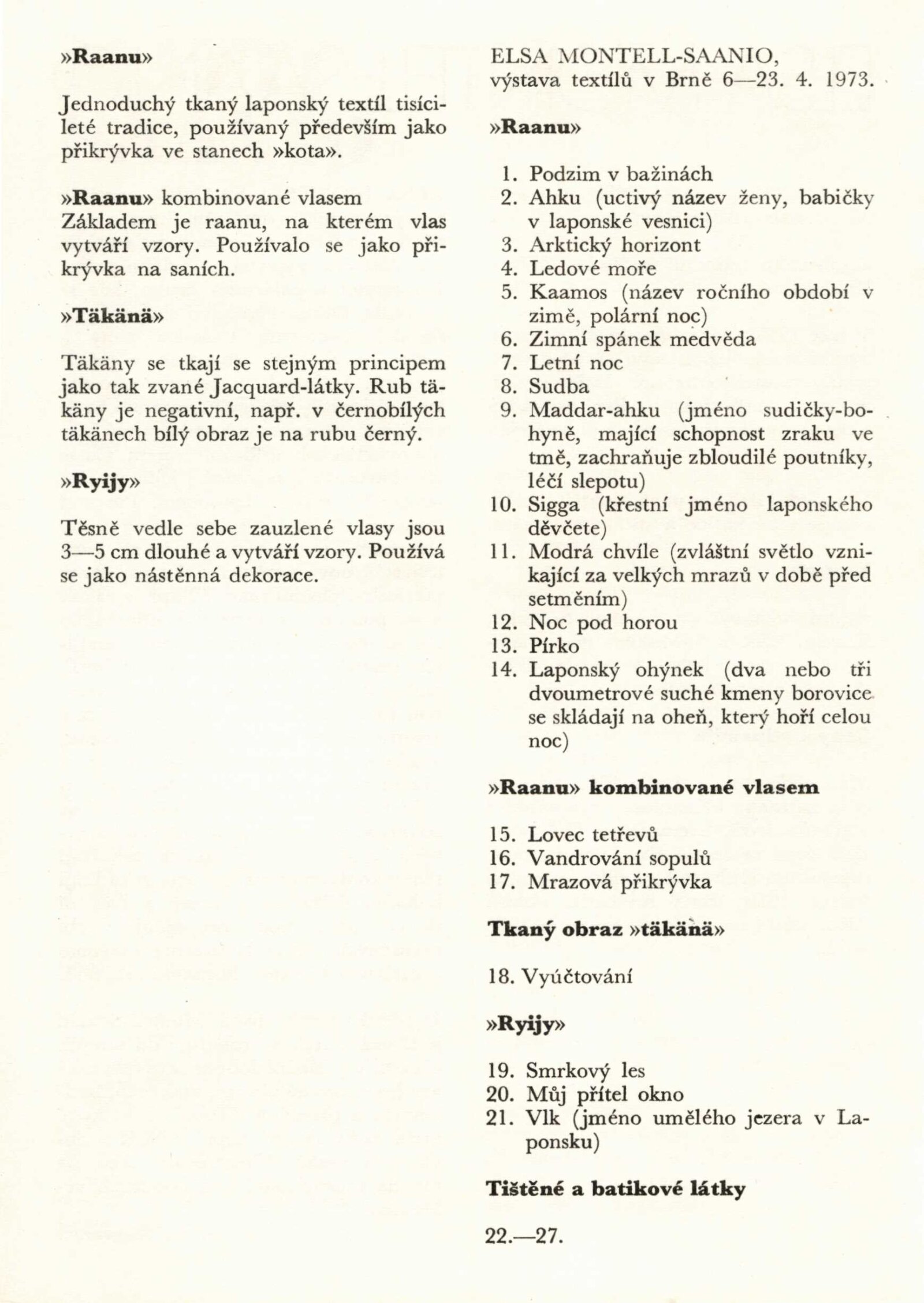Elsa Montell-Saanio. Tapiserie. Matti Saanio Fotografie: Dům umění města Brna 6. 4. – 27. 4. 1973 / Text: Anna-Liisa Ahmavaara. Brno: DUmB, 1973. – 4 s., 4 s. obr., životopisy, DU 587. – MG