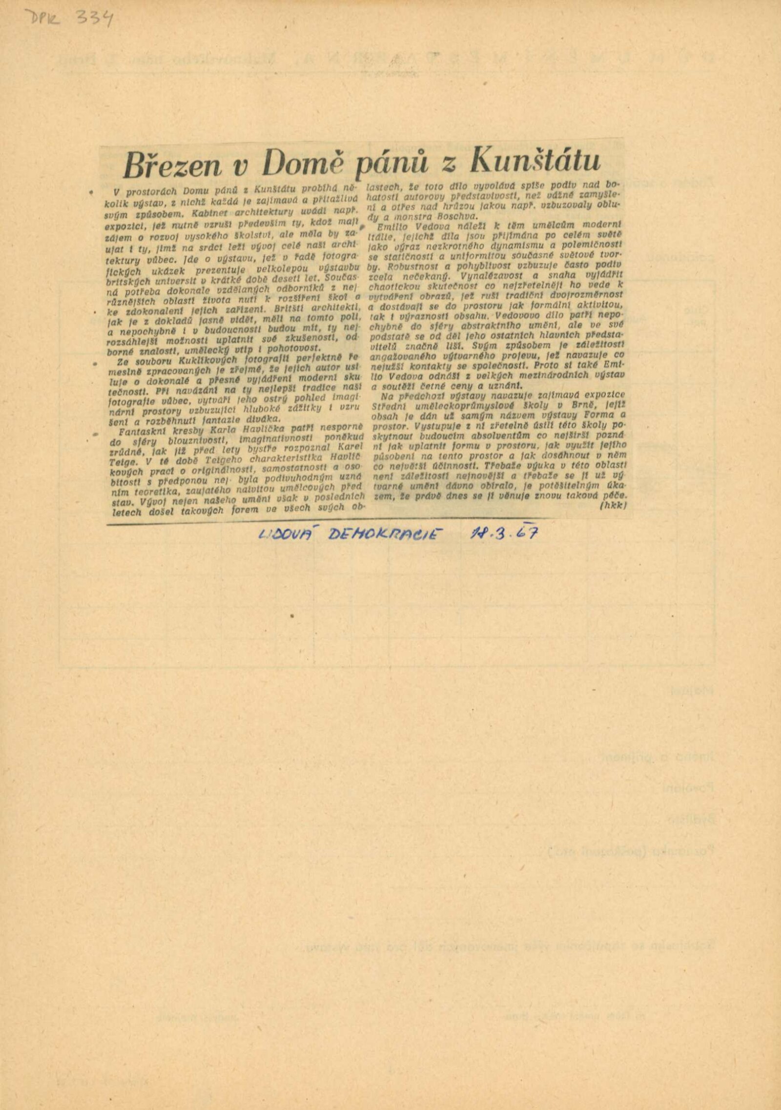 Emilio Vedova /IT/: Dům umění města Brna / Dům pánů z Kunštátu, 1. patro, 5. 3. – 9. 4. 1967/ Převzatý katalog. Emilio Vedova: Galerie Hollar, Praha, 18. 1. – 19. 2. 1967/ Text: Miroslav Míčko. – Praha: SČSVU, 1967. – 16 s., obr., DPK 334. – MZK; MG
