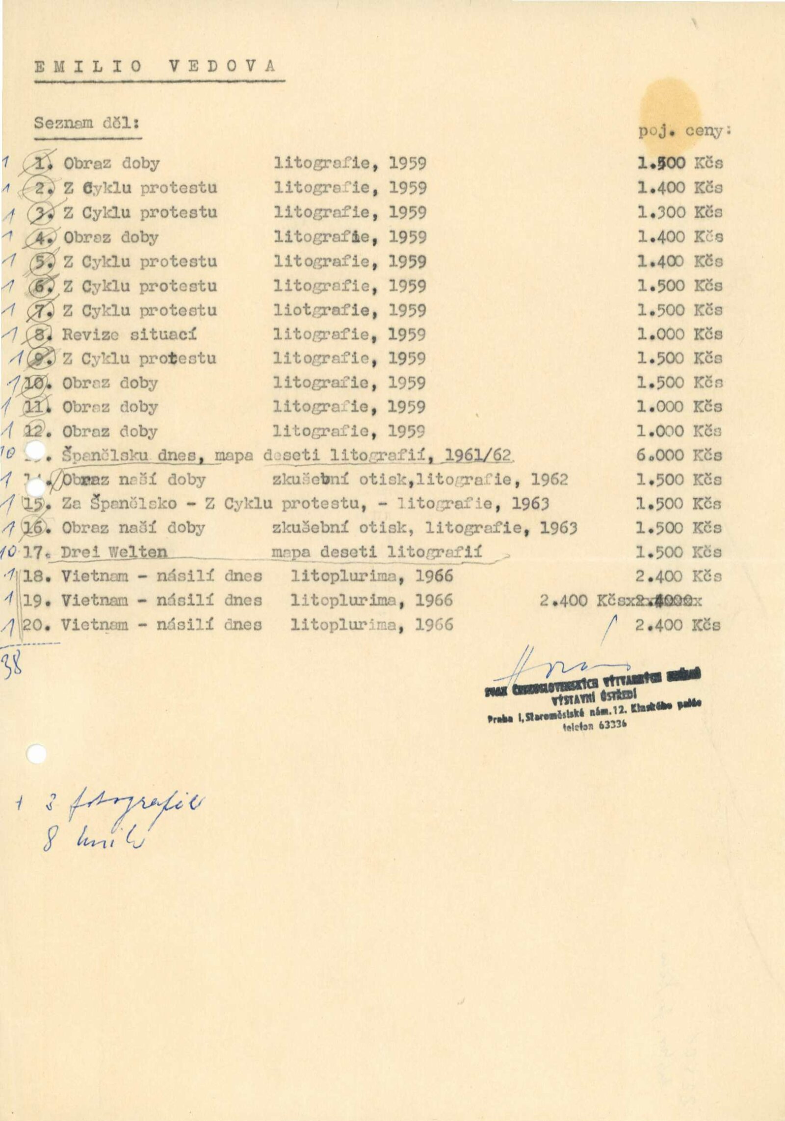 seznam děl, fotografie z výstavy, korespondence, recenze v tisku, katalog převzaté výstavy (Hollar Praha)