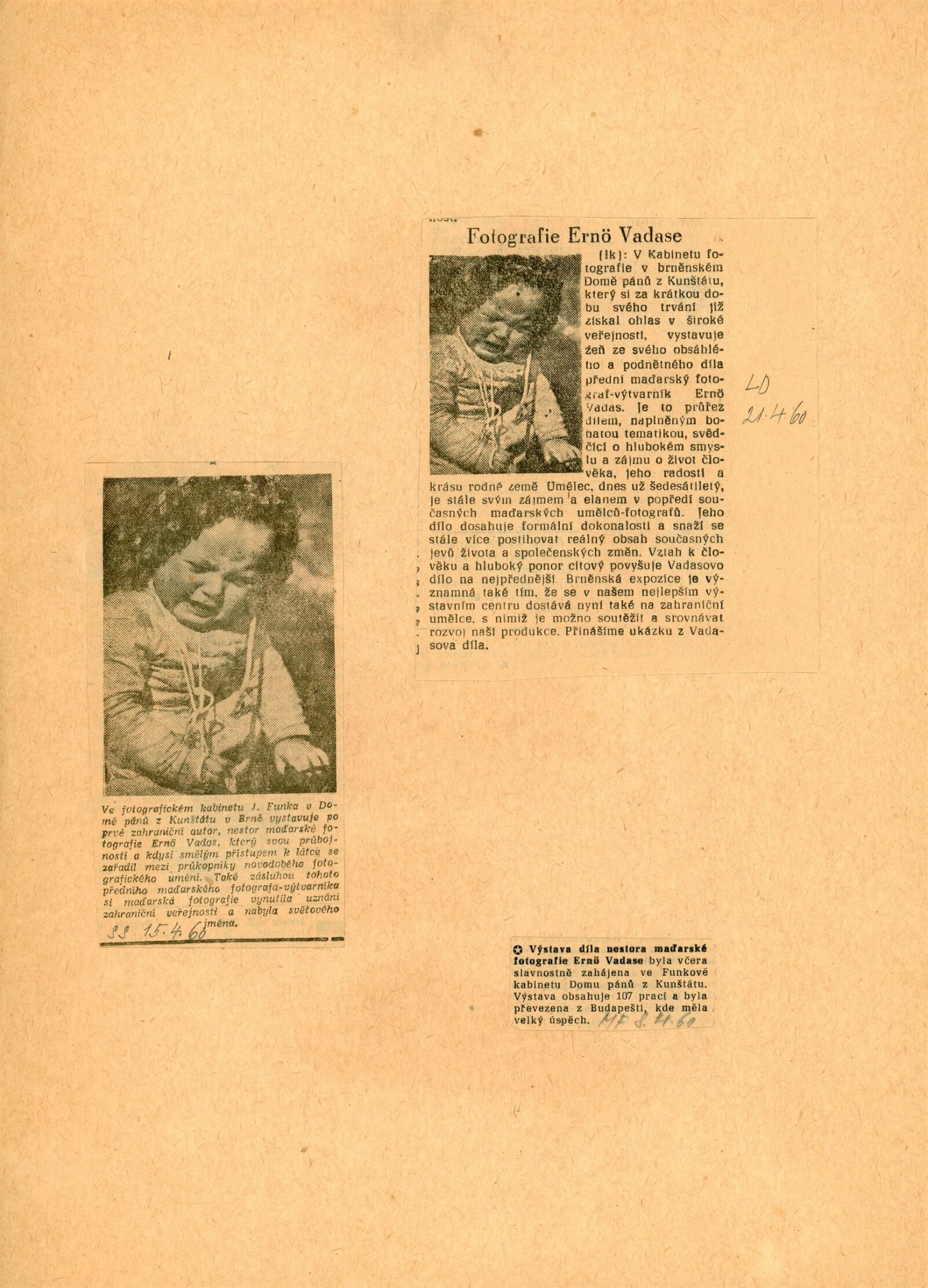 Ernö Vadas: Dům umění města Brna / Dům pánů z Kunštátu, 12. výstava Kabinetu fotografie Jaromíra Funka, 7. 4. – 1. 5. 1960 / Text: Emil Szegedi. – Brno: DUmB, 1960. – skládačka, 6 s., obr., DPK 65. – MG