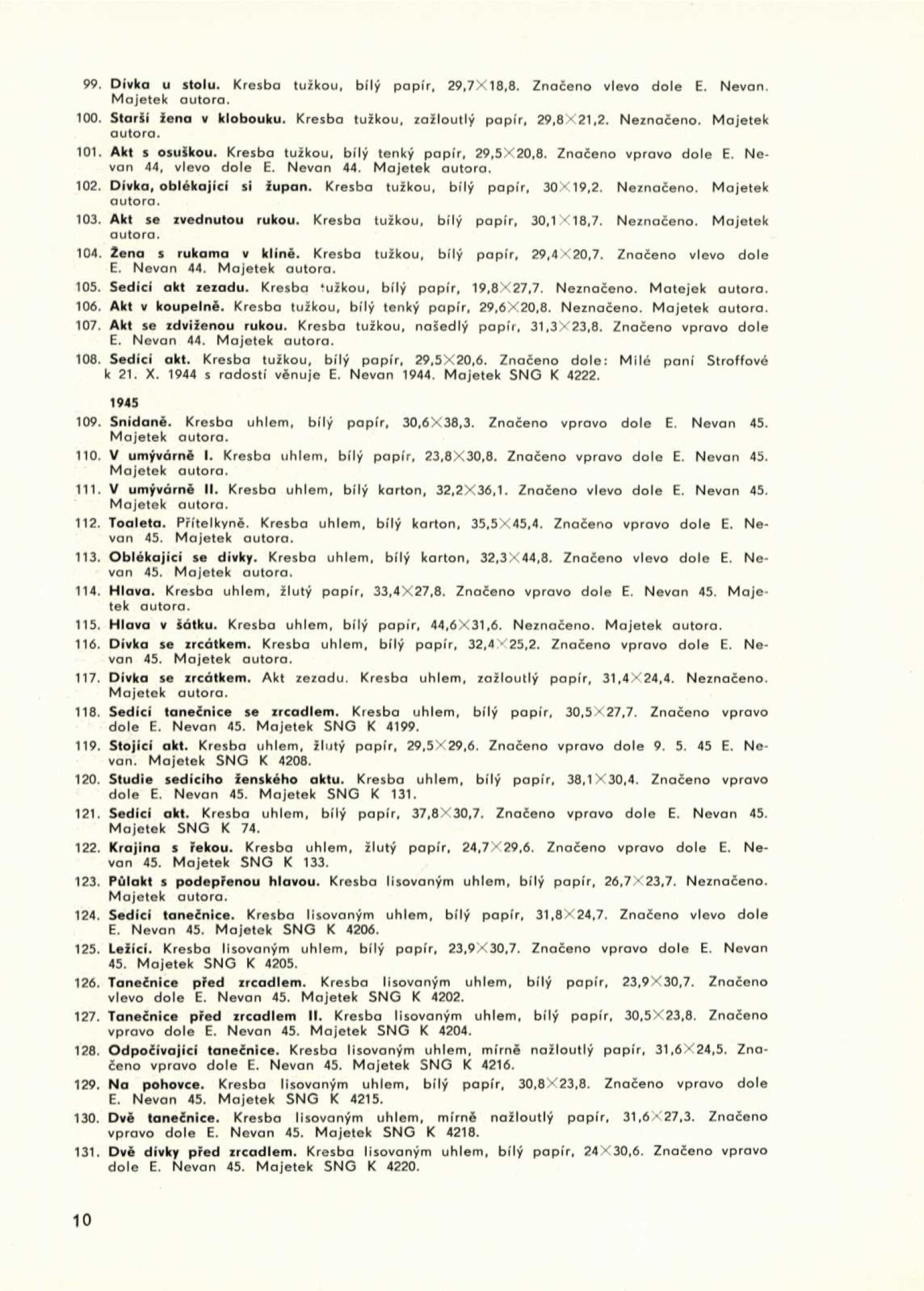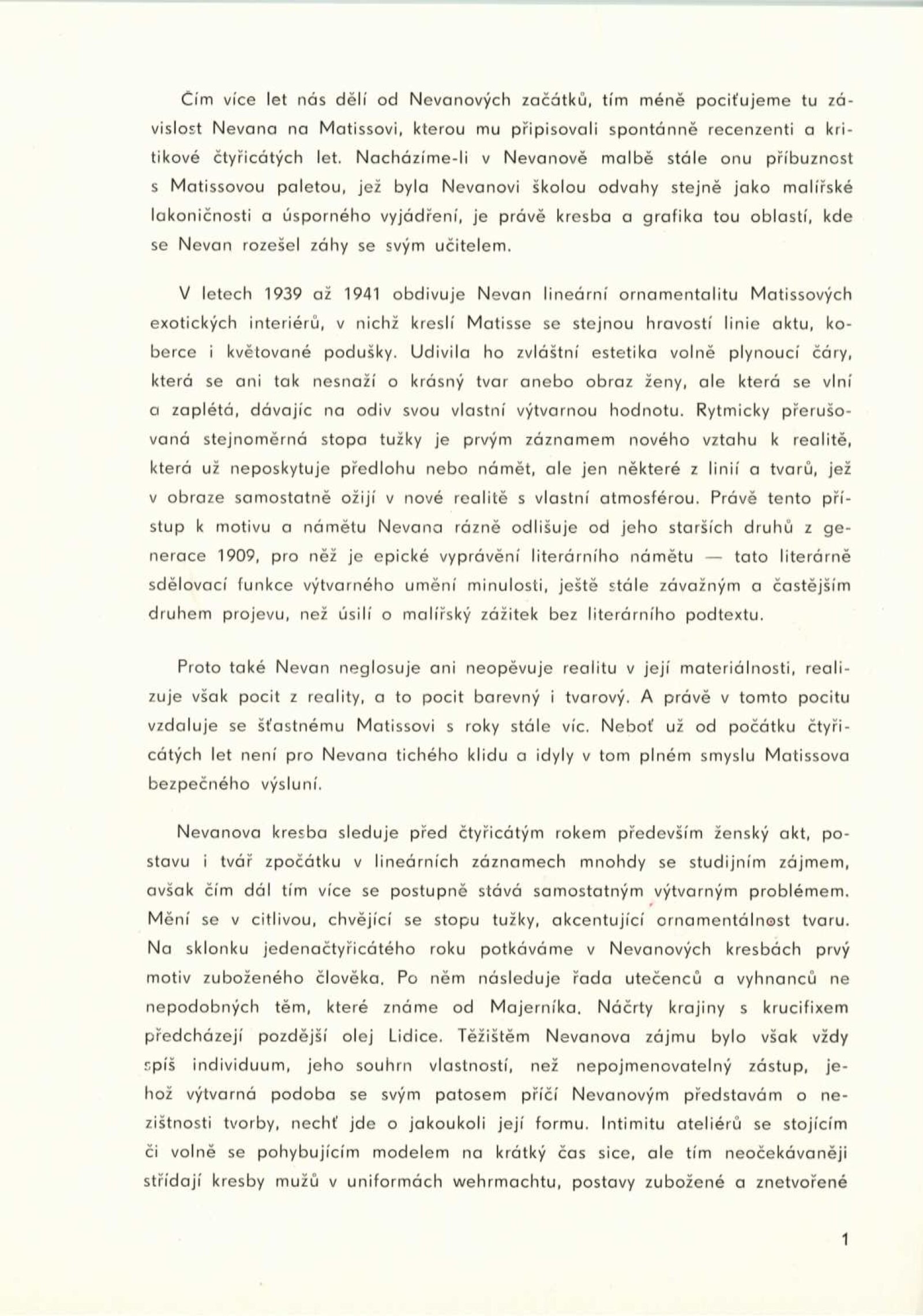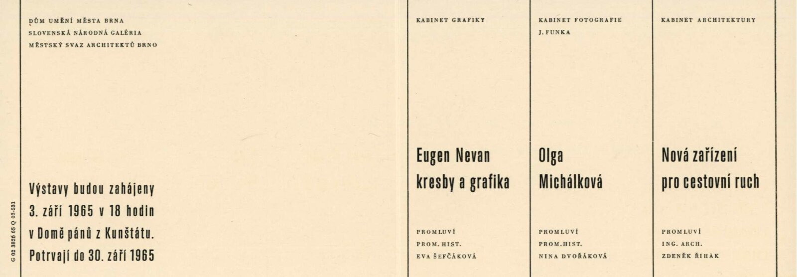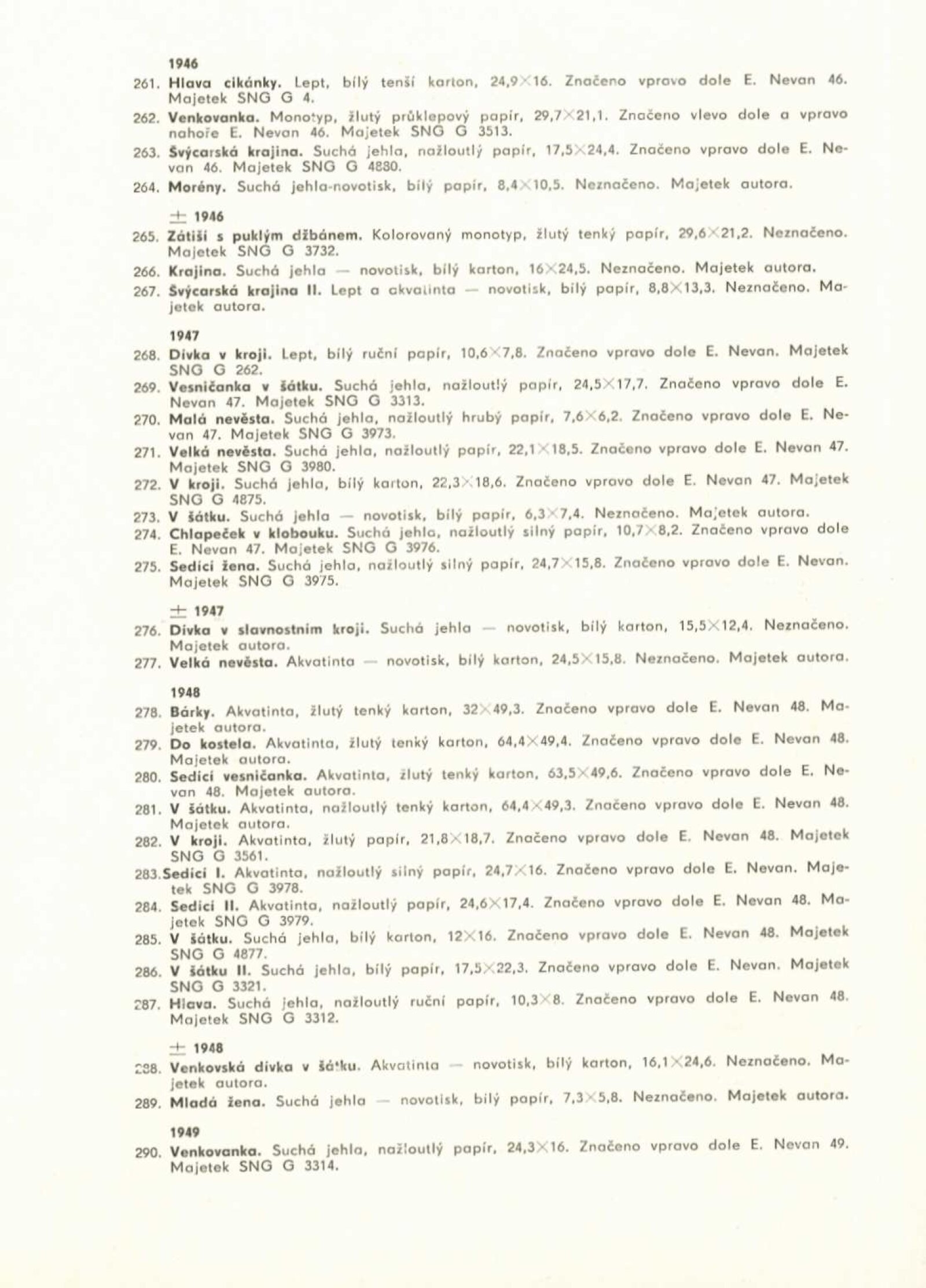 Eugen Nevan. Kresby a grafika: Dům umění města Brna / Dům pánů z Kunštátu, 68. výstava Kabinetu grafiky, 3. 9. – 3. 10. 1965 / Text: Eva Šefčáková. – Brno: DUmB, 1965. – 17 s., obr., životní data, DPK 277. – MZK; MG; MMB