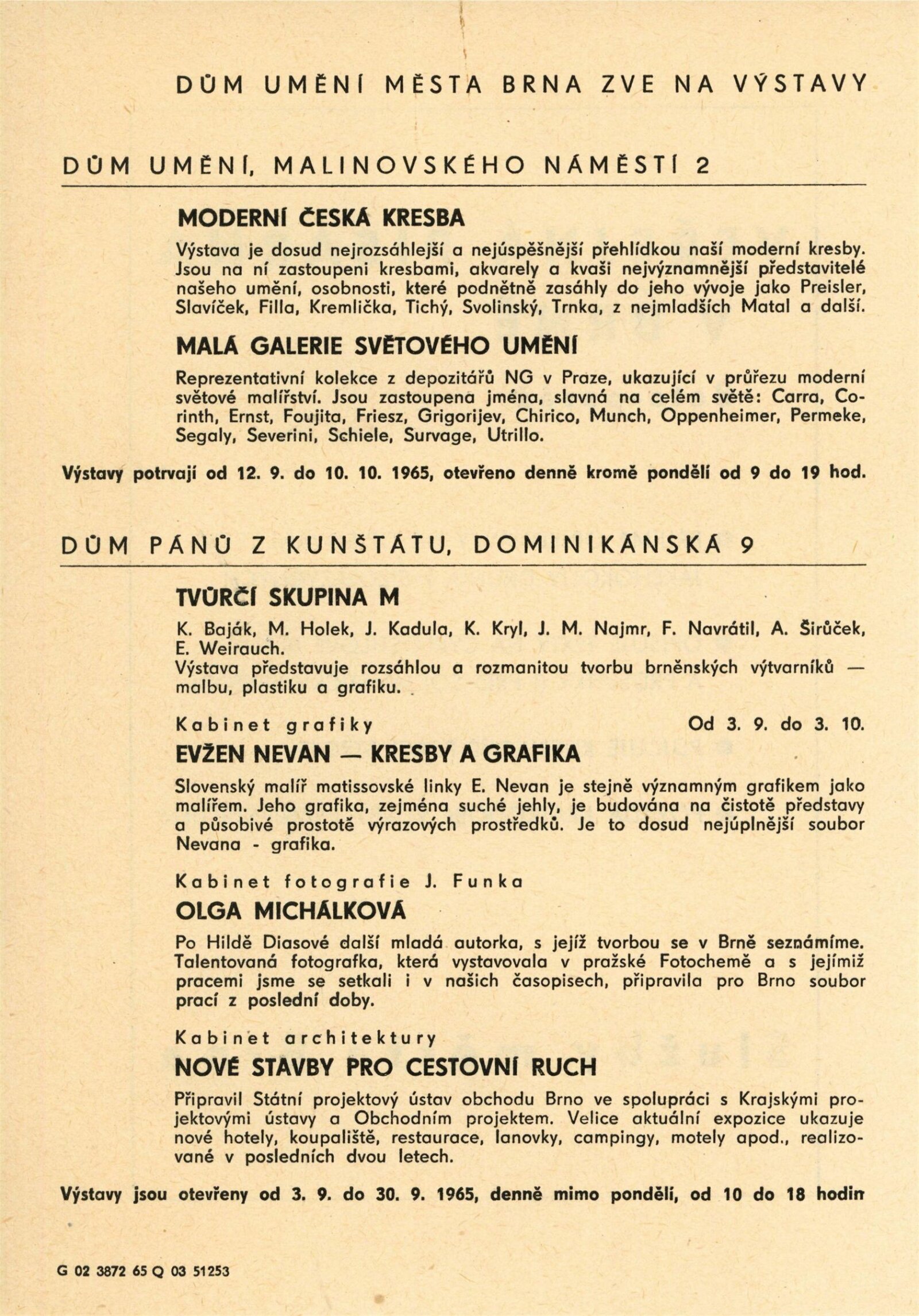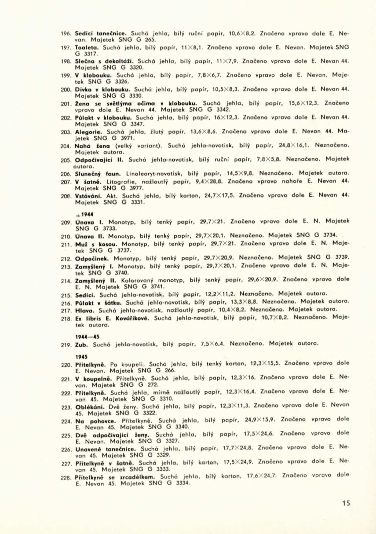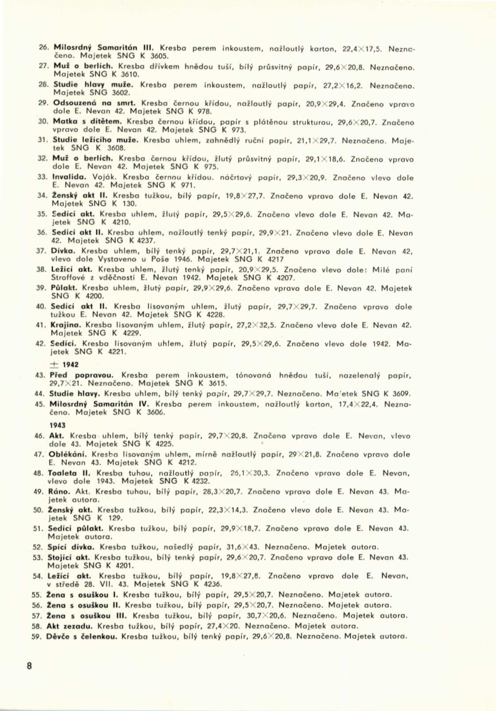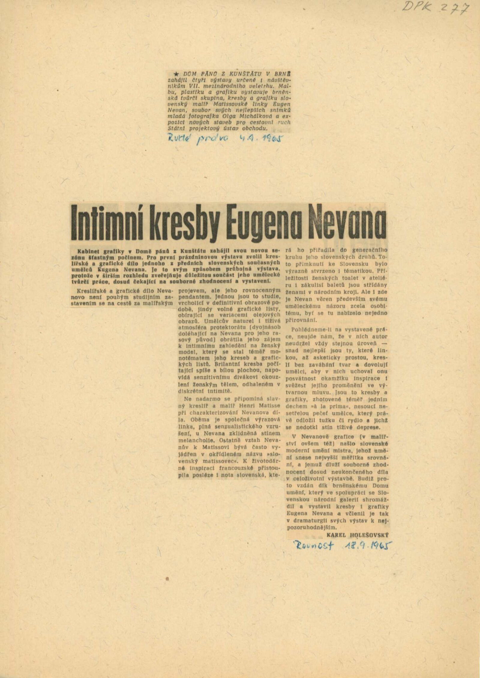 Eugen Nevan. Kresby a grafika: Dům umění města Brna / Dům pánů z Kunštátu, 68. výstava Kabinetu grafiky, 3. 9. – 3. 10. 1965 / Text: Eva Šefčáková. – Brno: DUmB, 1965. – 17 s., obr., životní data, DPK 277. – MZK; MG; MMB