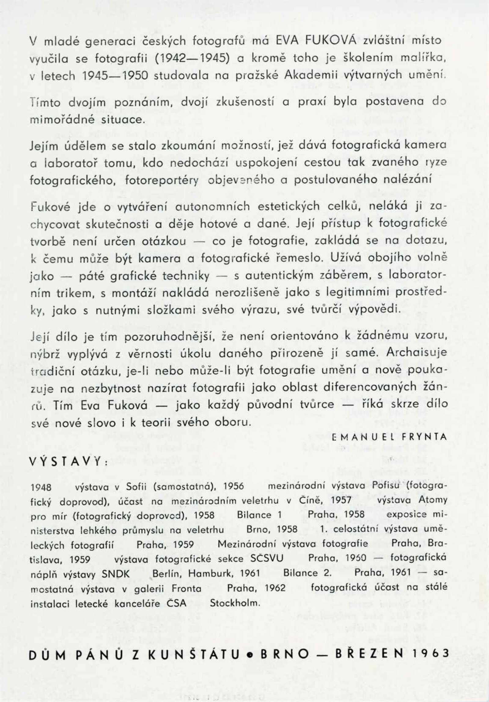 Eva Fuková. 100 fotografií: Dům umění města Brna / Dům pánů z Kunštátu, 42. výstava Kabinetu fotografie Jaromíra Funka, 9. 3. – 31. 3. 1963 / Text: Emanuel Frynta. – Brno: DUmB, 1963. – 6 s., obr., DPK 187. – MG