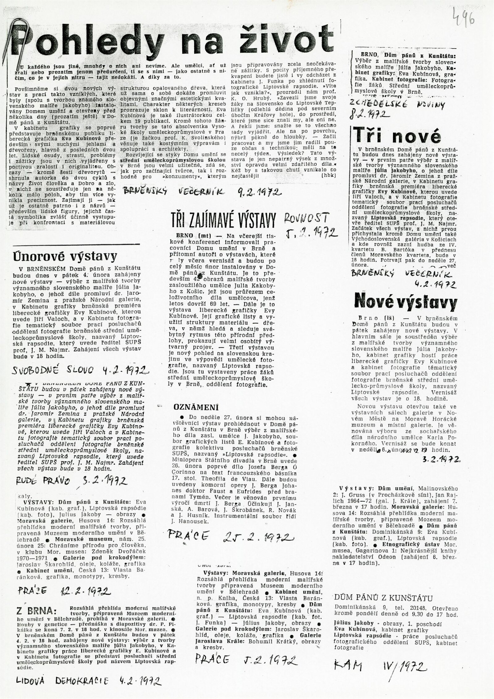 Eva Kubínová. Grafika: Dům umění města Brna / Dům pánů z Kunštátu, 129. výstava Kabinetu grafiky, 4. 2. – 27. 2. 1972 / Text: Jiří Valoch. – Brno: DUmB, 1972. – 12 s., obr., životní data, kostýmní výpravy, realizace v architektuře, výstavy, DPK 496. – MZK; MG; MMB