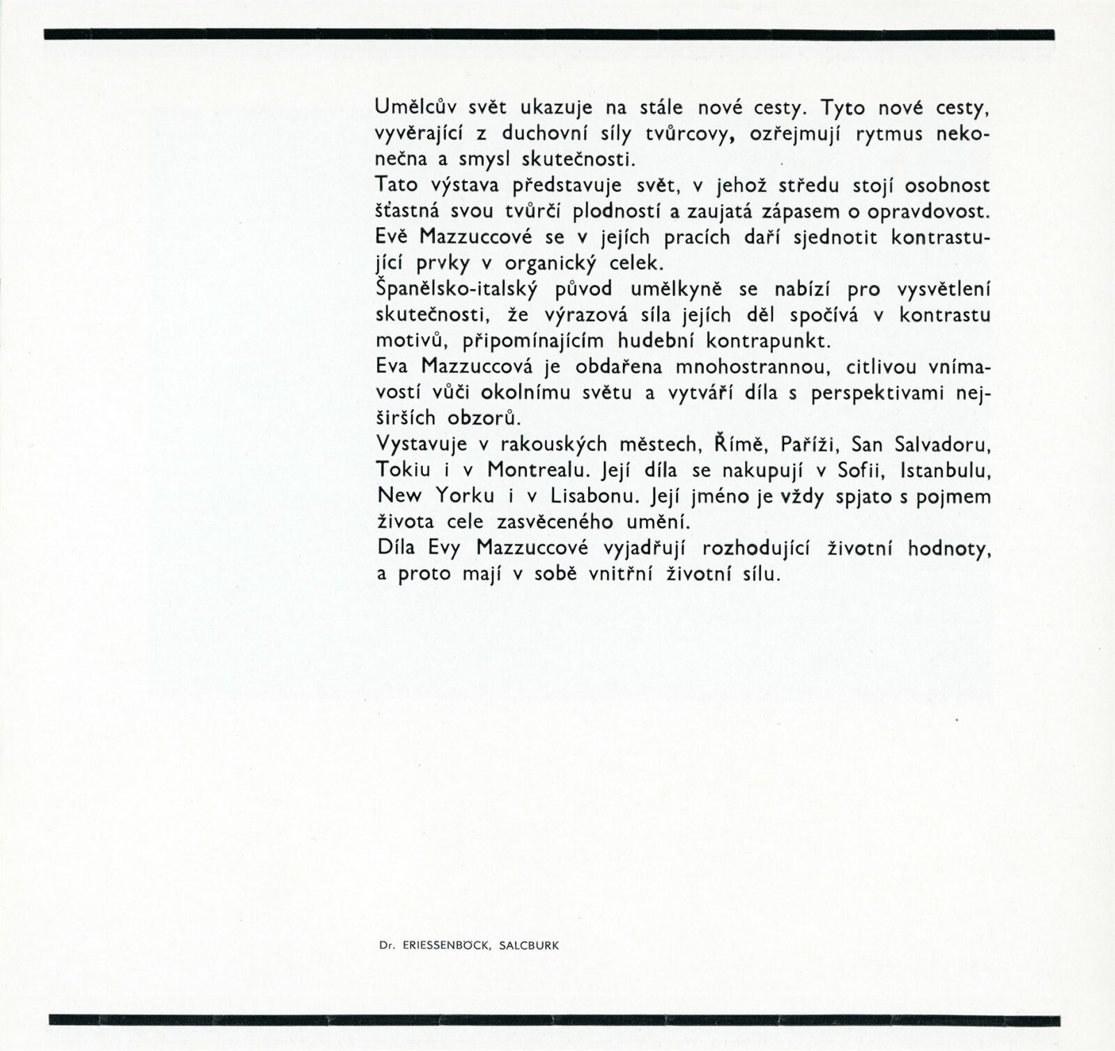 Eva Mazzucco: Dům umění města Brna, hala, červen 28. 5. – 2. 7. 1972 / Text: Eriessenböck. – Praha: Galerie Vincence Kramáře, 1972. – 16 s., obr., životní data, výstavy, ceny, DU 570