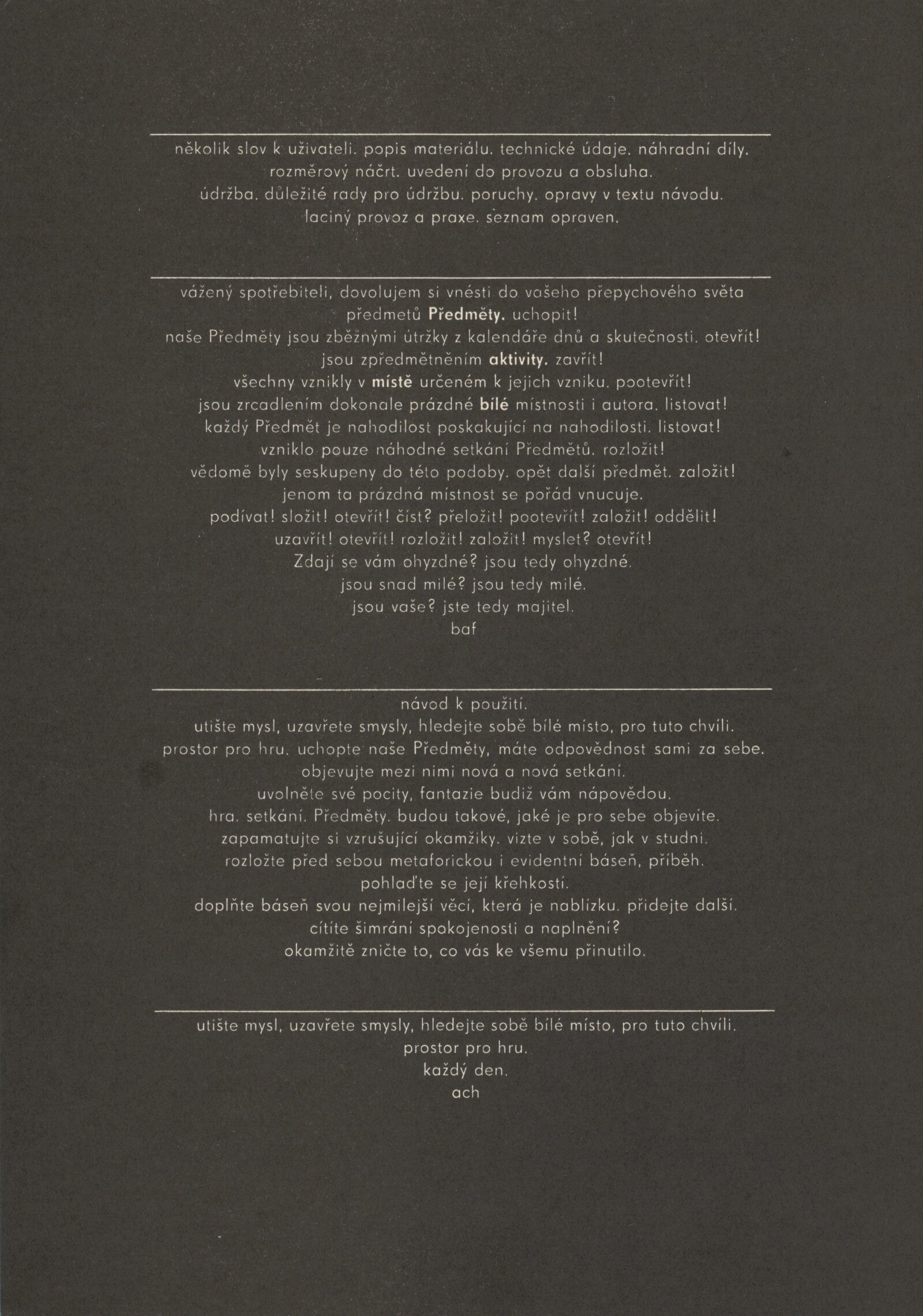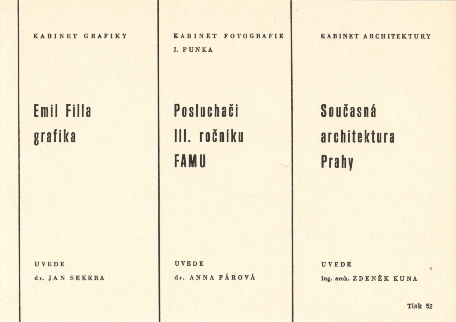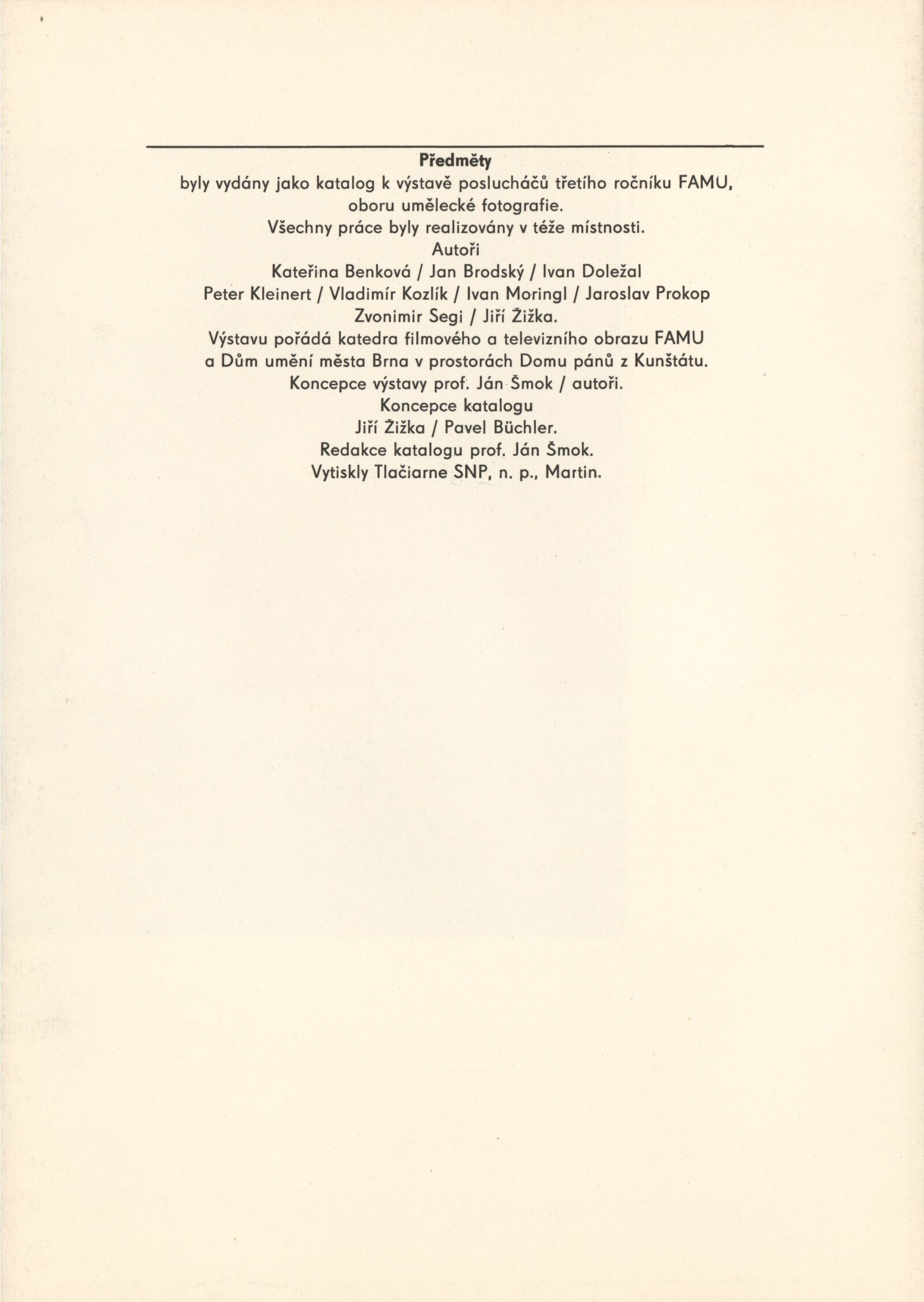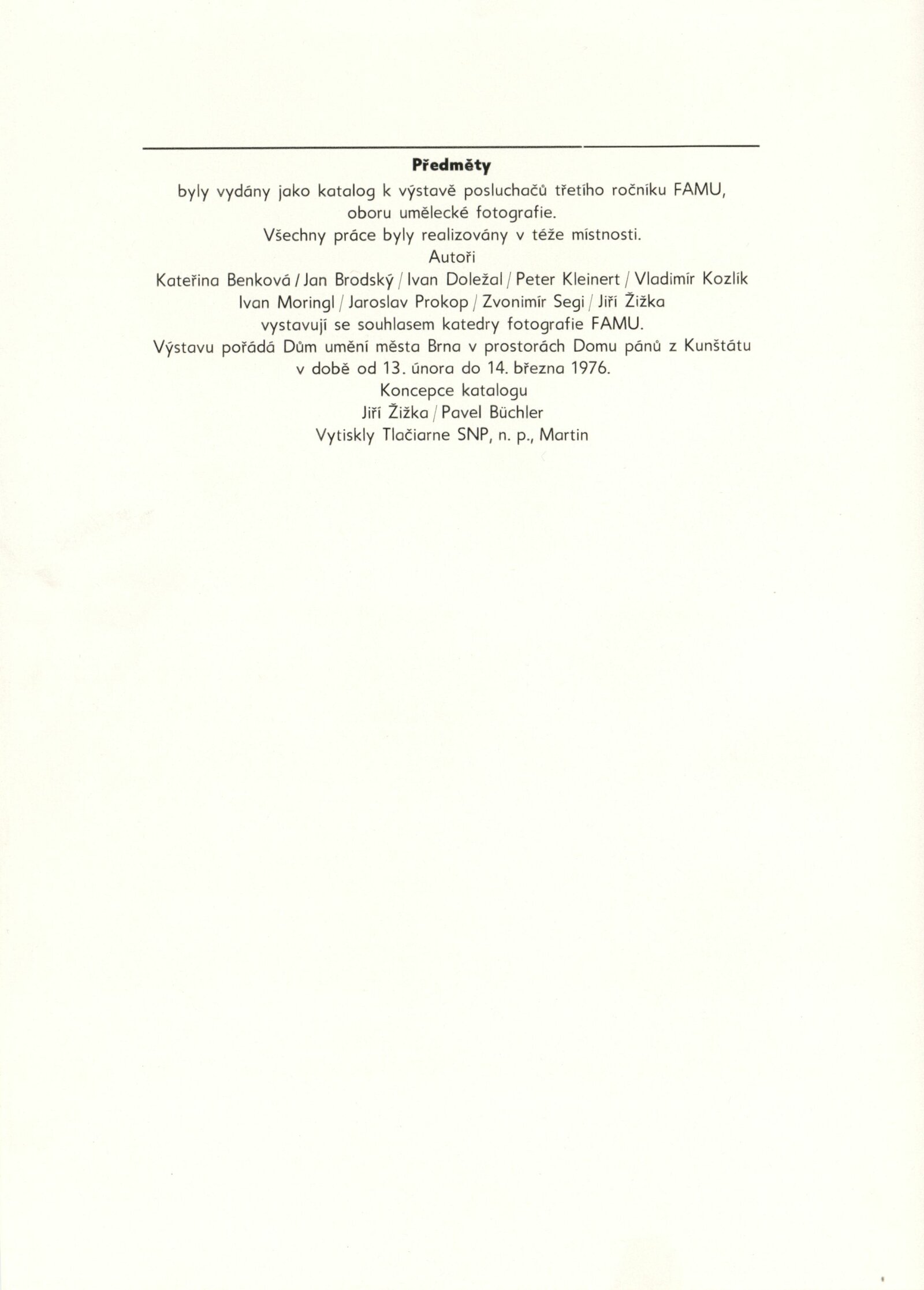 Předměty byly vydány jako katalog k výstavě posluchačů třetího ročníku FAMU, oboru umělecké fotografie: Dům umění / Dům pánů z Kunštátu, Kabinet fotografie Jaromíra Funka, 13. 2. – 14. 3. 1976 / Koncepce katalogu: Jiří Žižka, Pavel Büchler. – Brno: DUmB, 1976. – 20 s., obr., DPK 621