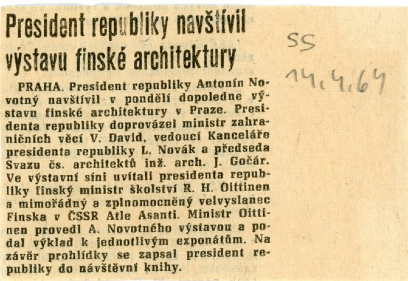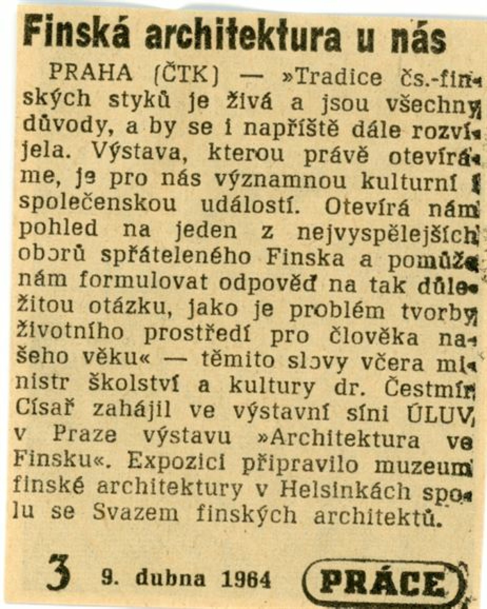 Finská architektura a finský plakát: Dům umění, 1. patro, 30. 8. – 4. 10. 1964 / Převzatý katalog. Finská architektura: Výstavní síň ÚLUV, Praha, duben 1964 / Texty: Václav Hilský, Nils Erik Wickberg. – Praha: ministerstvo školství a kultury, 1964. – 38 s., obr., DU 432. – MG