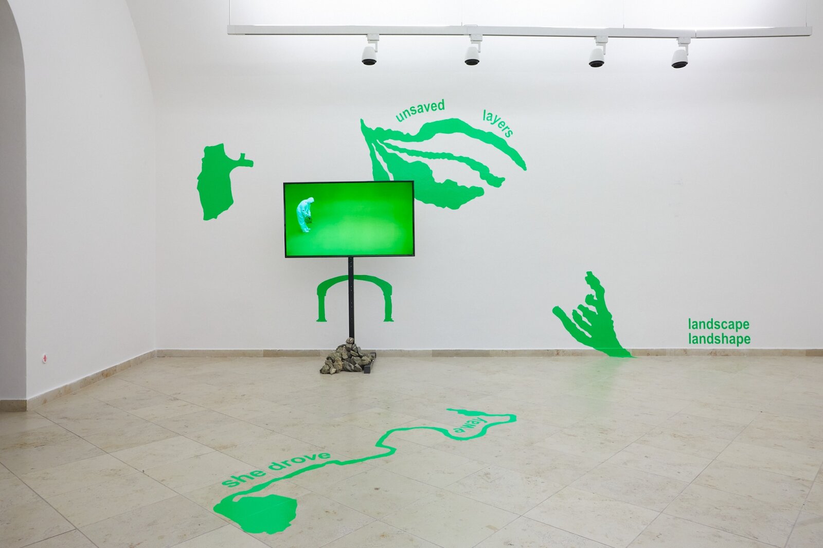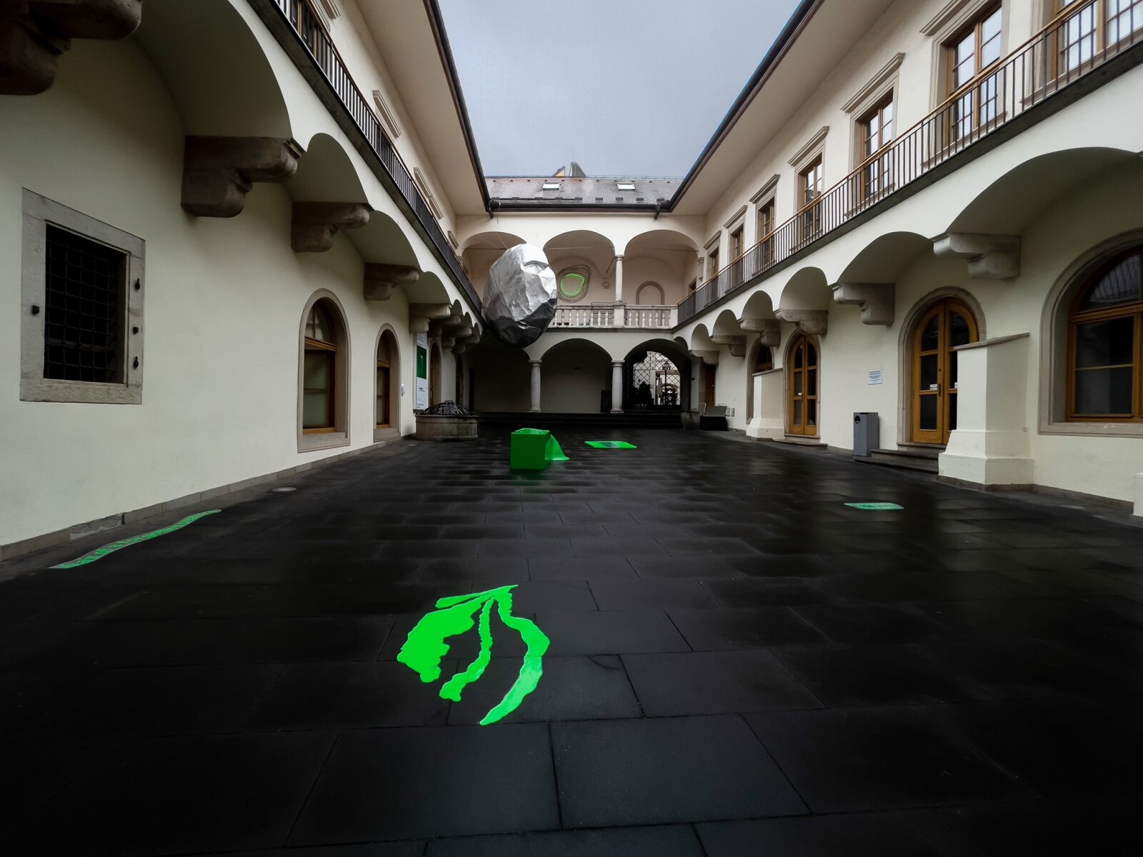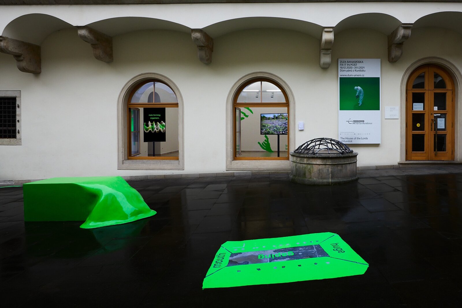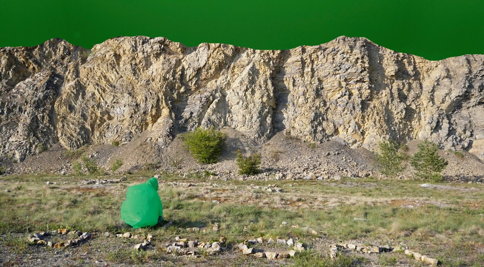 The same principle is needed in the reading of the symbol of the green colour of the screen which makes up an important motif of the installation. In the film industry, this technical element is an instrument of the post-production of tricks and special effects, and can be thus viewed as a space for fiction, a field of endless possibilities of alternative stories. The mining of limestone at Hády left a distinct mark on the landscape. The chopped land surface in a satellite photo is also a message, a record of human past presence. The installation elements in the green screen colour can function as a gesture of creating a free space for alternative care, for the healing of the exploited landscape, though only imaginary.