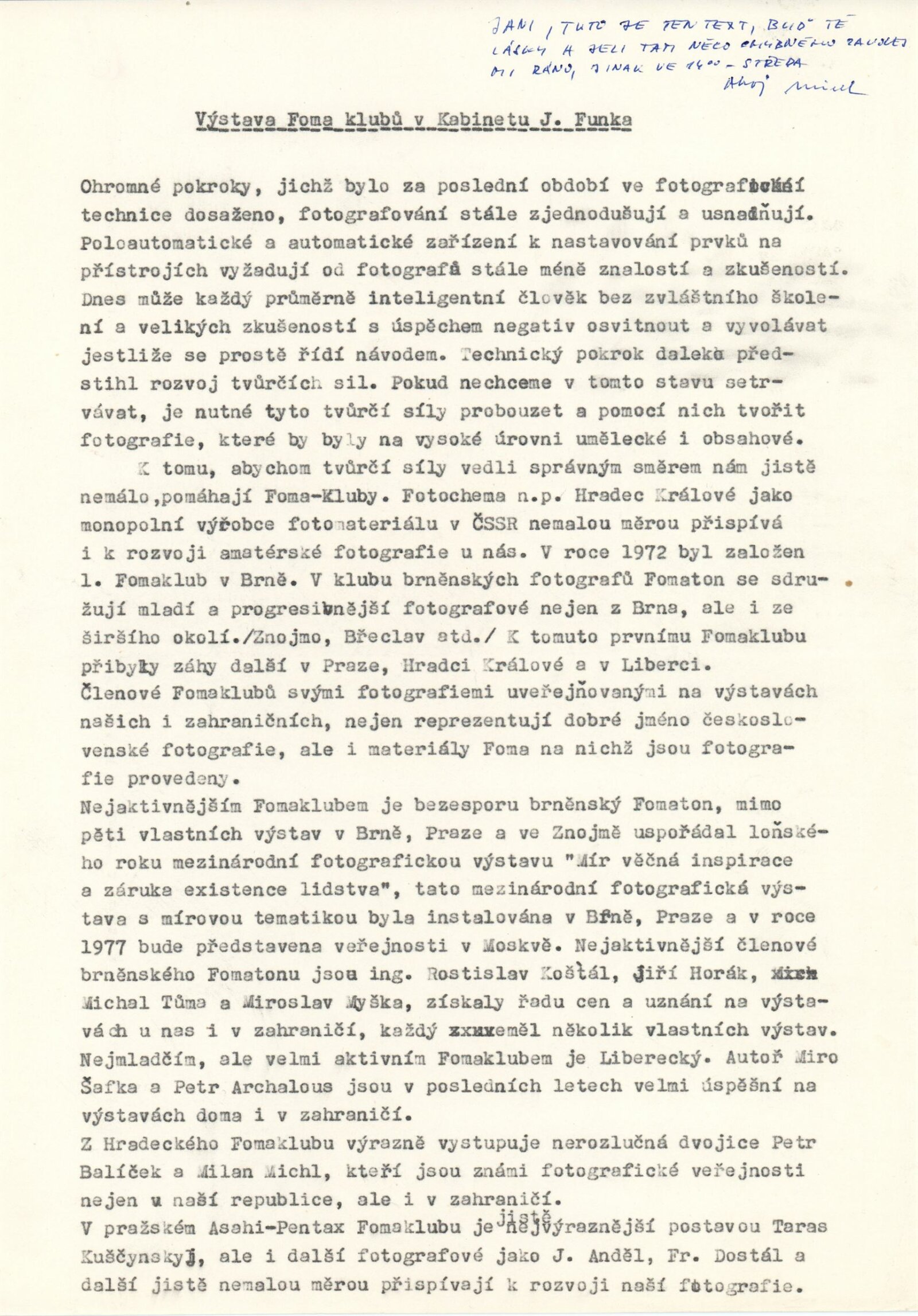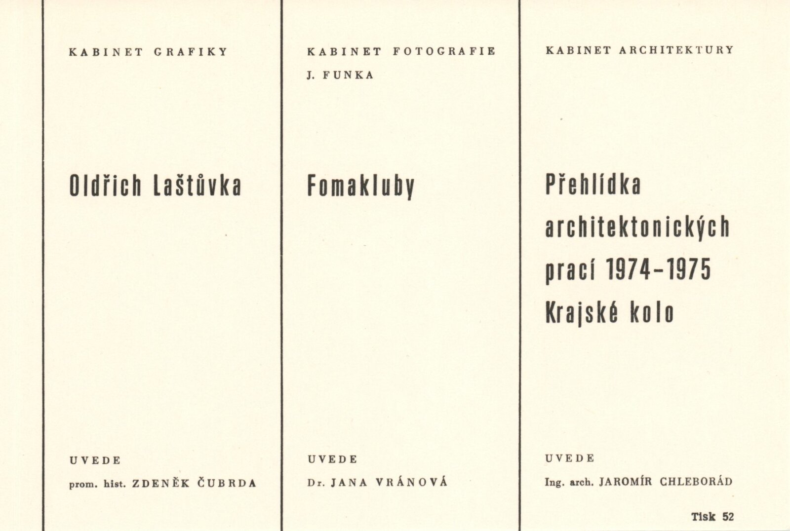 společná pozvánka pro DPK 632–634, úvodní slovo, seznam výstav Kabinetu fotografie pro rok 1976, hlášení o vernisážích, provozní korespondence (Fomaton/DU, neuspořádaná výstava Markéty Luskačové), žádost o výstavu – MKS, žádost o povolení výstavy, zápis ze schůze (28. 5. 1976), smlouva výstavy, recenze v tisku, katalog Jan Lauschmann (Brno 1976)