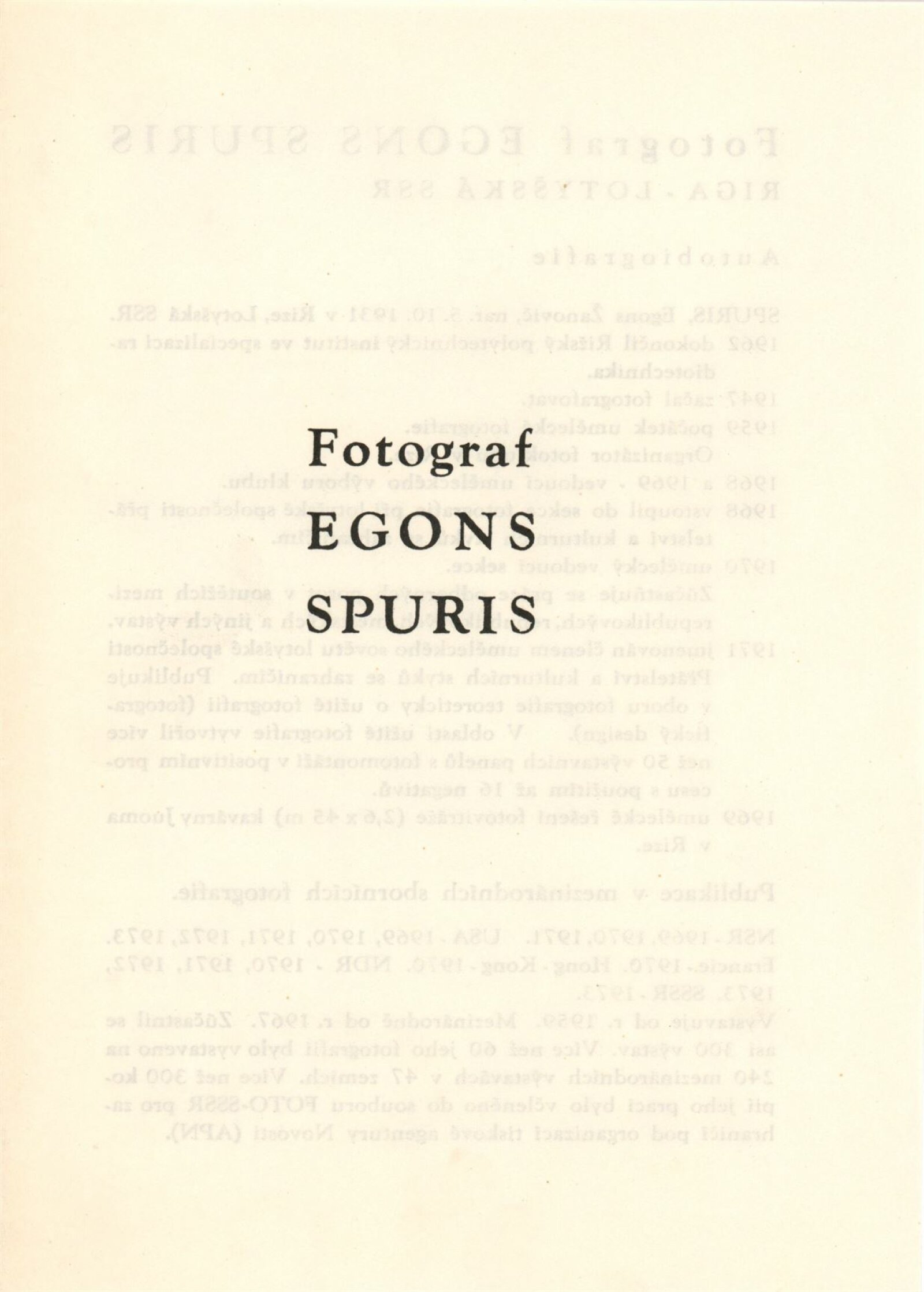 Fotograf Egons Spuris, Lotyšská SSR: 145. výstava Kabinetu fotografie J. Funka, Dům pánů z Kunštátu 21. 3. – 20. 4. 1975. K výstavě vydala Revue Fotografie v Praze informační dvojlist Fotograf Egons Spuris, Riga, Lotyšská SSR. DPK 590