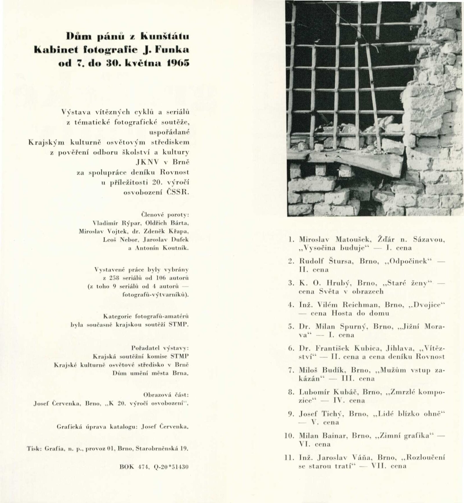 Fotografické seriály: Dům umění města Brna / Dům pánů z Kunštátu, 65. výstava Kabinet fotografie Jaromíra Funka, 7. 5. – 30. 5. 1965 / Brno: Krajská soutěžní komise STMP, 1965. – skládačka, 6 s., obr., DPK 270. – MZK; MG