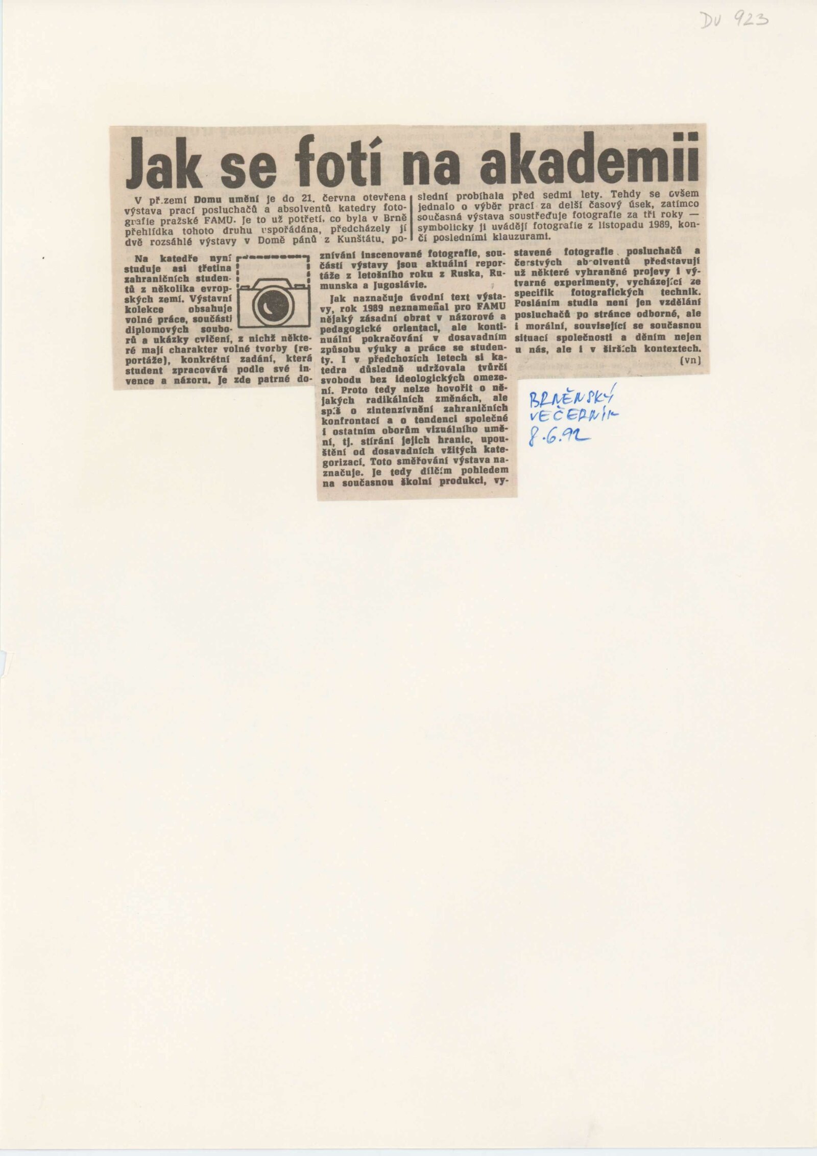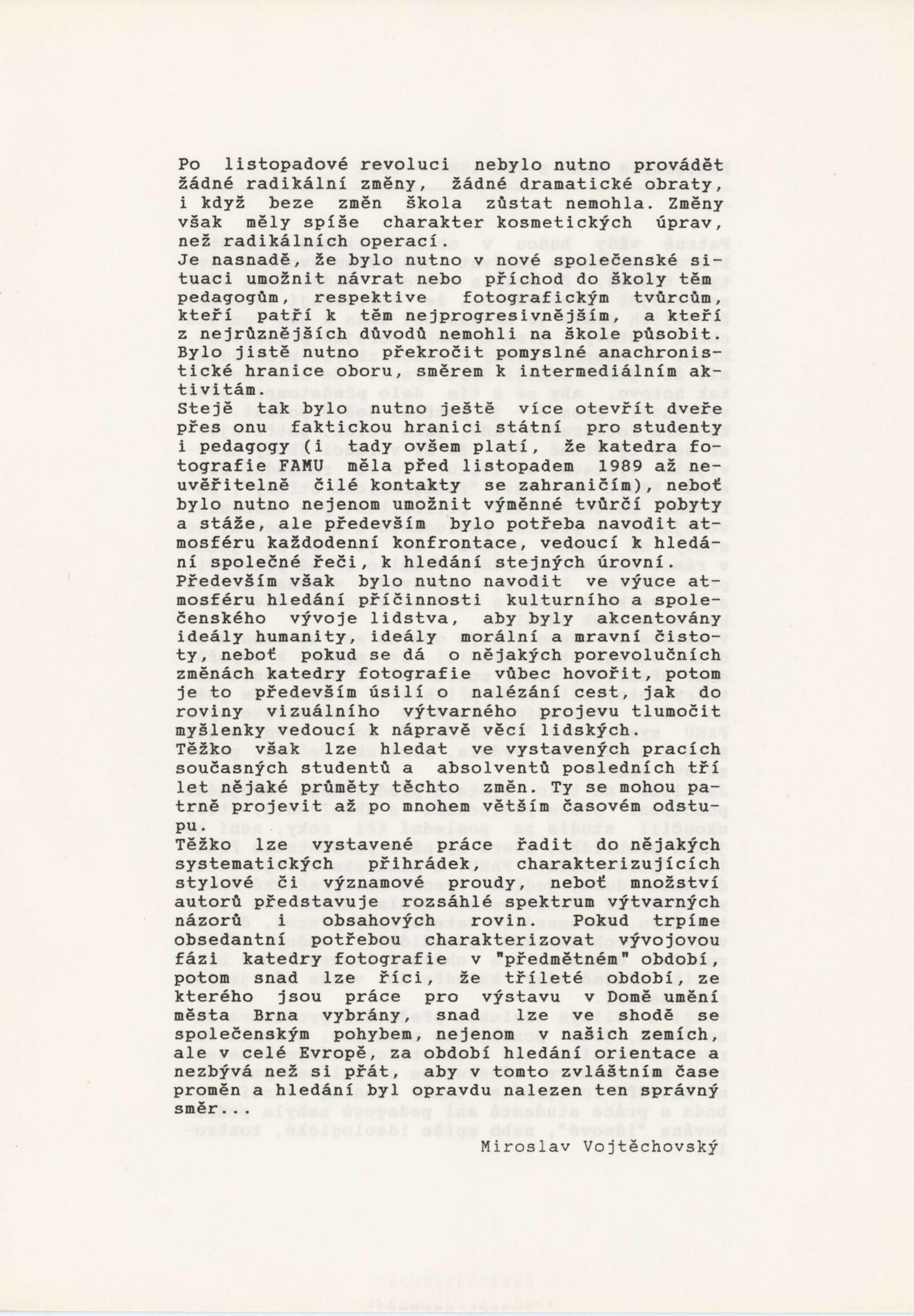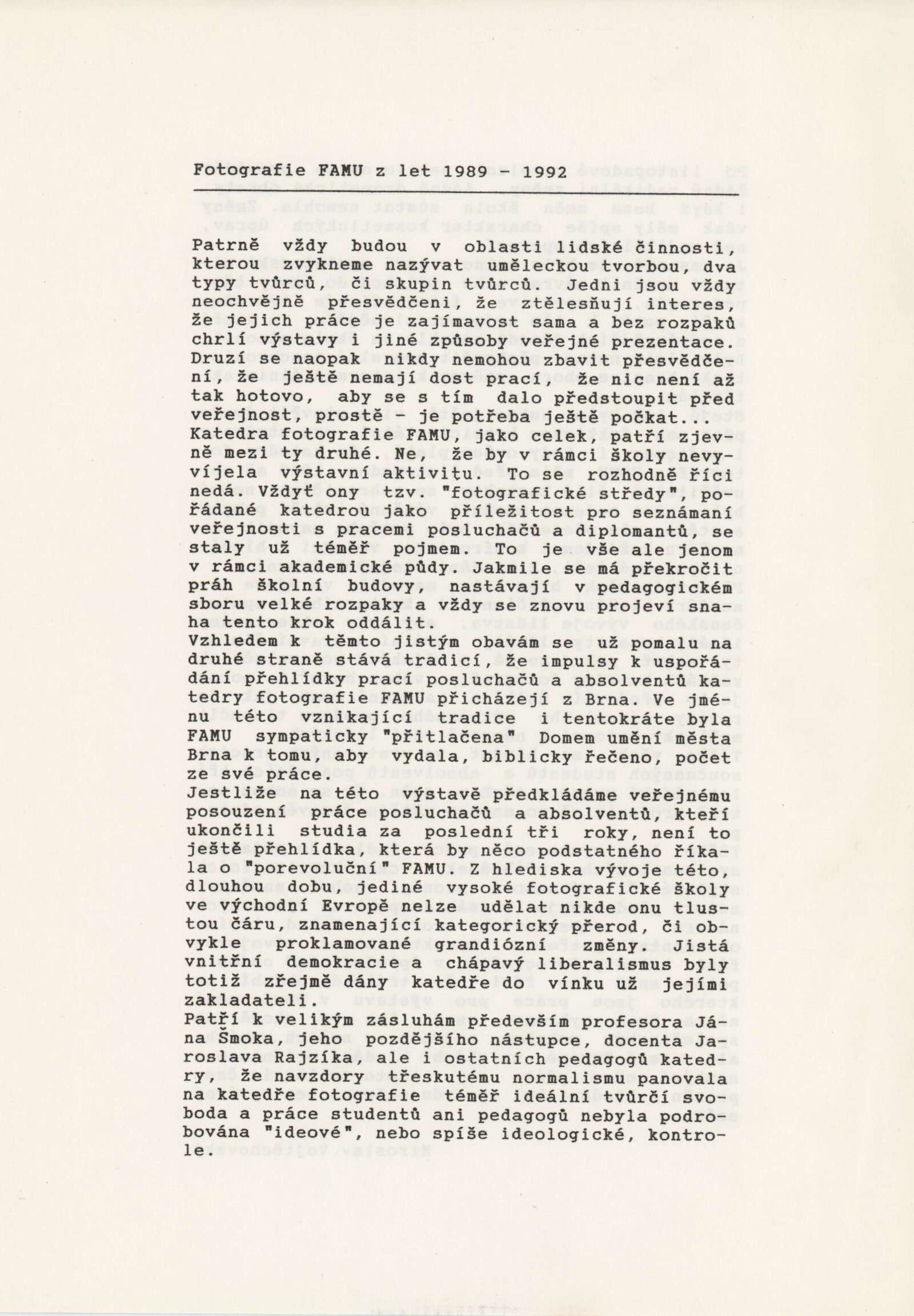 Fotografie Famu z let 1989–1992: Dům umění města Brna, hala, 26. 5. – 21. 6. 1992 / Rozmnožen dvoustránkový. Text: Miroslava Vojtěchovského. – DU 923