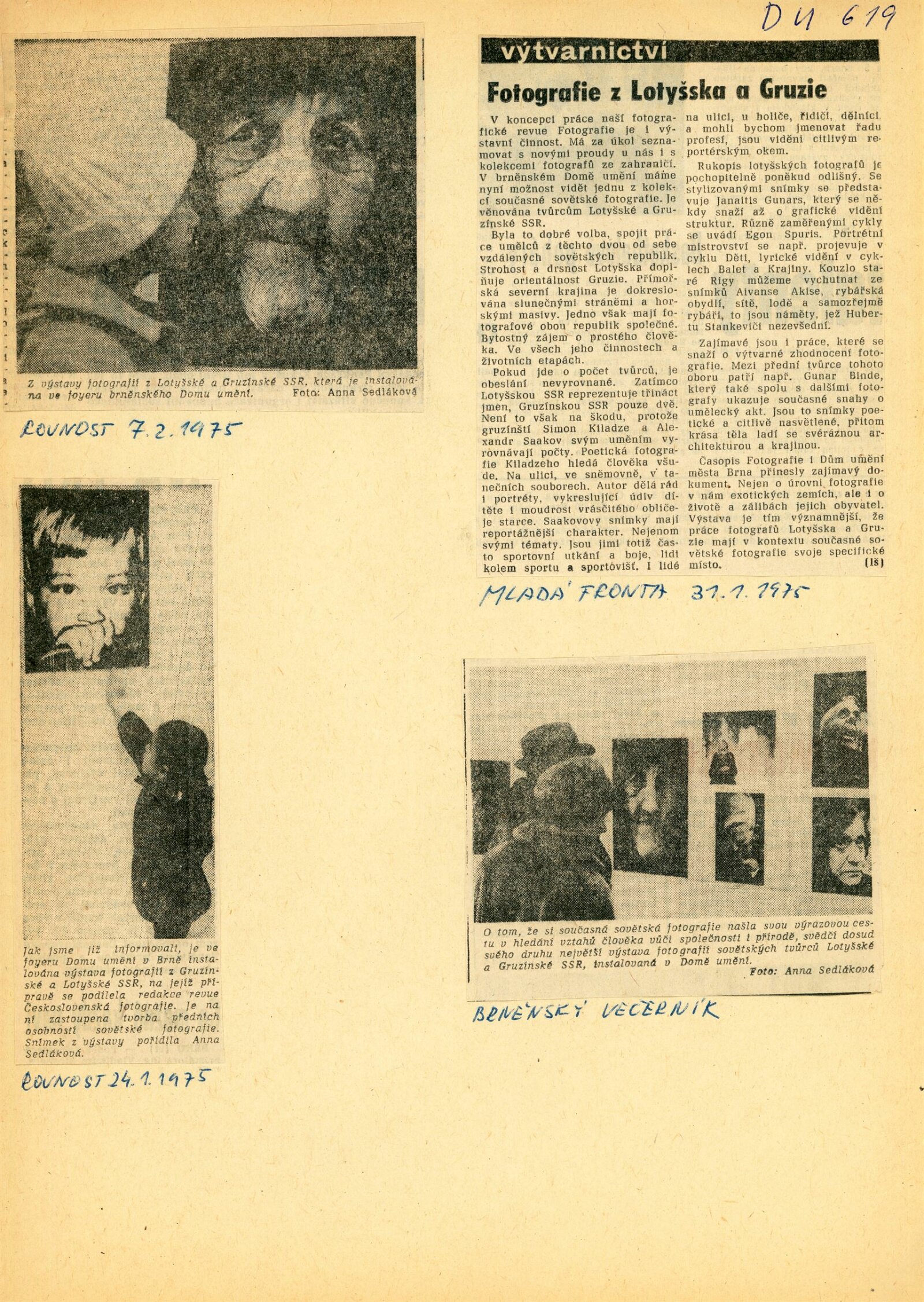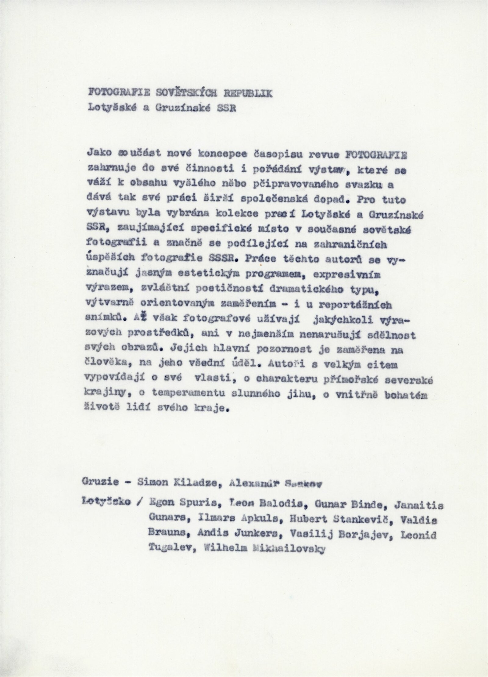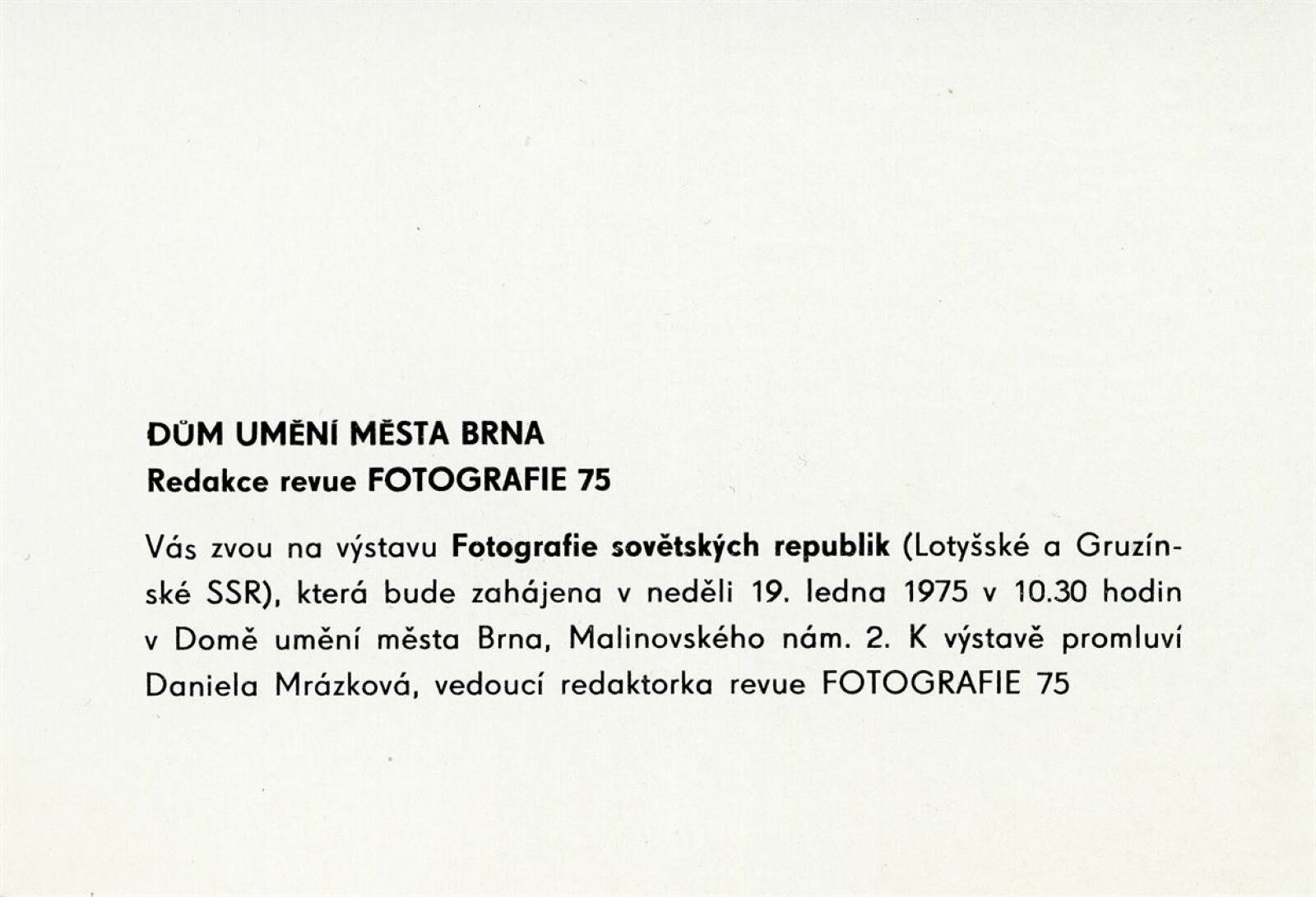 Fotografie Lotyšské a Gruzínské SSR: Dům umění, hala, 19. 1. – 23. 2. 1975 / Samostatný katalog nebyl vydán. Lotyšská fotografia: Komorná galéria fotografie Bratislava listopad–prosinec 1975 / Text: Daniela Mrázková. – Bratislava: Mestský dom kultúry a osvety, 1975. – 8 s., obr., DU 619
