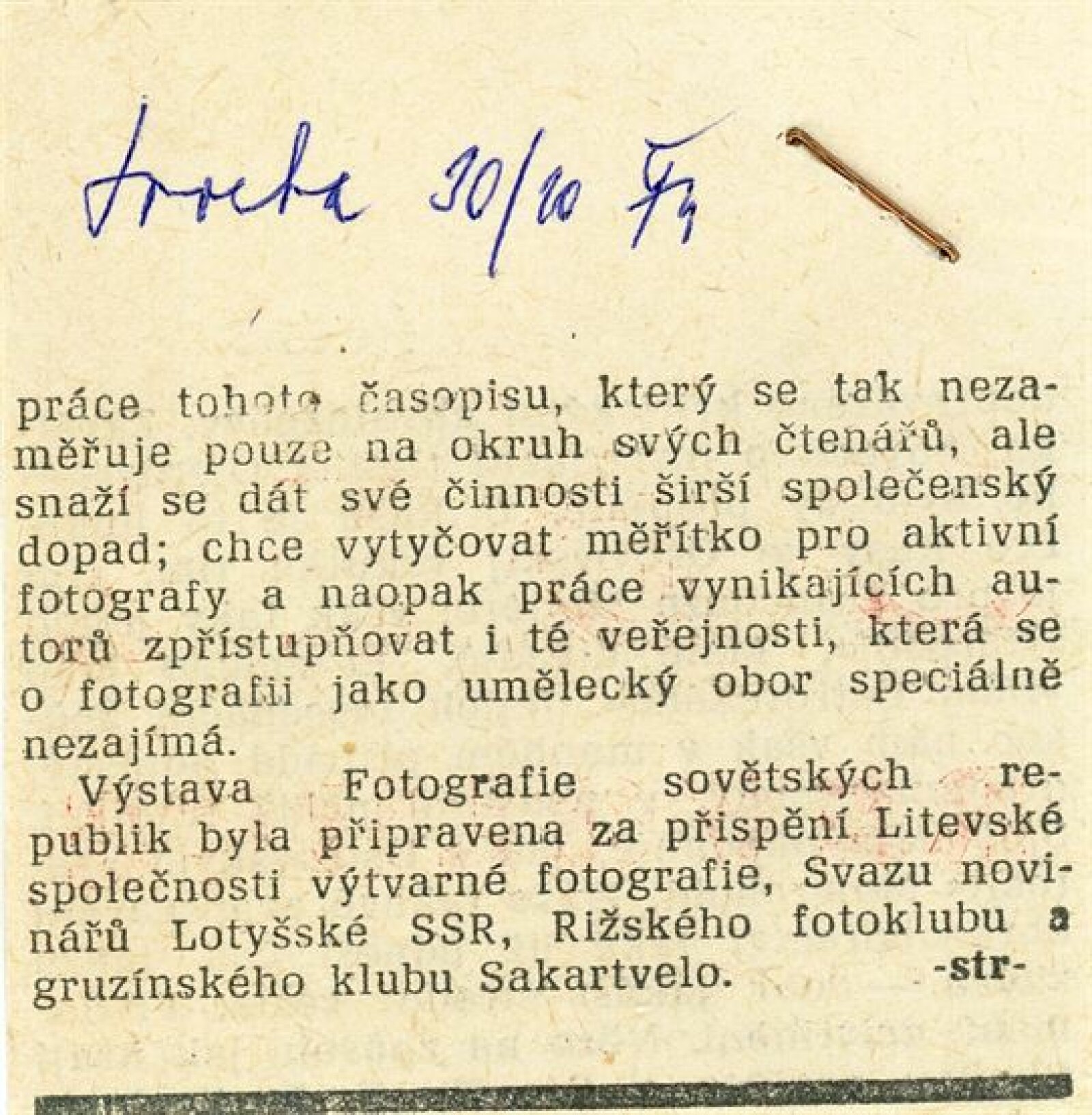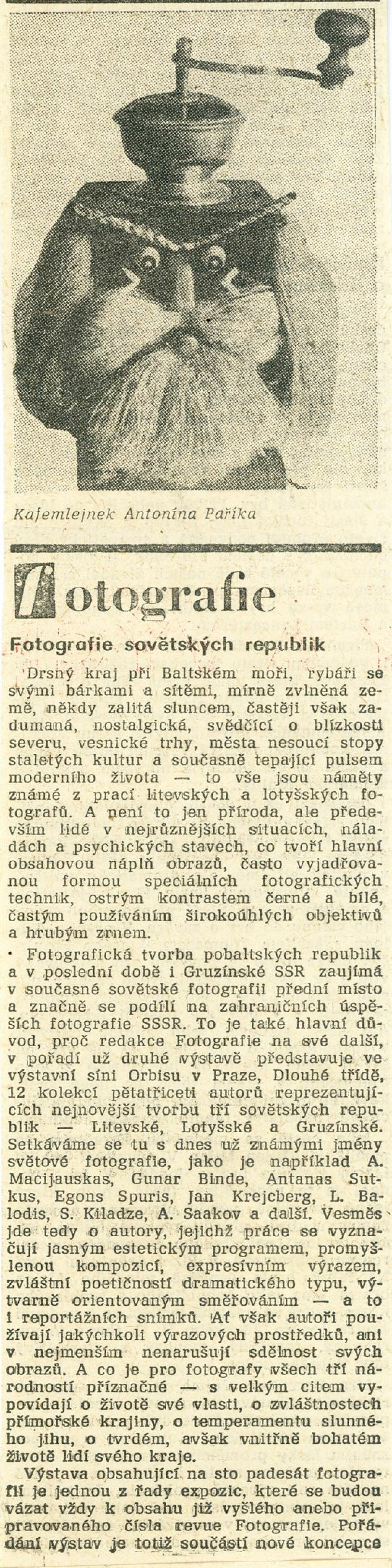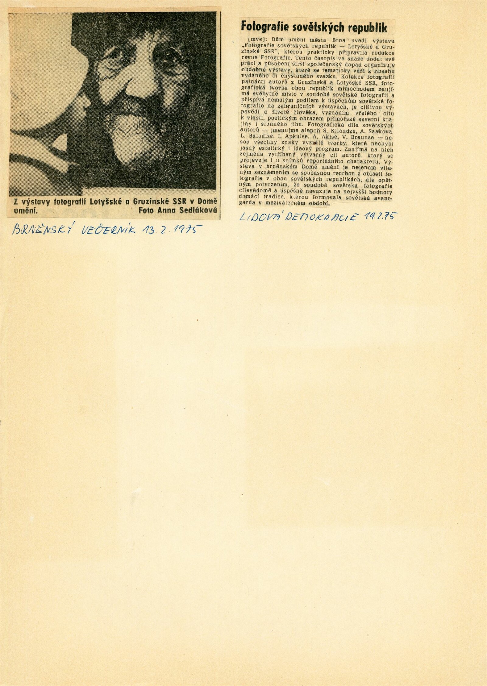 Fotografie Lotyšské a Gruzínské SSR: Dům umění, hala, 19. 1. – 23. 2. 1975 / Samostatný katalog nebyl vydán. Lotyšská fotografia: Komorná galéria fotografie Bratislava listopad–prosinec 1975 / Text: Daniela Mrázková. – Bratislava: Mestský dom kultúry a osvety, 1975. – 8 s., obr., DU 619