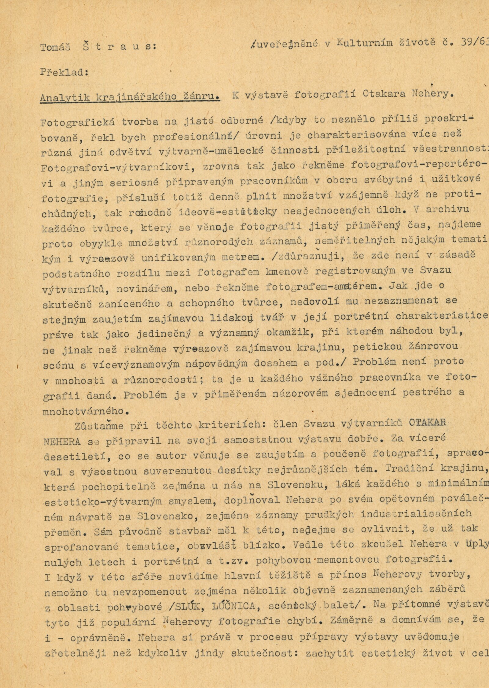 Fotografie Otakara Nehery: Dům umění města Brna / Dům pánů z Kunštátu, 57. výstava Kabinetz fotografie Jaromíra Funka, 4. 9. – 27. 9. 1964 / Text: Tomáš Štraus. – Brno: DUmB, 1964. – skládačka, 6 s., obr., DPK 235. – MZK; MG