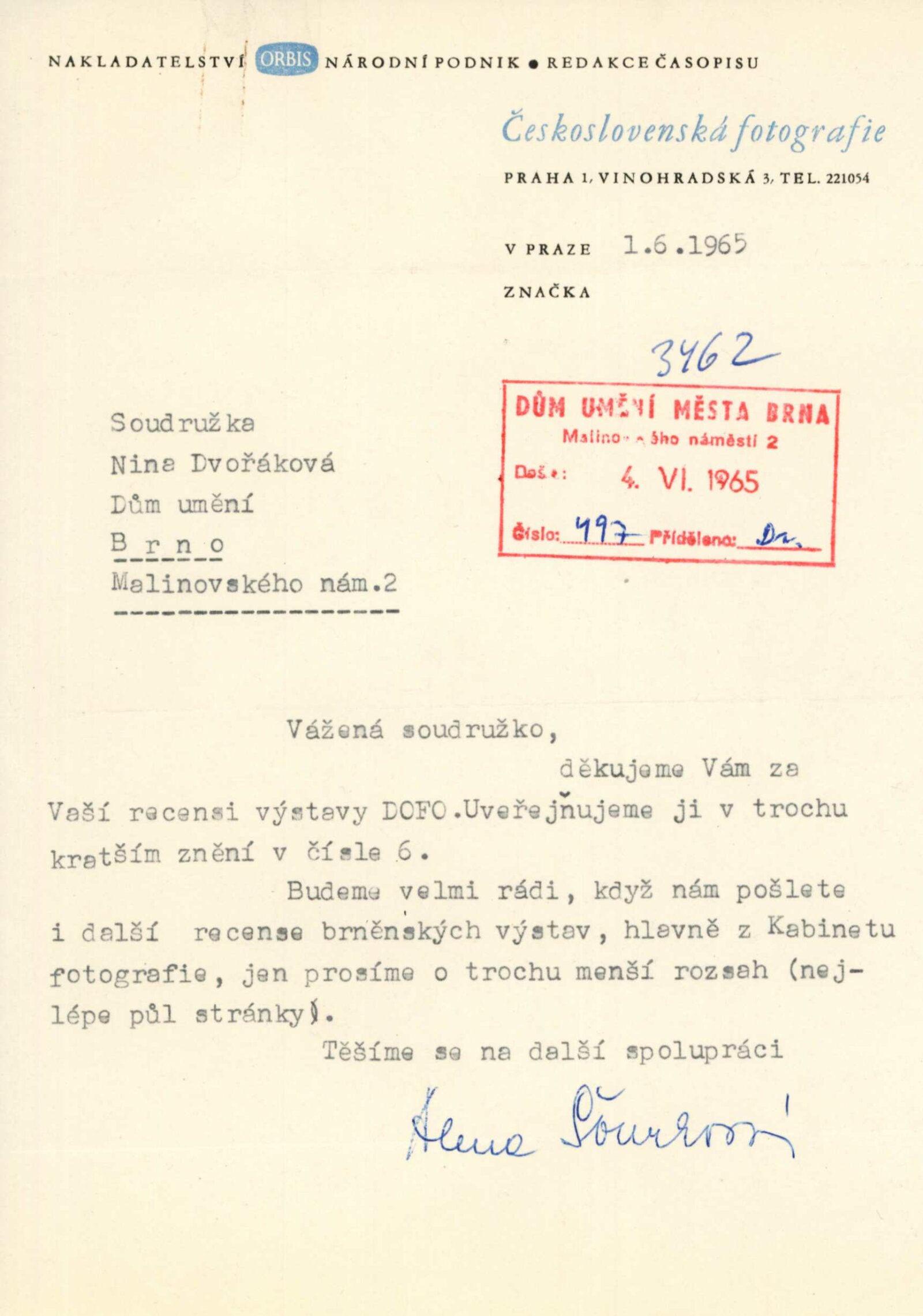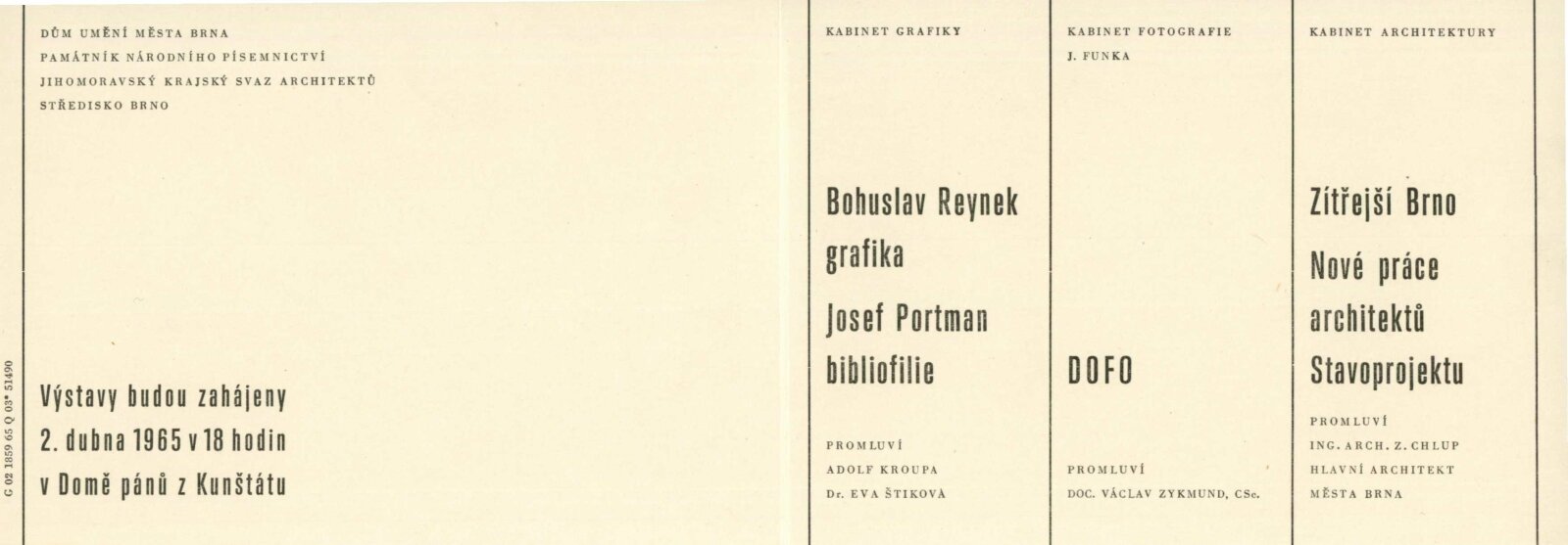 Fotografie skupiny DOFO: Dům umění města Brna / Dům pánů z Kunštátu, 64. výstava Kabinetu fotografie Jaromíra Funka, 2. 4. – 2. 5. 1965 / Text: Václav Zykmund. – Brno: DUmB, 1965. – složený list, obr., DPK 265. – MZK; MG