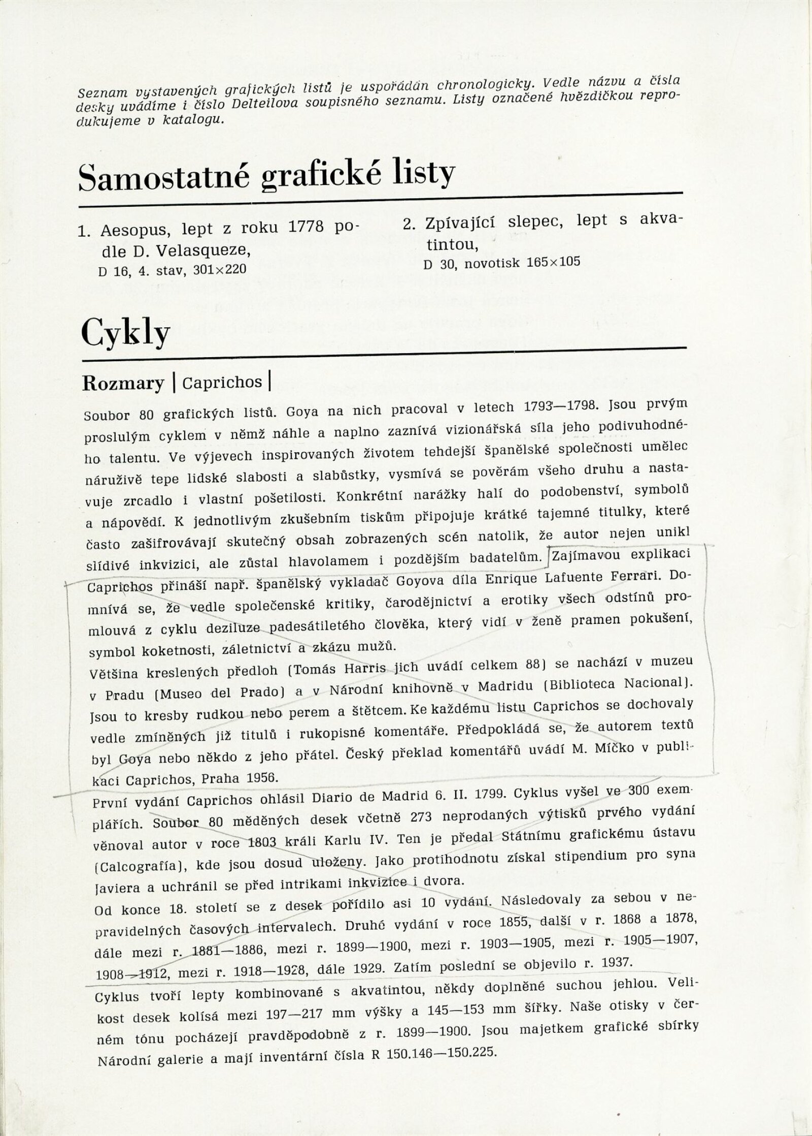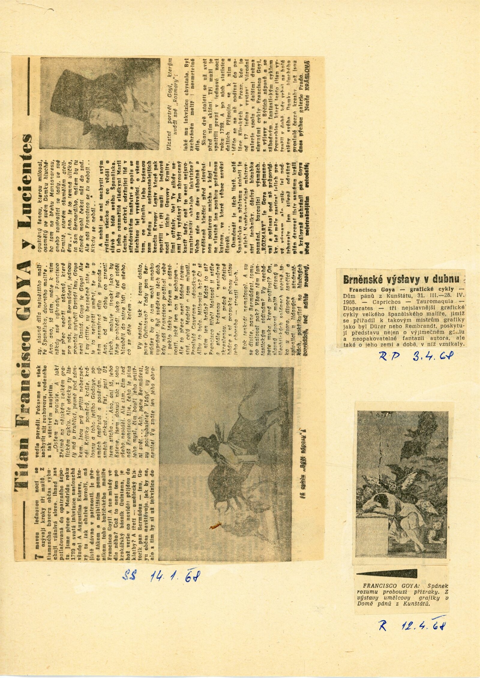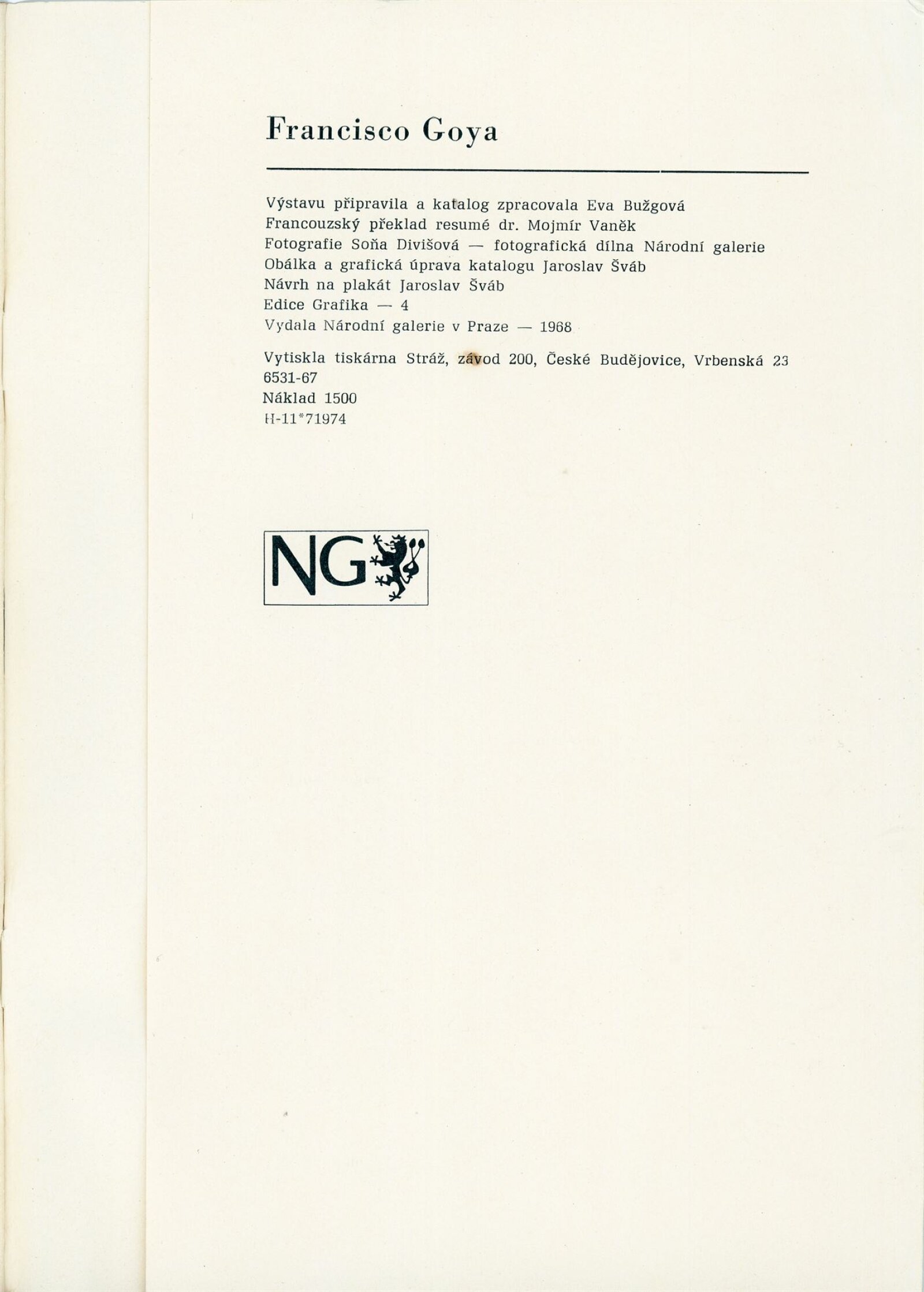 Francisco Goya. Grafické dílo: Dům umění města Brna / Dům pánů z Kunštátu, 1. patro, 31. 3. – 29. 4. 1968 / Převzatý katalog. Francisco Goya. Grafické dílo: Grafická sbírka Národní galerie v Praze, 1968 / Text: Eva Bužgová. – Praha: Národní galerie, 1968. – 34 s., obr., DPK 375. – MZK; MG