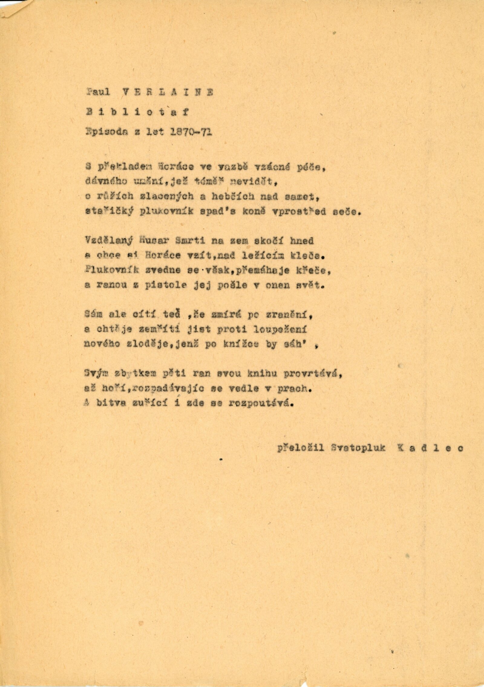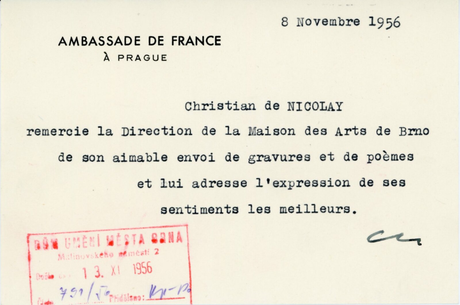 pozvánka, zahájení výstavy (Adolf Kroupa), báseň (Paul Verlaina), program vernisáže, nákres rozvržení výstavy na půdorysu přízemí DU, záznam o realizaci výstavy, záznam o jednání k výstavě, záznam tel. hovoru o přípravě návštěvy franc. velvyslance v DU, předávací protokoly, korespondence (dopisy z franc. ambasády, provozní korespondence)