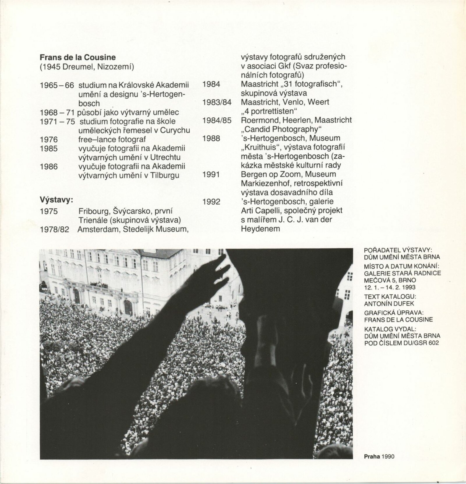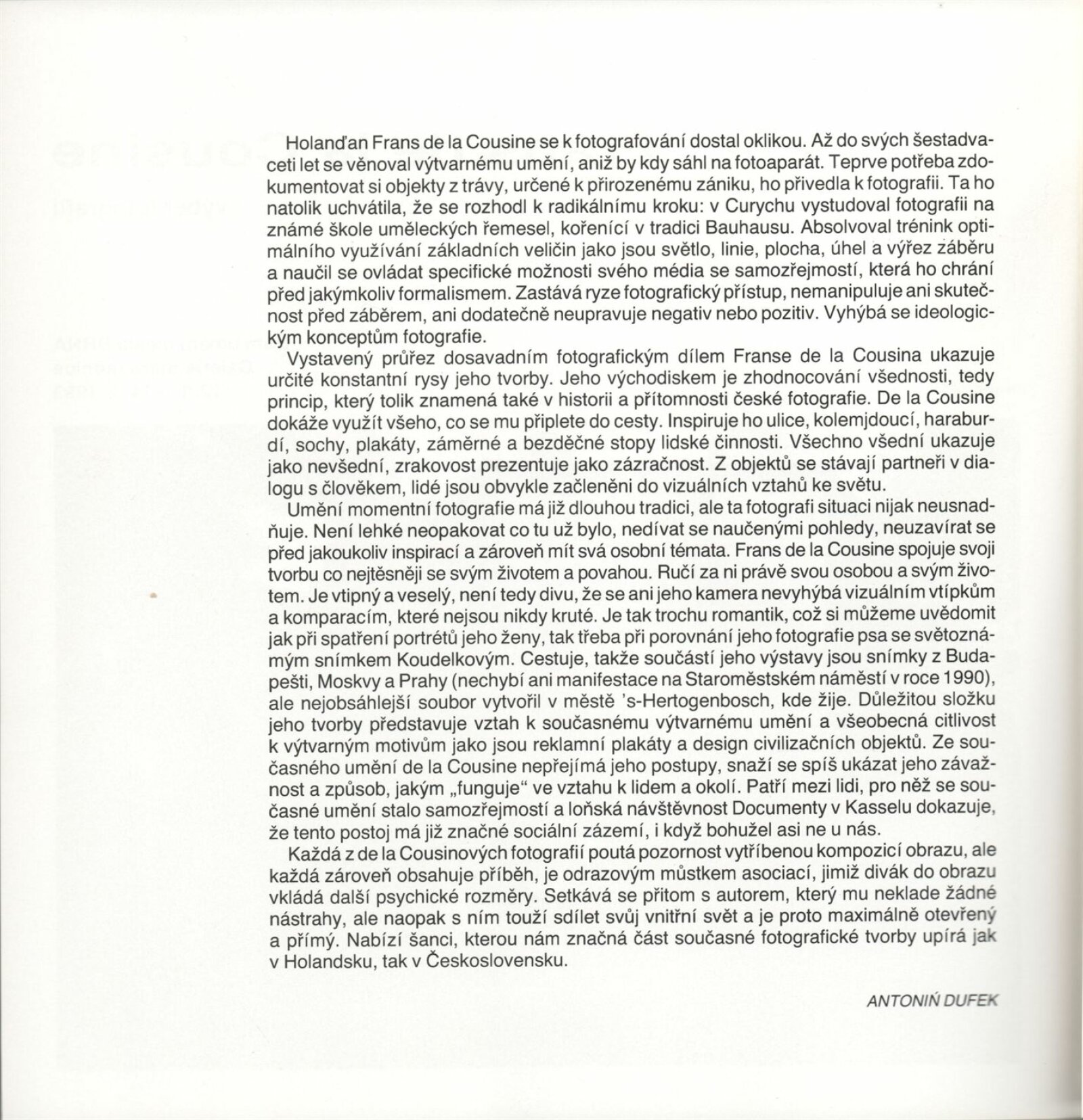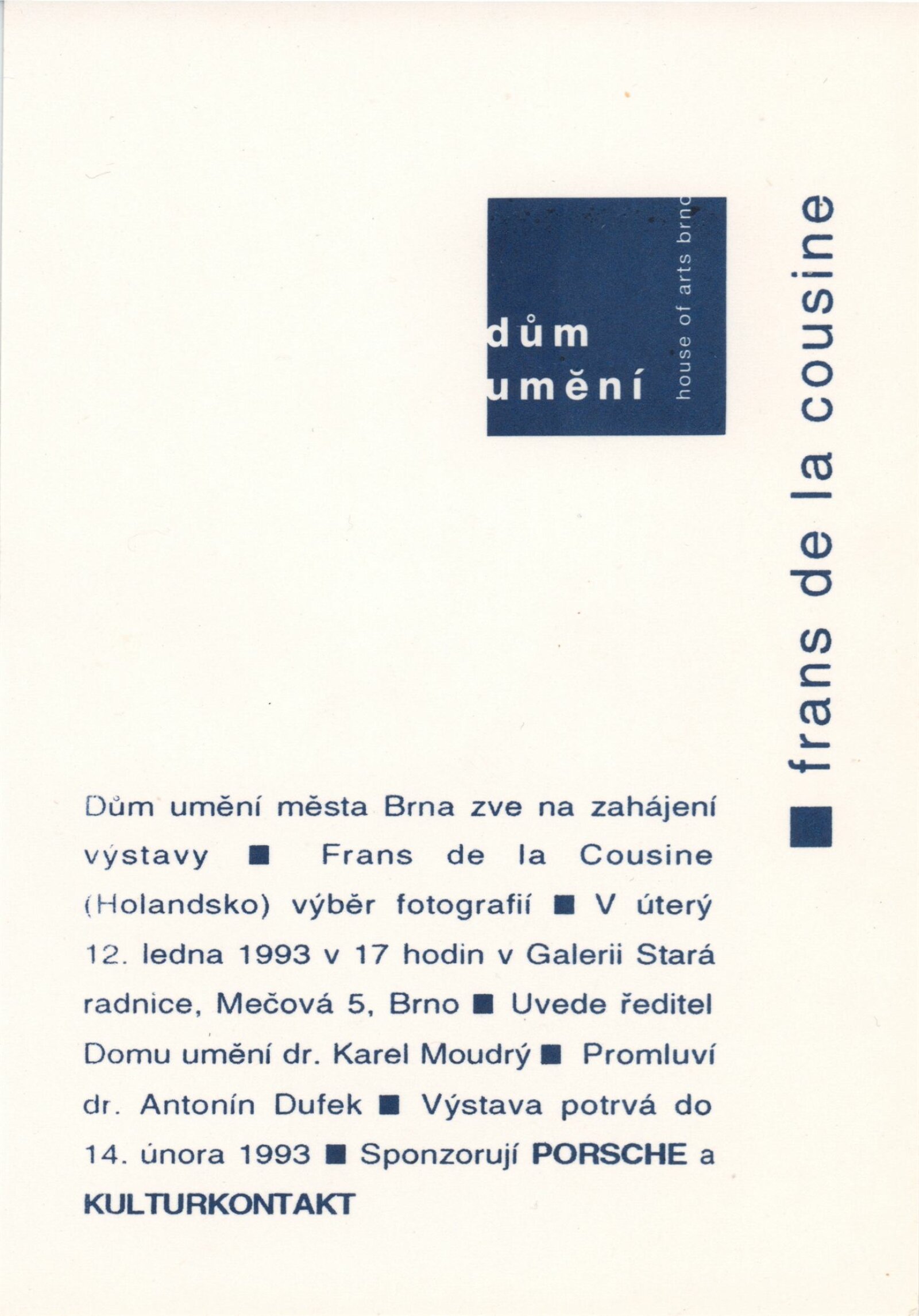 Frans de la Cousine. Výběr fotografií: Galerie Stará radnice 12. 1. – 14. 2. 1993 / Text Antonín Dufek. - Brno: DUmB, - 1 skládačka (6 s., obr.) Životní data, výstavy GSR 137; MG