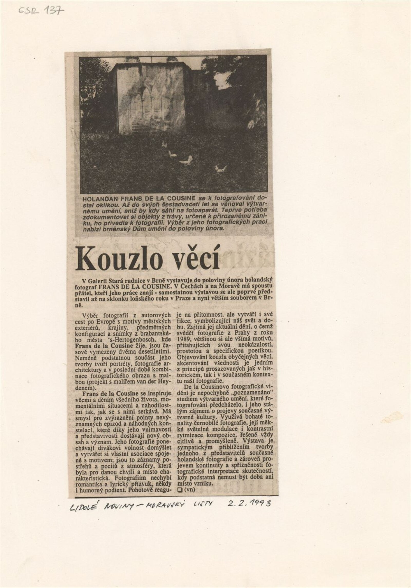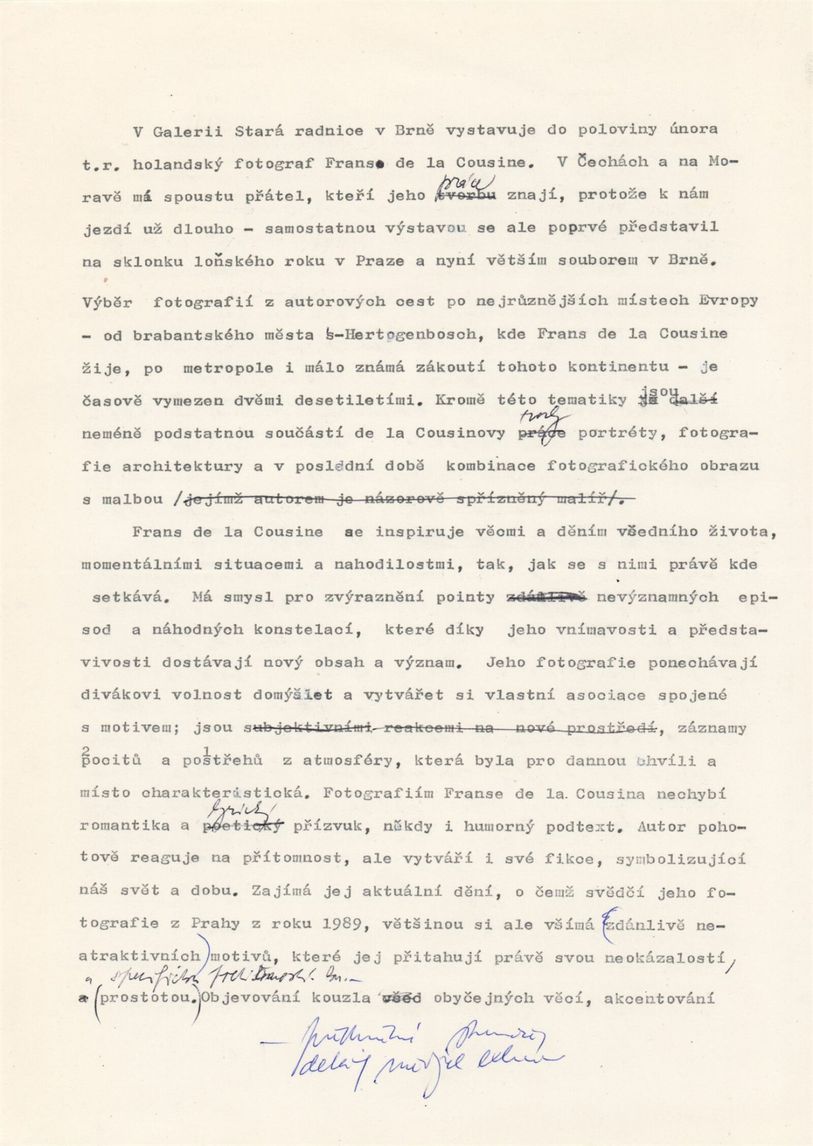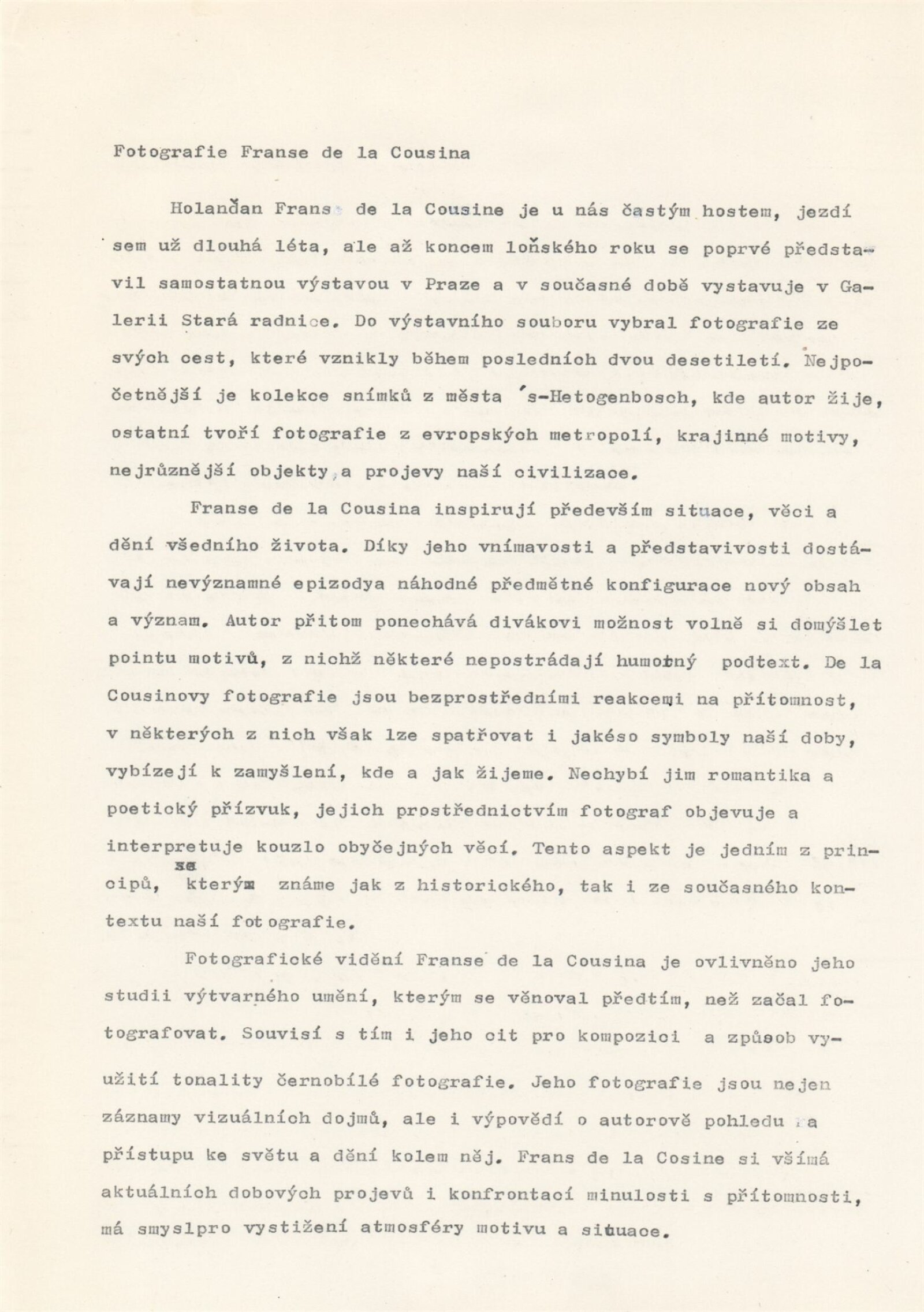 Frans de la Cousine. Výběr fotografií: Galerie Stará radnice 12. 1. – 14. 2. 1993 / Text Antonín Dufek. - Brno: DUmB, - 1 skládačka (6 s., obr.) Životní data, výstavy GSR 137; MG