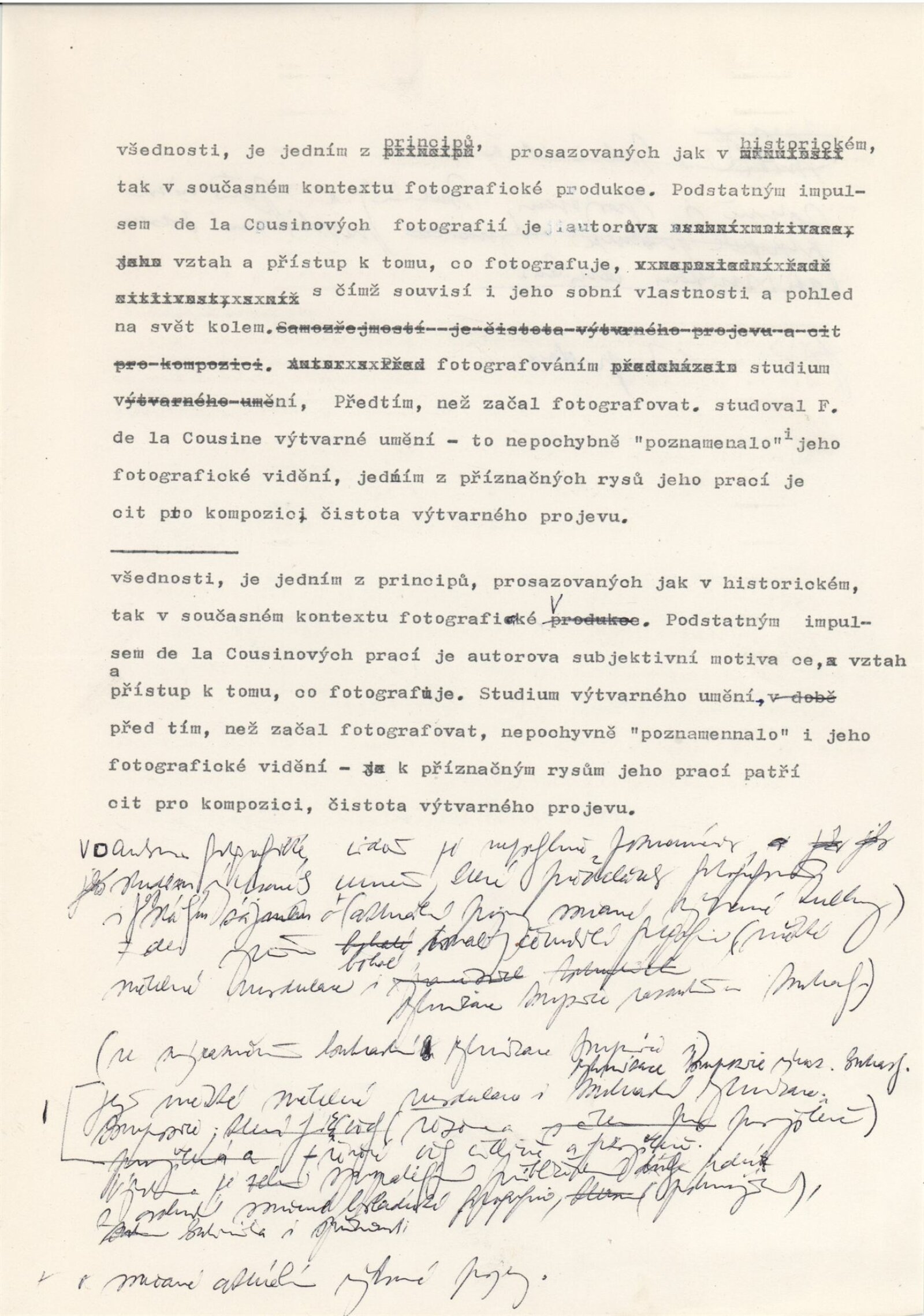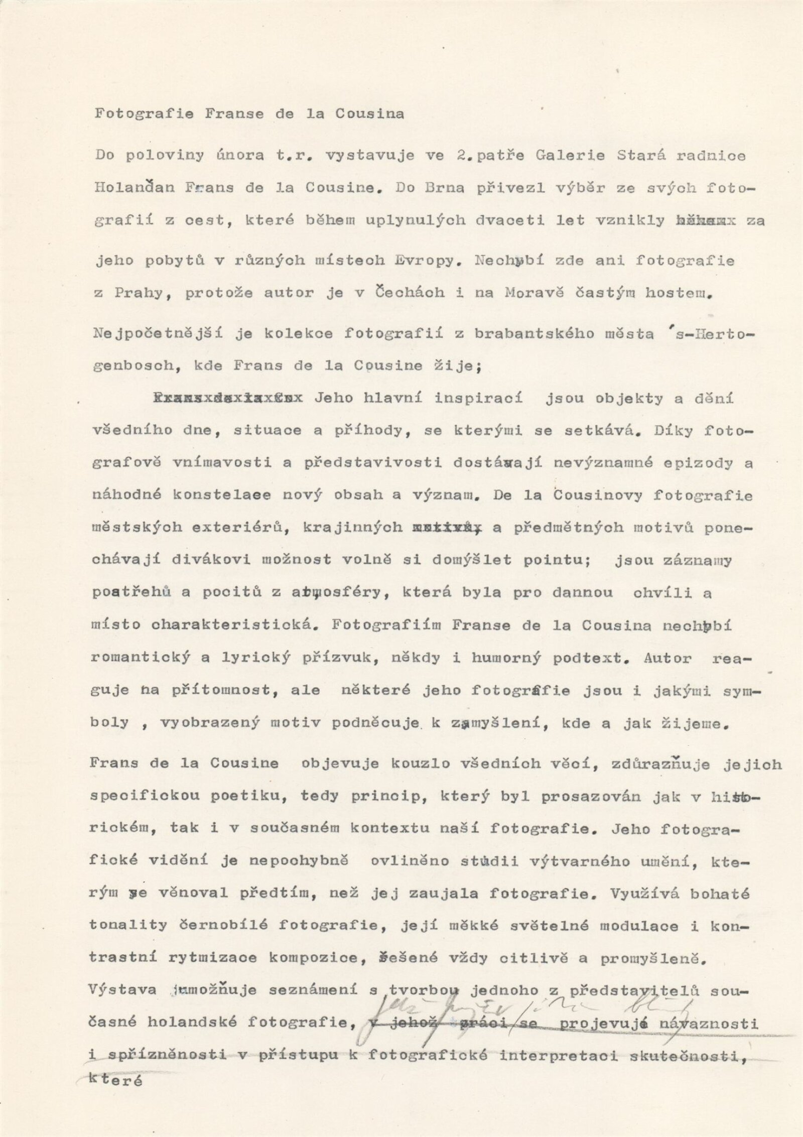 pozvánka, katalog, zprávy pro média, strojopis, seznam vystavených děl, korespondence, recenze v tisku, publikace o F. de la Cousine vydaná v Holandsku