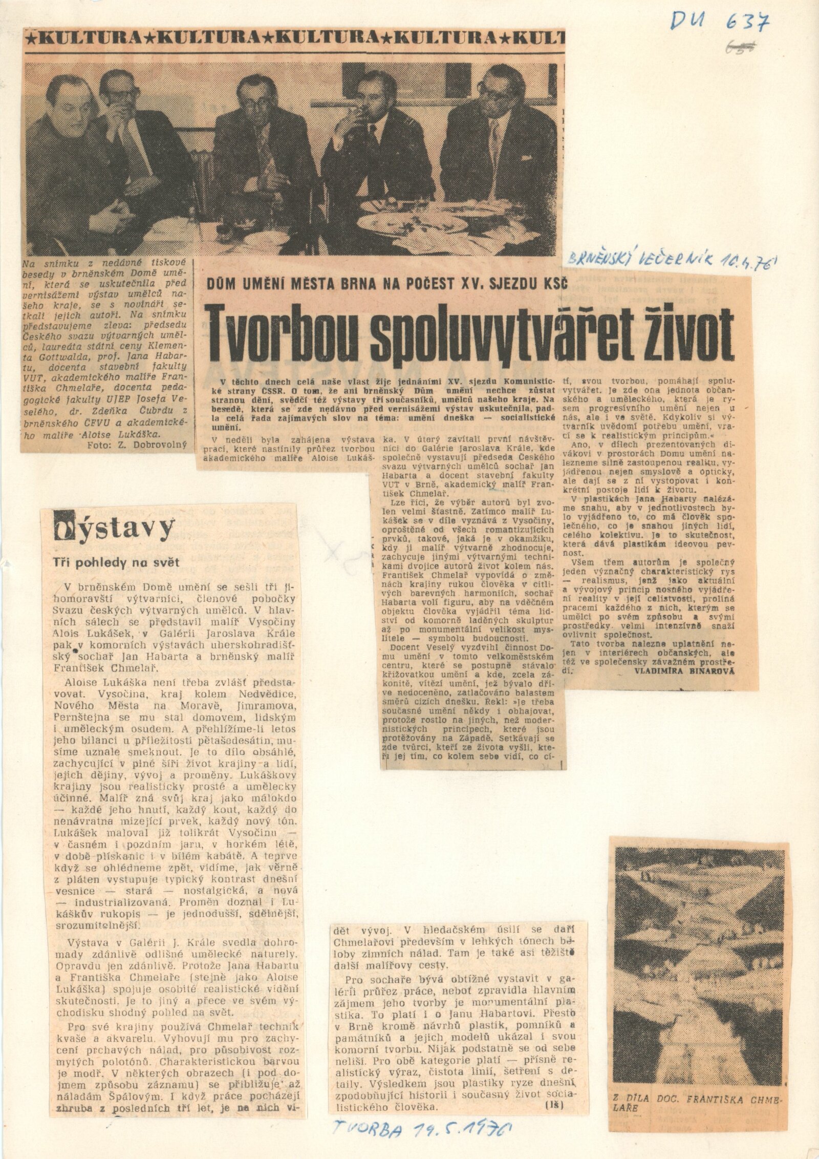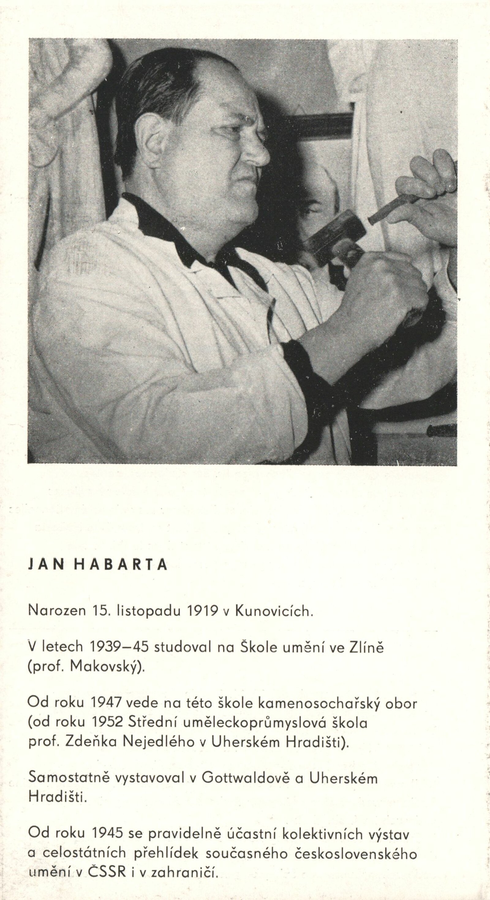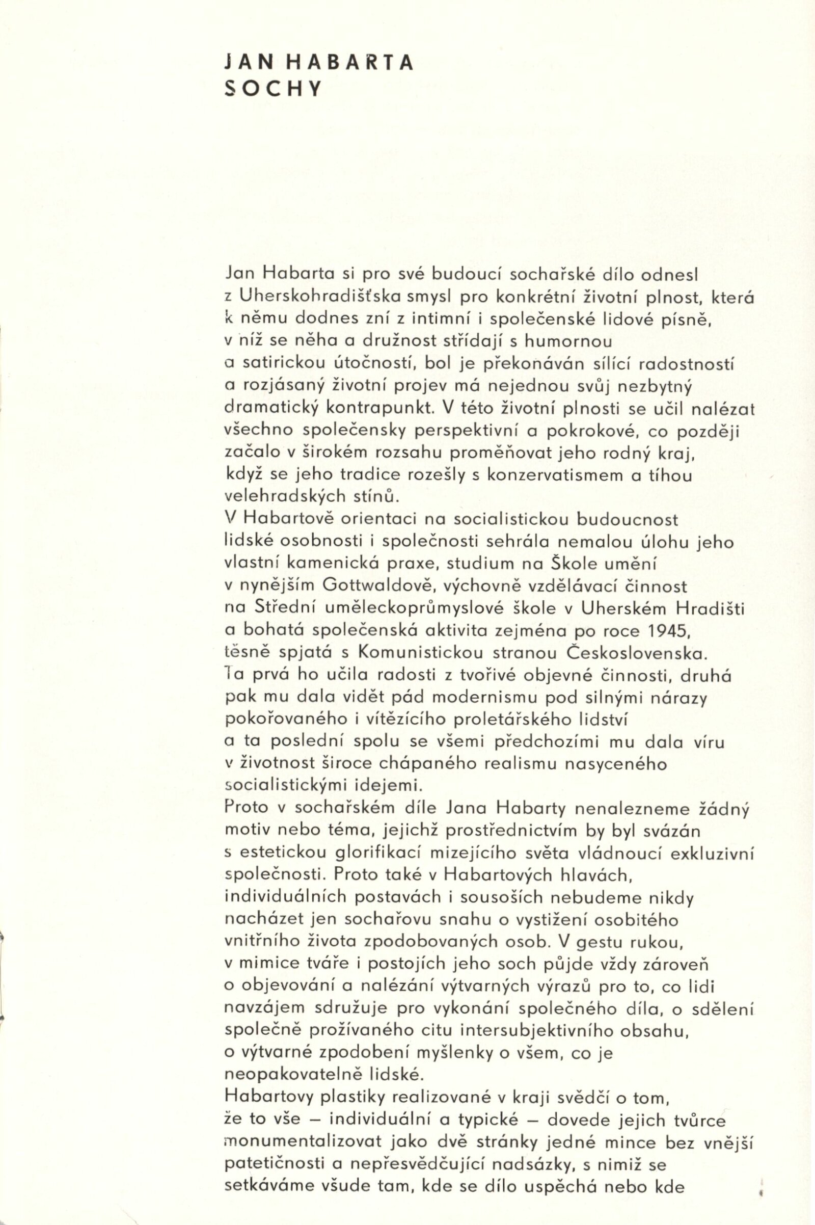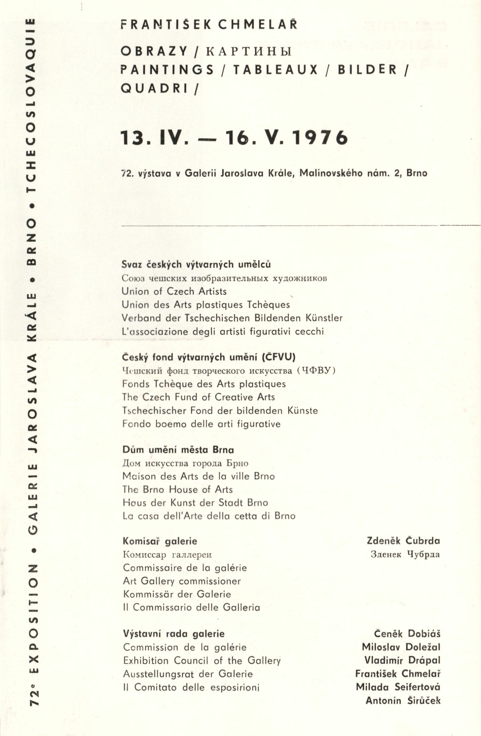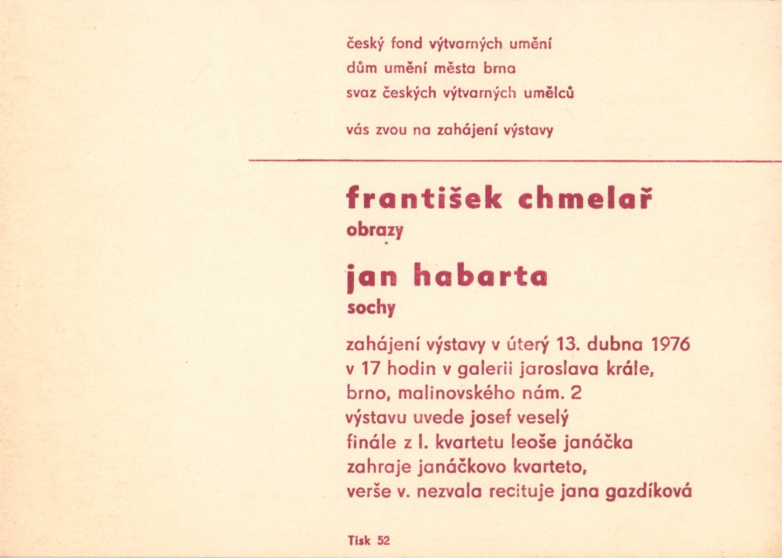 Jan Habarta. Sochy: Dům umění, 72. výstava v Galerii Jaroslava Krále, 13. 4. – 16. 5. 1976 / Text: Josef Veselý. – Brno: ČFVU, 1976. – 10 s., obr., seznam prací 2 s., portrét, životní data, monumentální výtvarné realizace, ceny, DU 637. – MZK; MG; MMB / František Chmelař. Obrazy: Dům umění, 72. výstava v Galerii Jaroslava Krále, 13. 4. – 16. 5. 1976 / Text: Josef Veselý. – Brno: ČFVU, 1976. – 10 s., obr., seznam vystavených prací 2 s., portrét, životní data, výstavy, ceny, DU 637. – MZK; MG; MMB