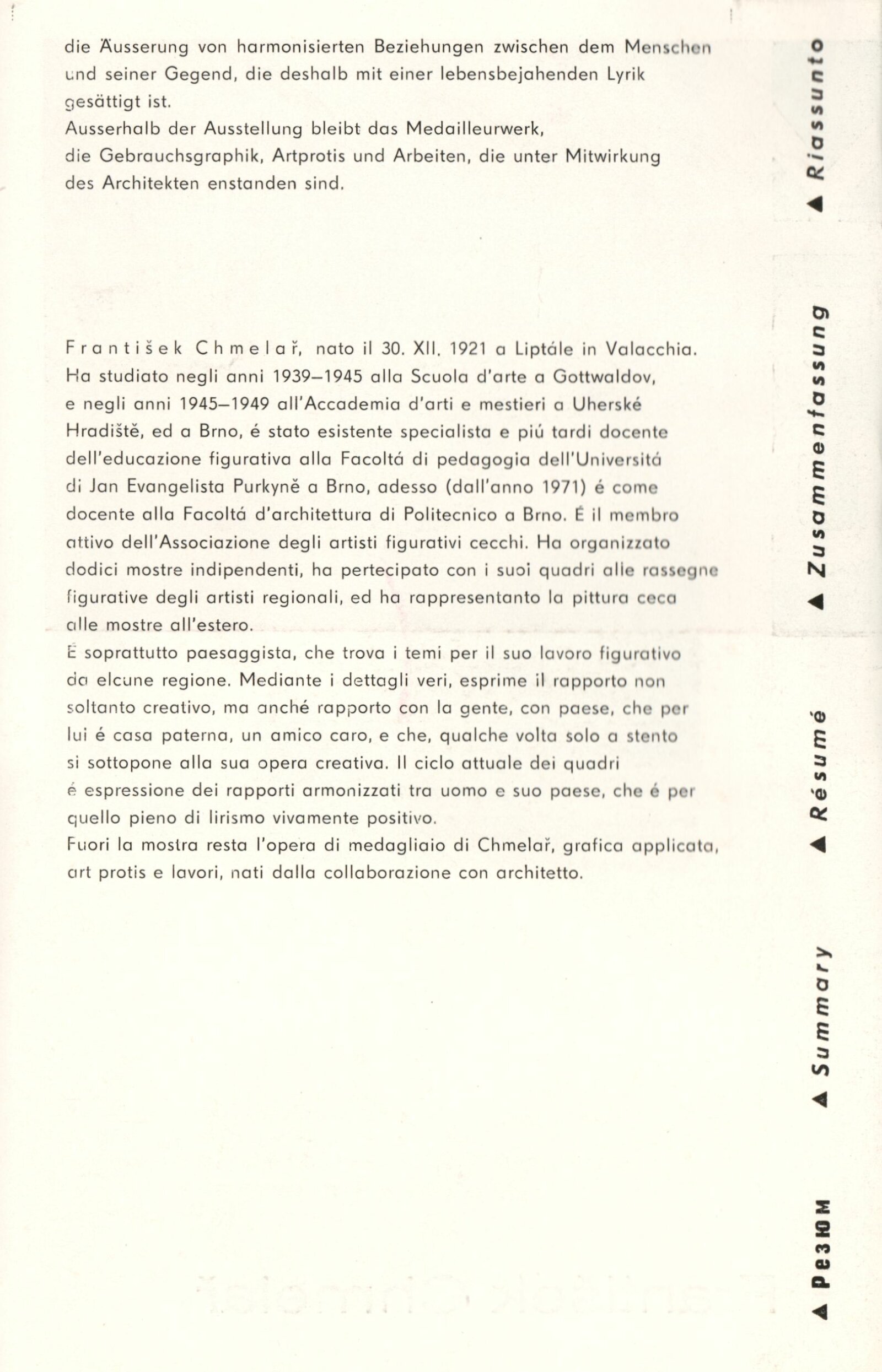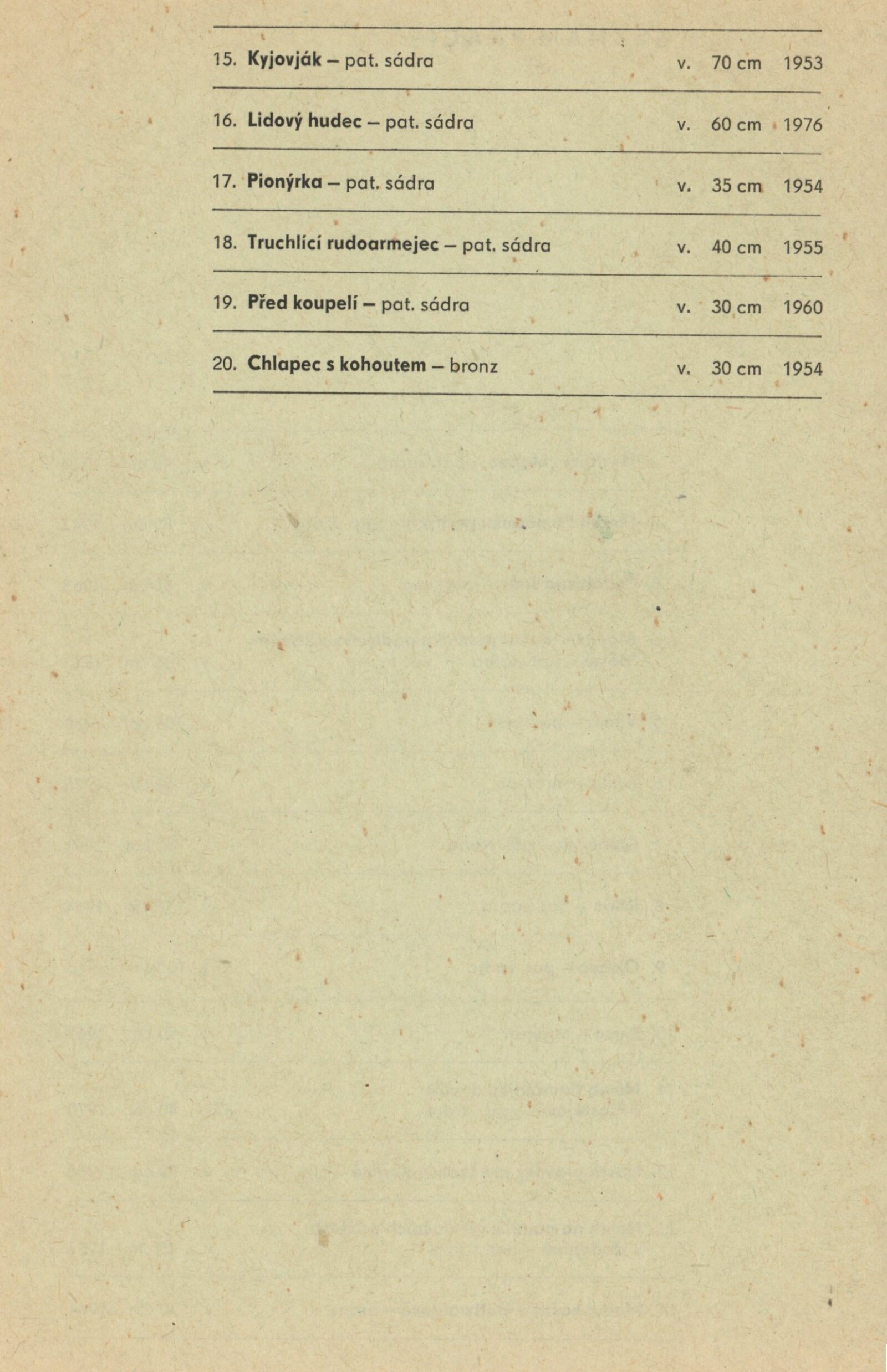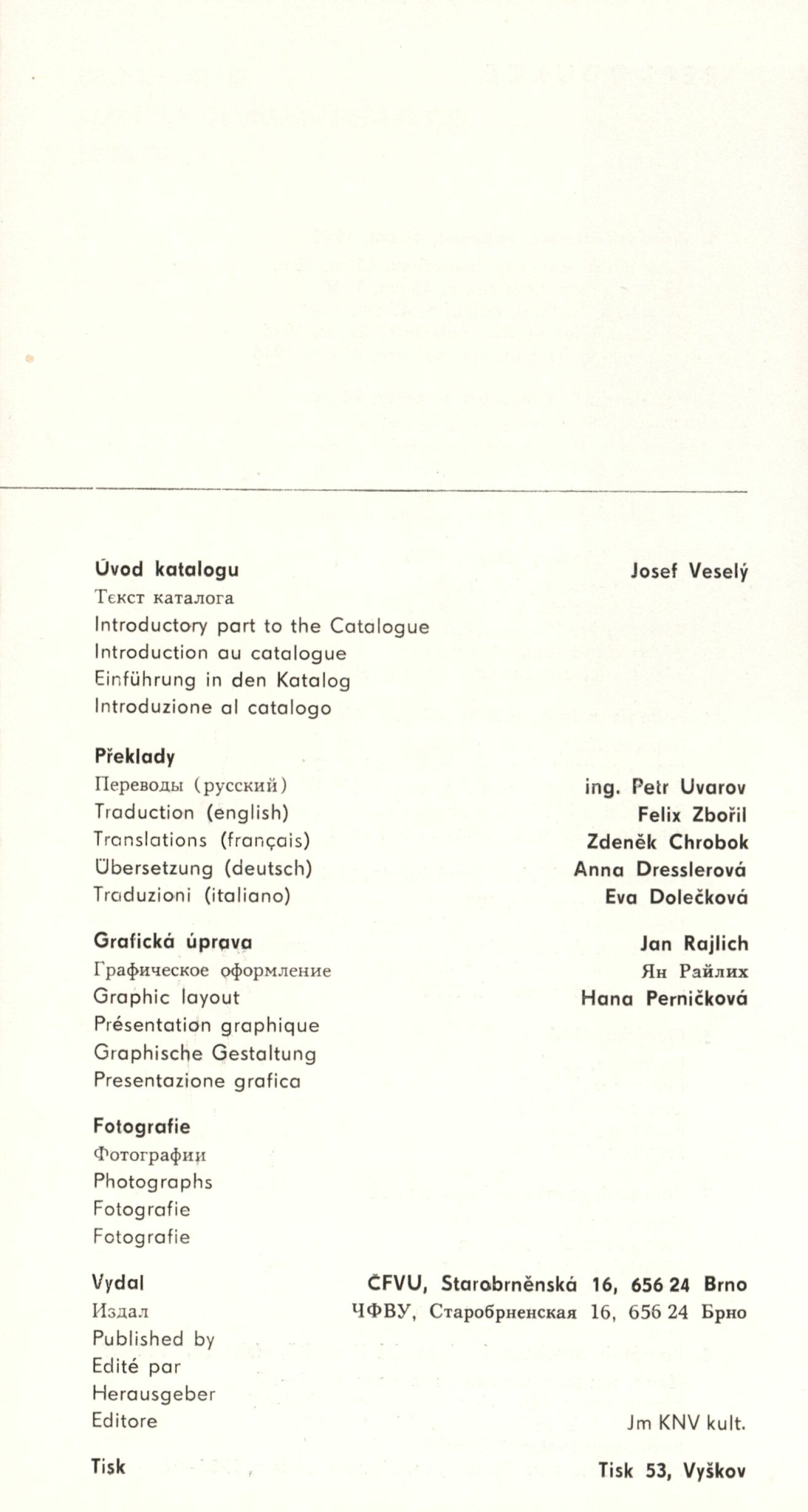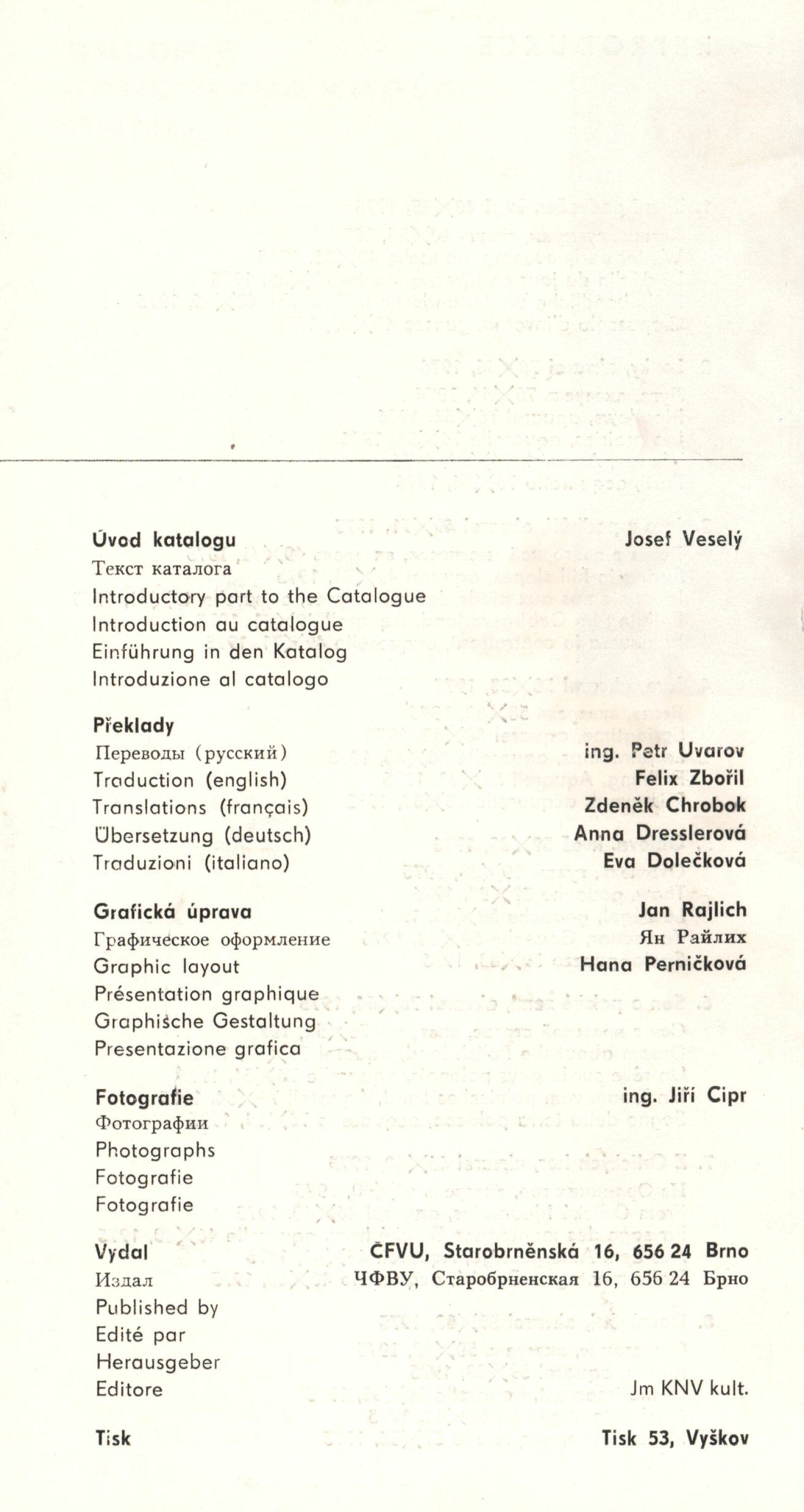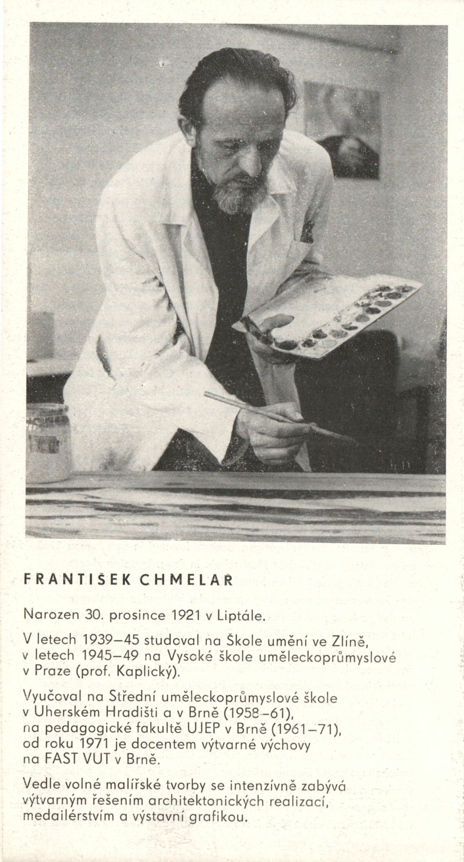Jan Habarta. Sochy: Dům umění, 72. výstava v Galerii Jaroslava Krále, 13. 4. – 16. 5. 1976 / Text: Josef Veselý. – Brno: ČFVU, 1976. – 10 s., obr., seznam prací 2 s., portrét, životní data, monumentální výtvarné realizace, ceny, DU 637. – MZK; MG; MMB / František Chmelař. Obrazy: Dům umění, 72. výstava v Galerii Jaroslava Krále, 13. 4. – 16. 5. 1976 / Text: Josef Veselý. – Brno: ČFVU, 1976. – 10 s., obr., seznam vystavených prací 2 s., portrét, životní data, výstavy, ceny, DU 637. – MZK; MG; MMB