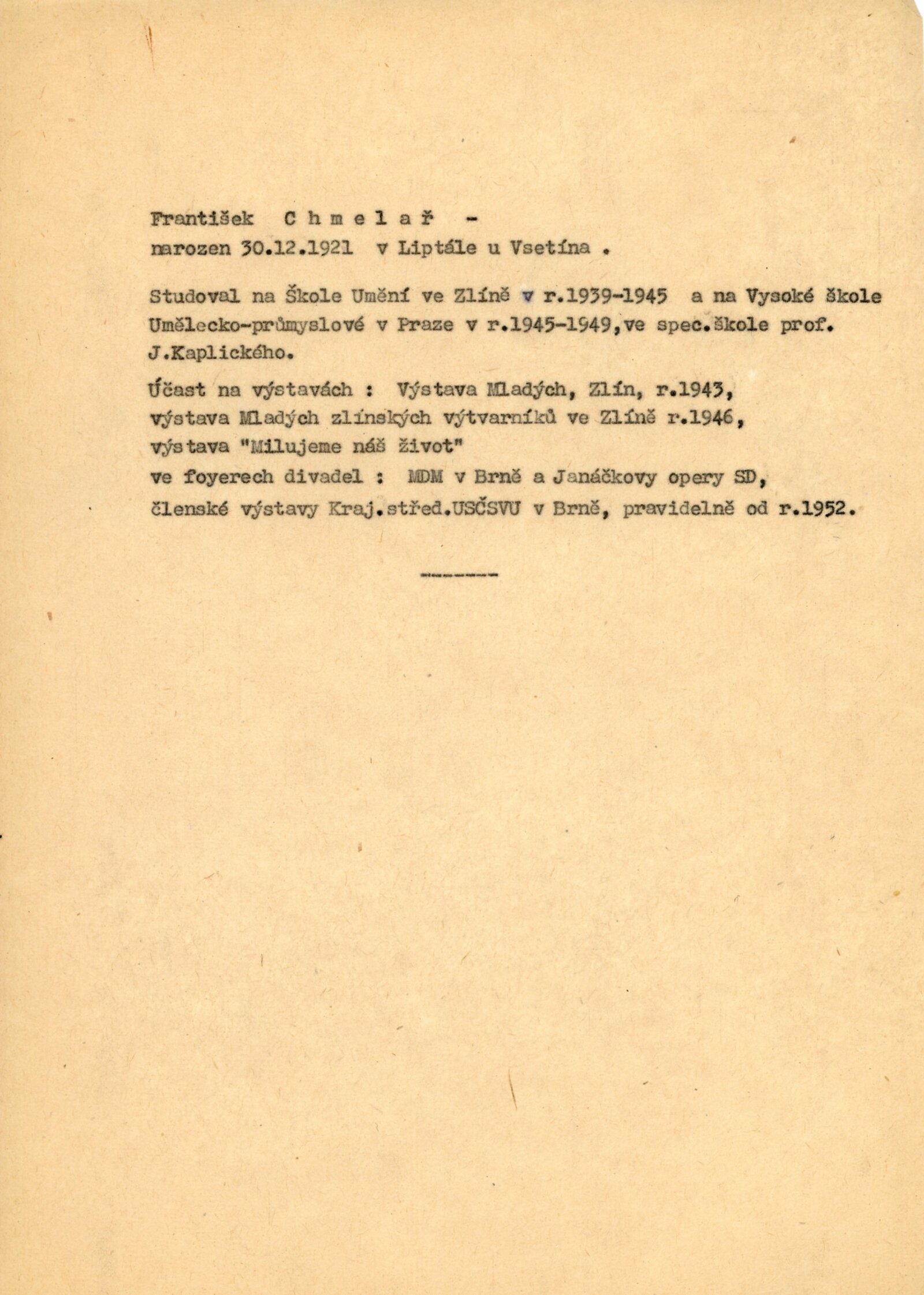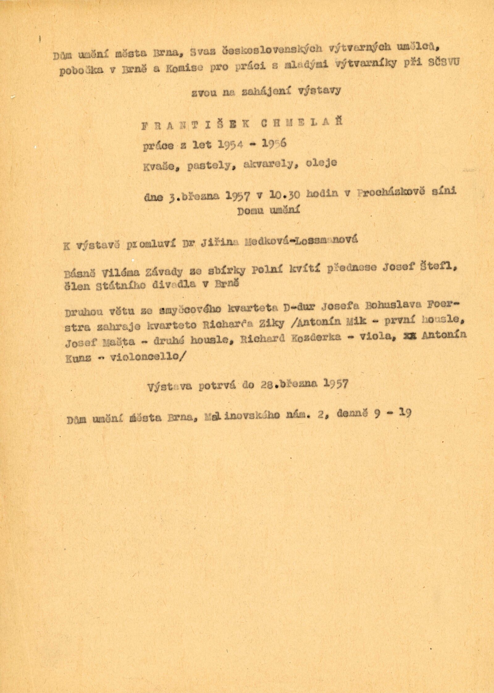 František Chmelař. Výstava prací z let 1954–1956: Dům umění města Brna, Malá galerie, 3. 3. – 28. 3. 1957 / Text: Jiřina Medková-Lossmannová. – Brno: DUmB, 1957. – 4 s., obr., životní data, DU 277. – MZK; MG; AMB; MMB